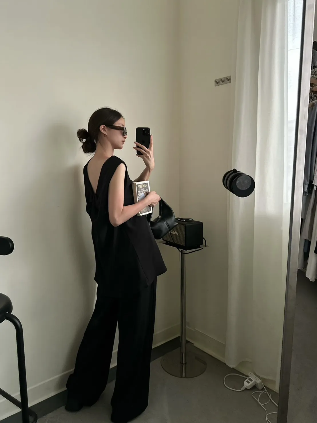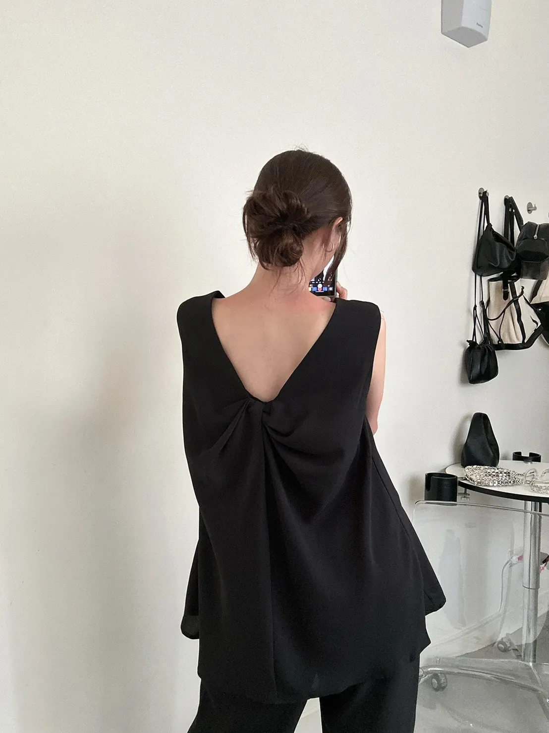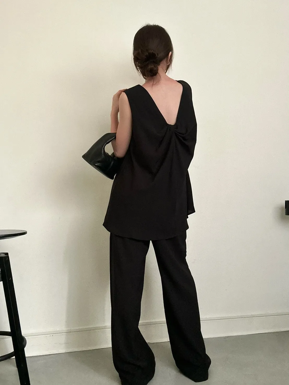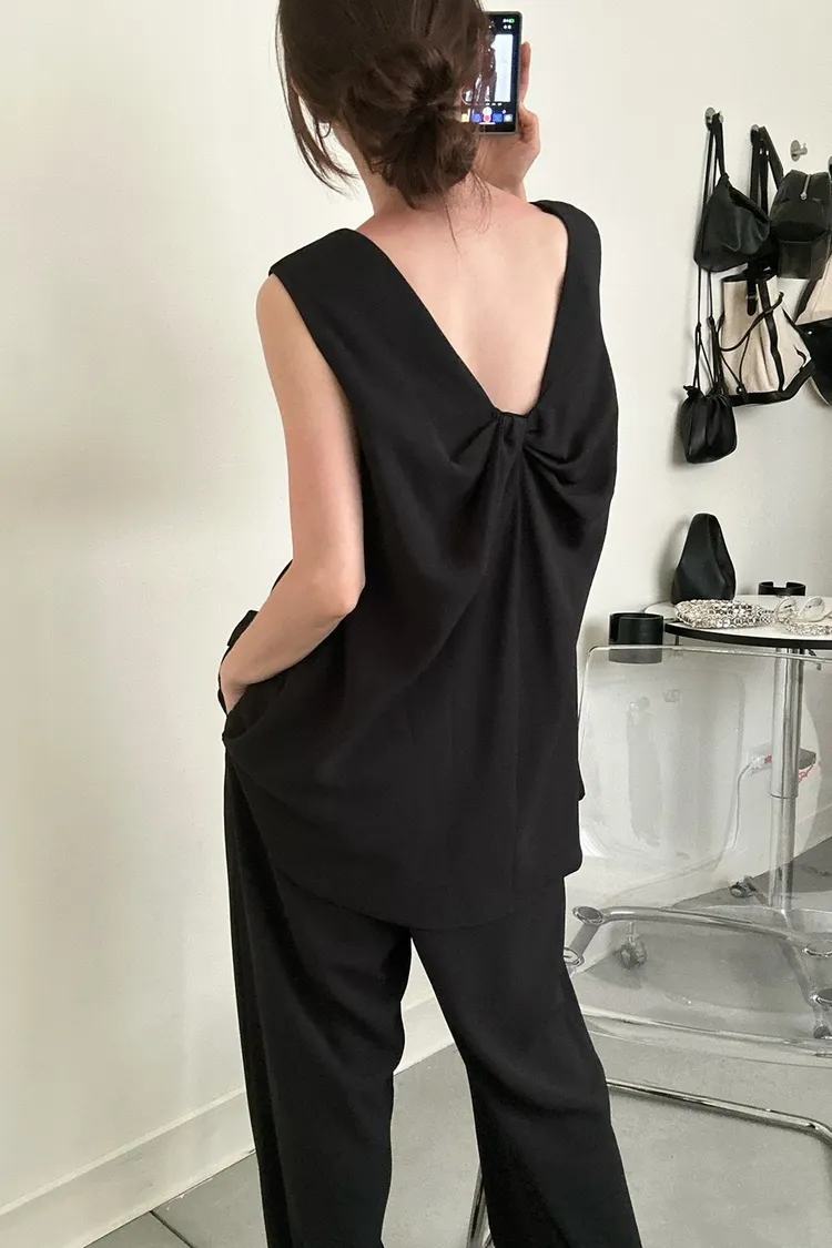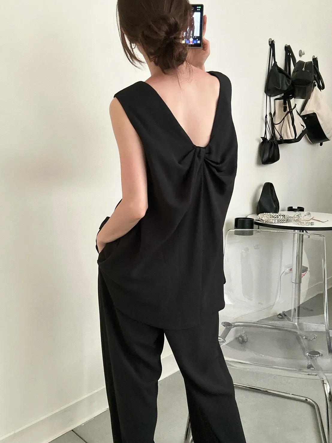(現貨)黑色 極美自留!高磅雪紡紗後扭背心+長褲SET