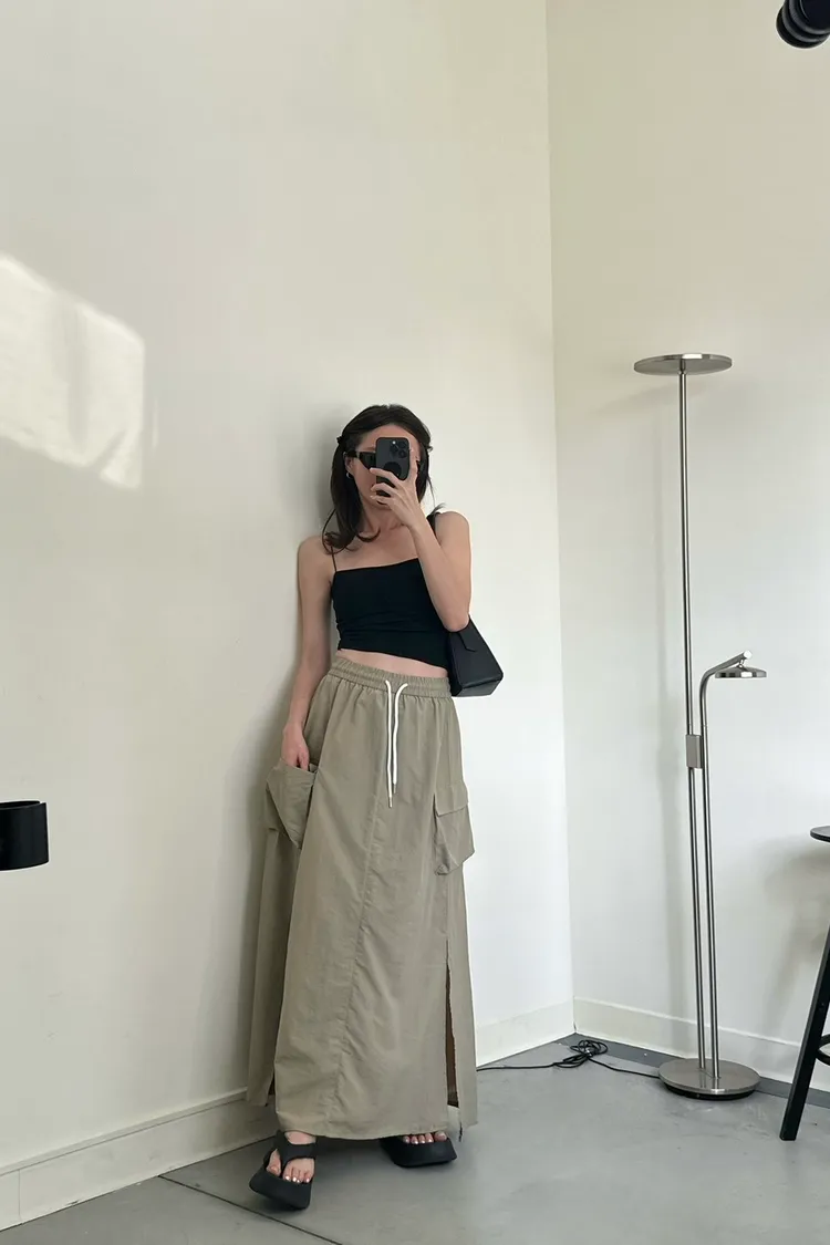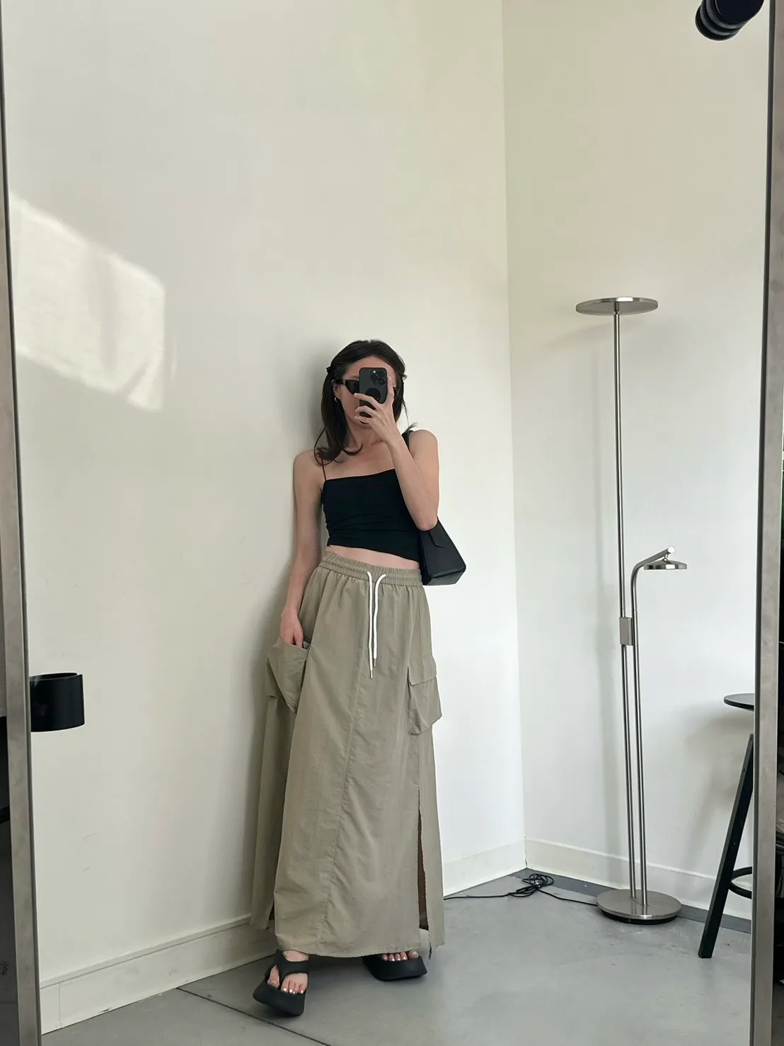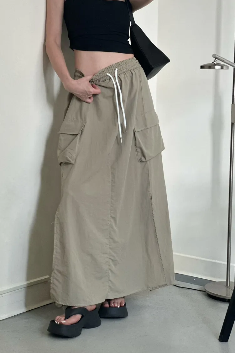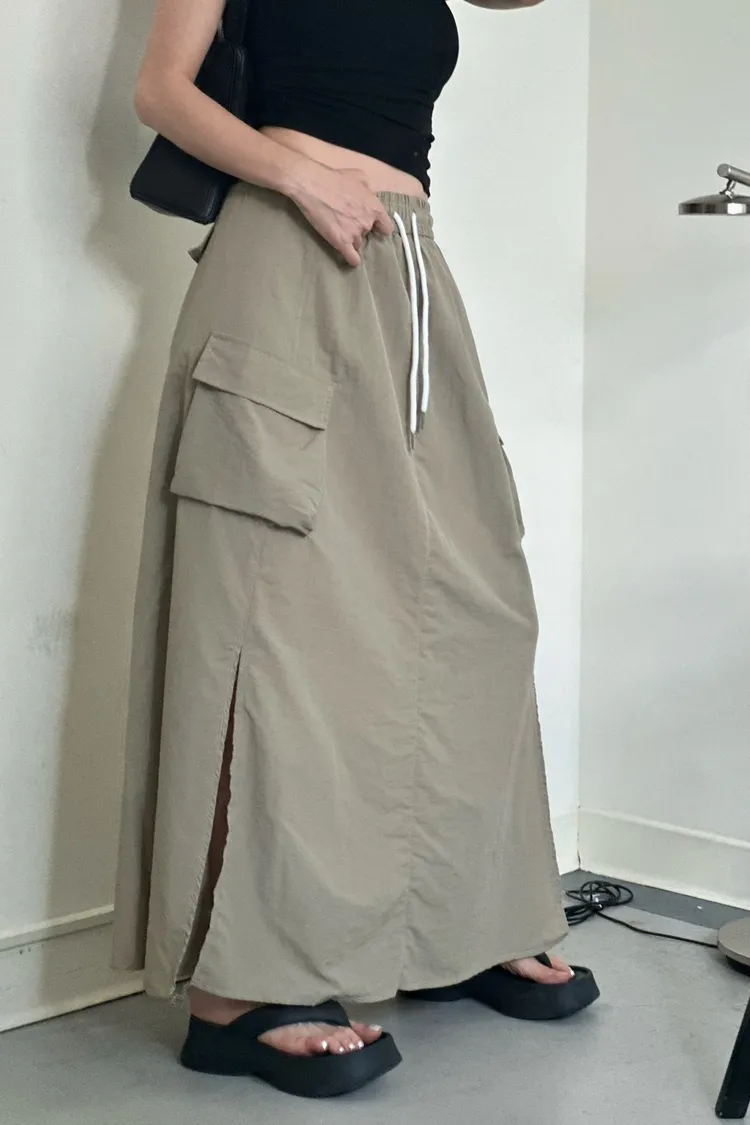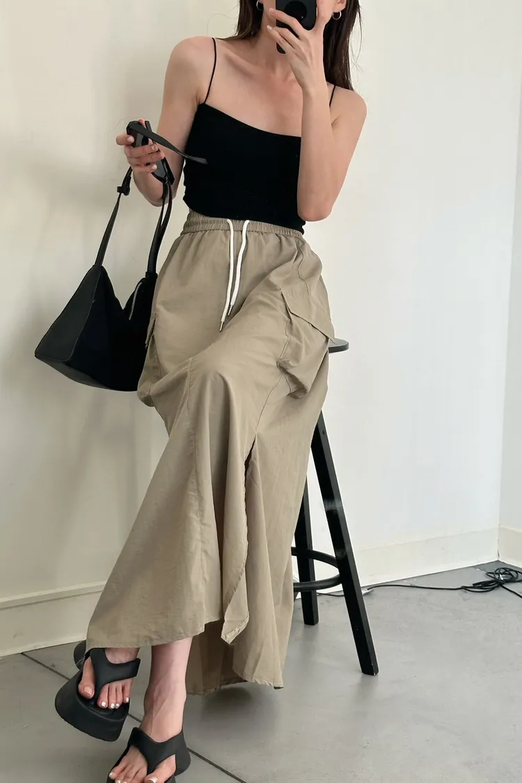 卡其色 主推自留!側開岔抽繩刷刷裙