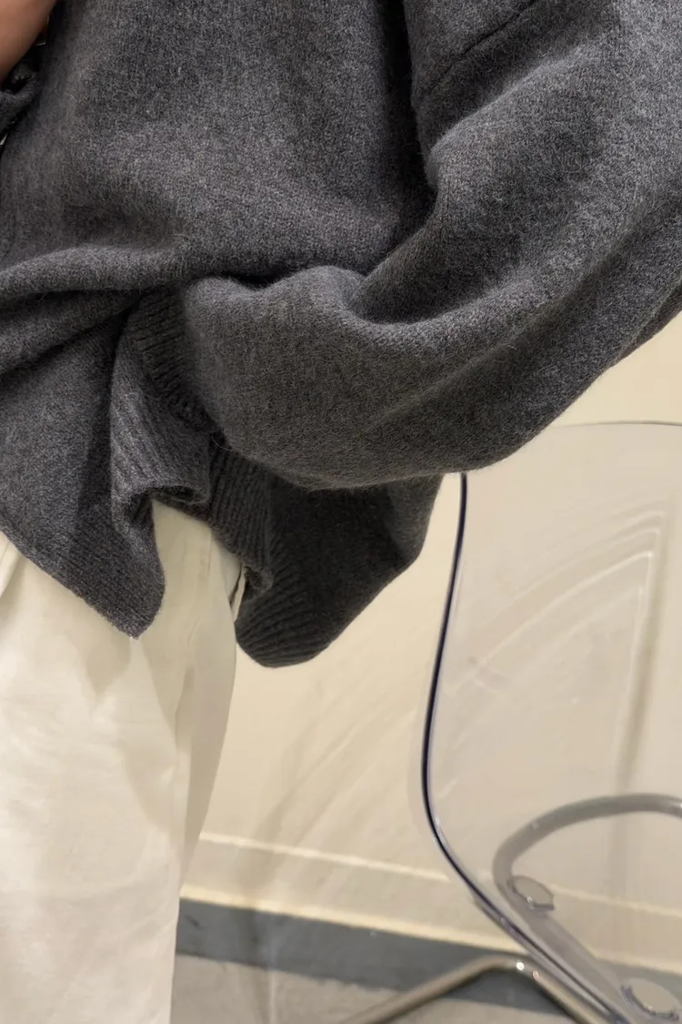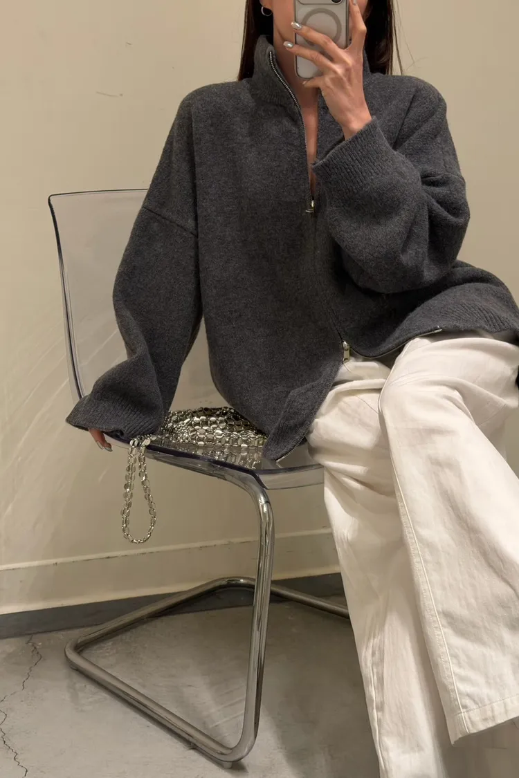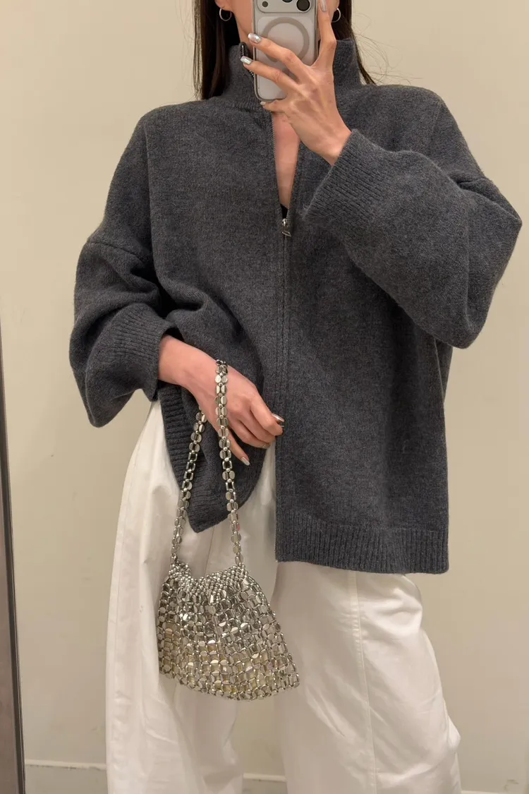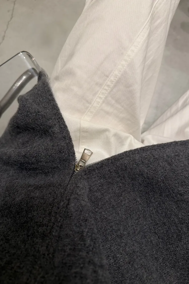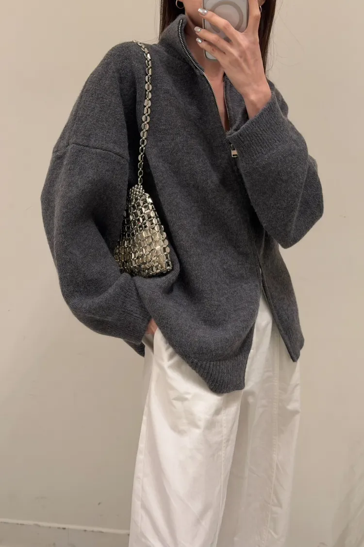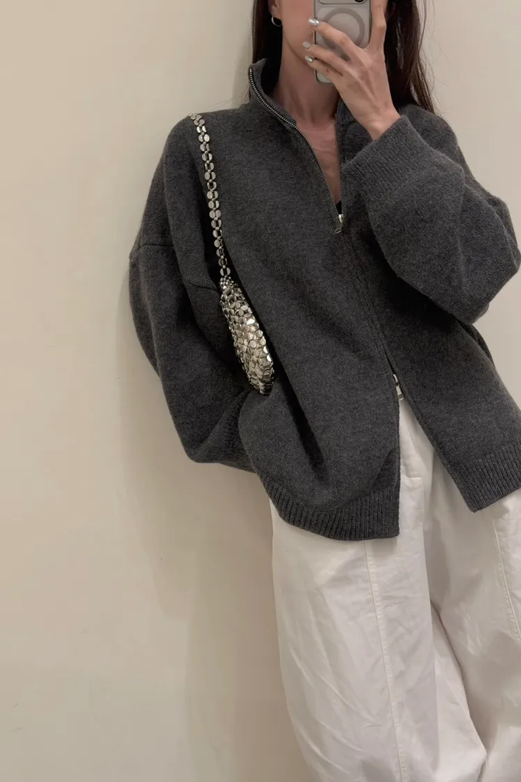 花灰色 極美!雙向拉鍊高磅針織外套