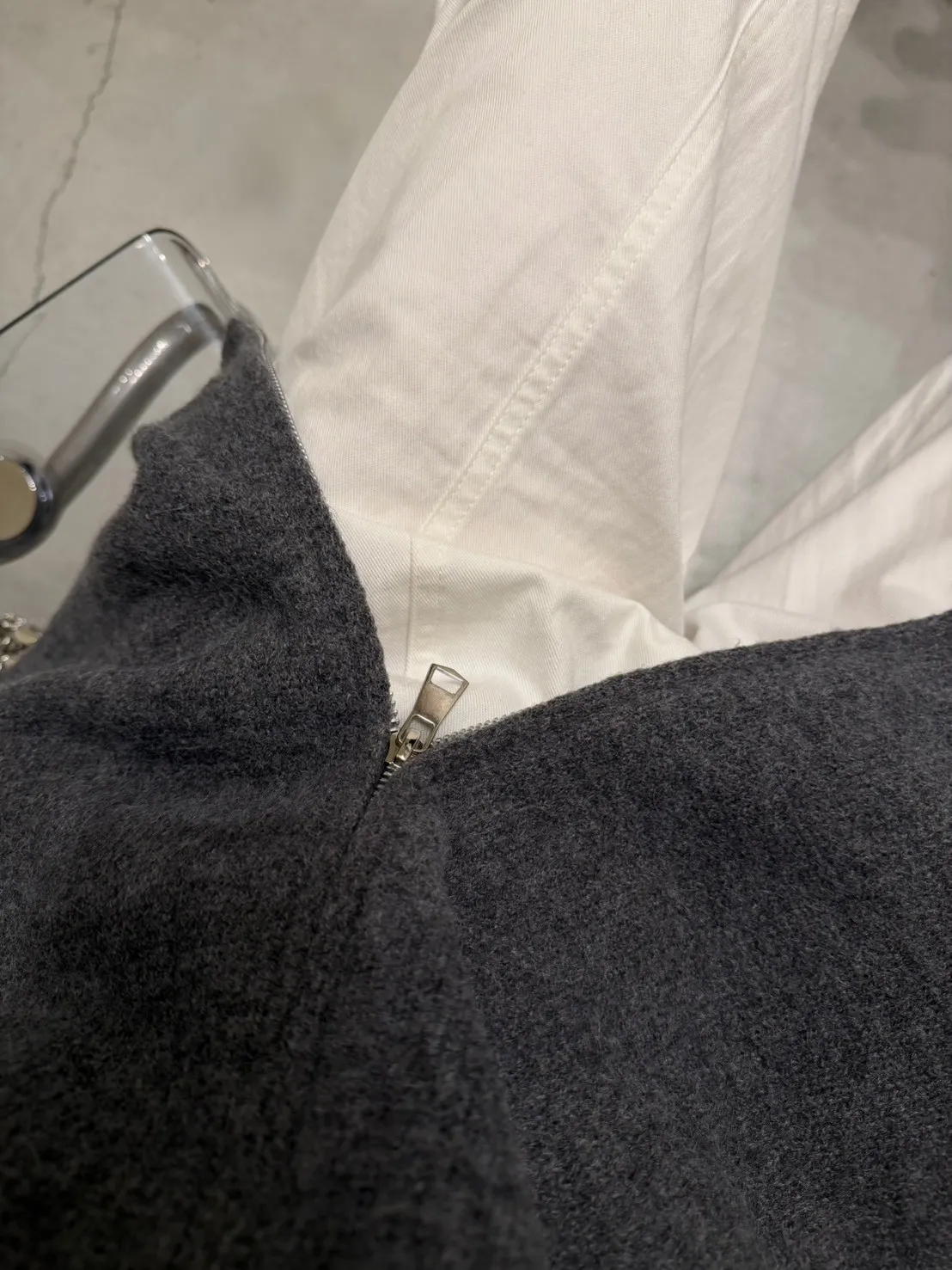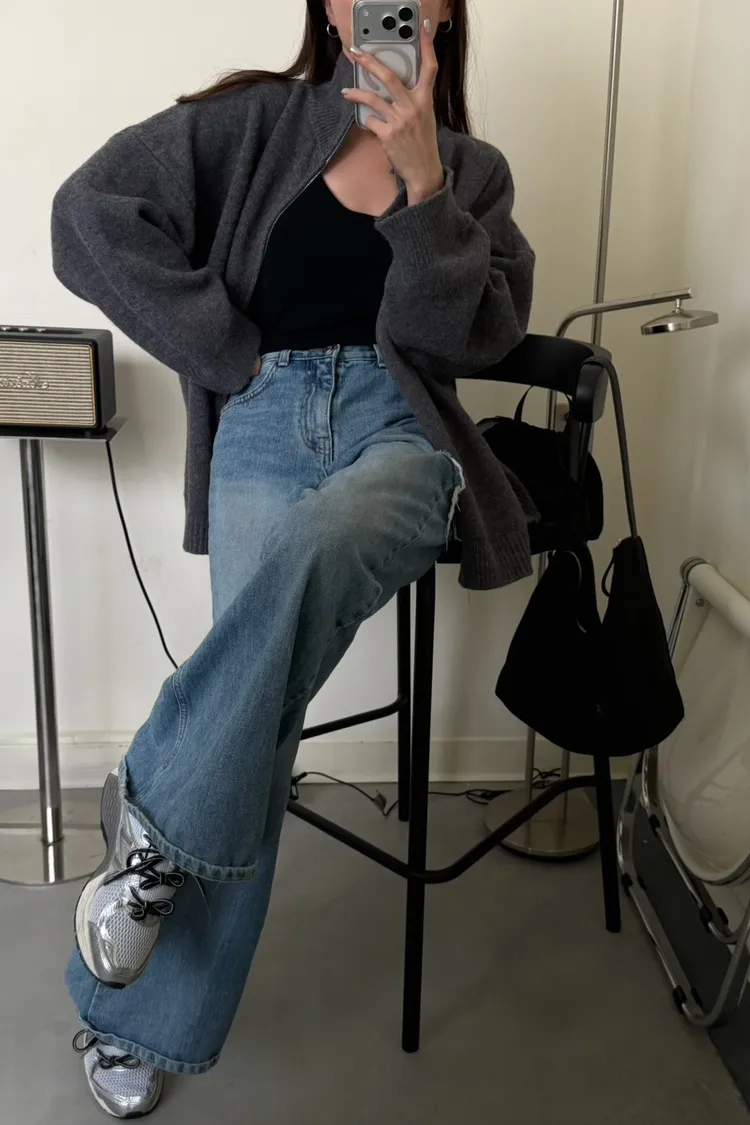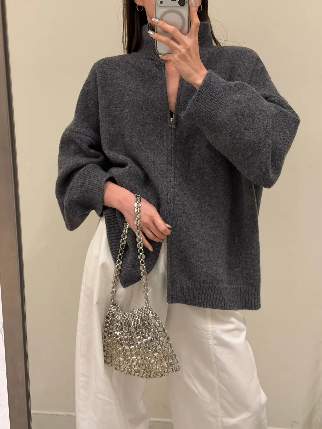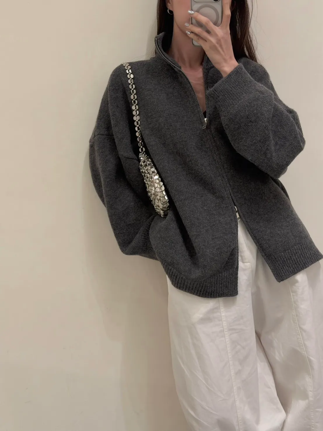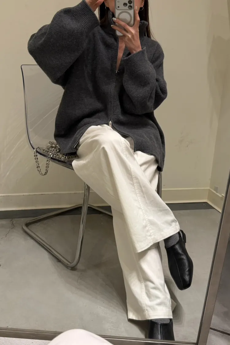 花灰色 極美!雙向拉鍊高磅針織外套