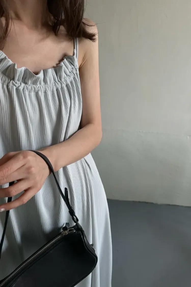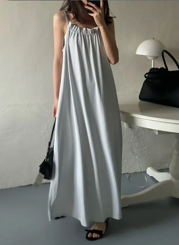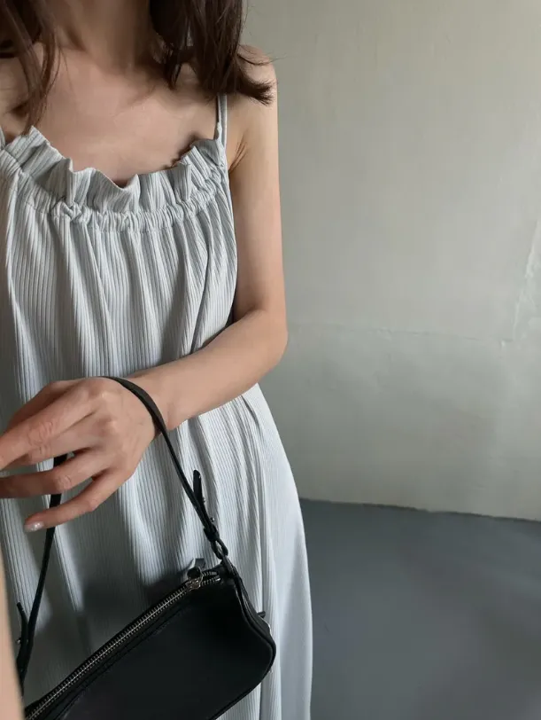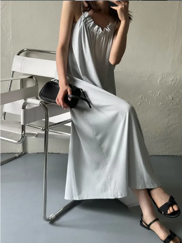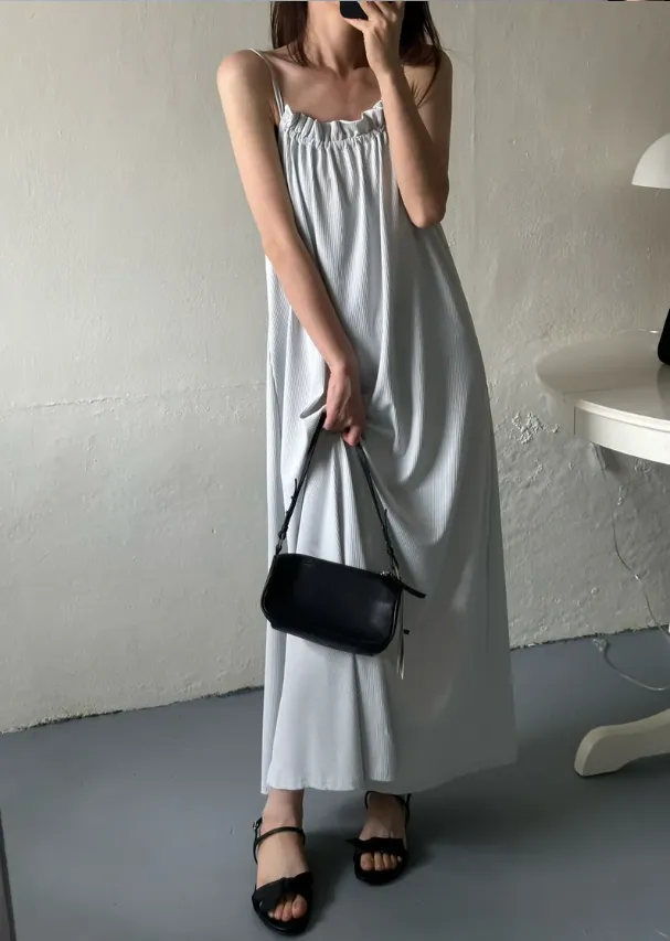 (現貨)(best!)淺灰色 極美領抓皺細肩坑紋洋裝
