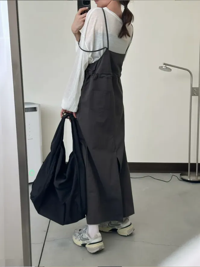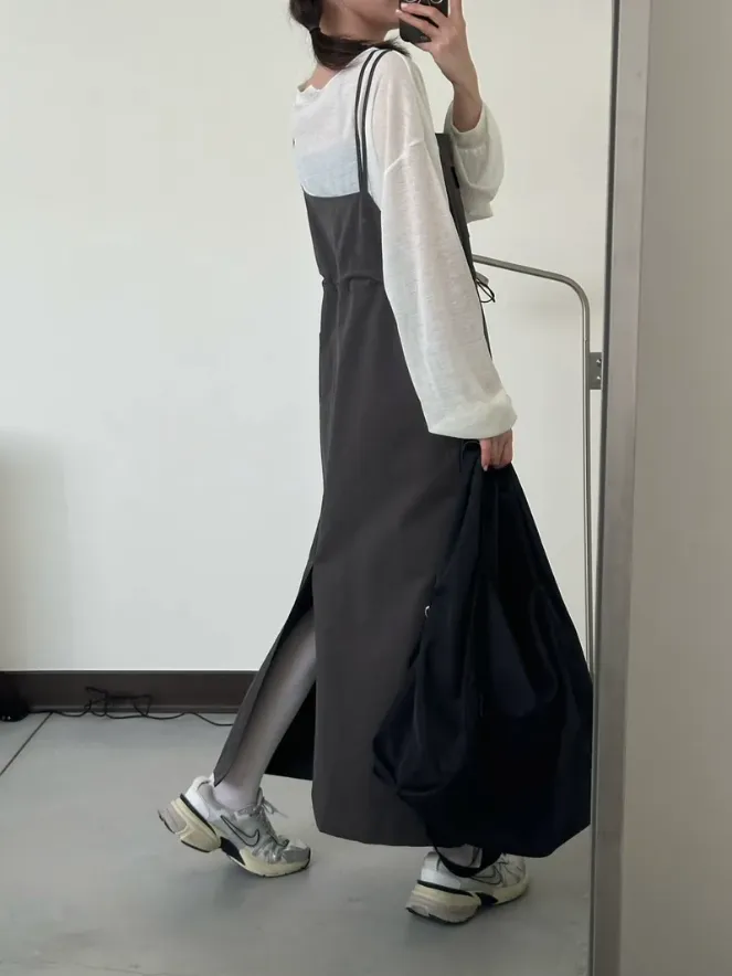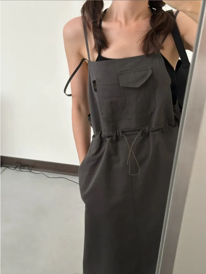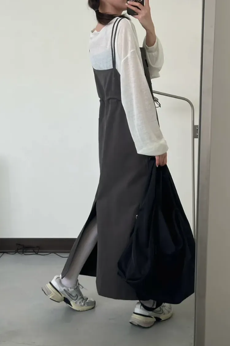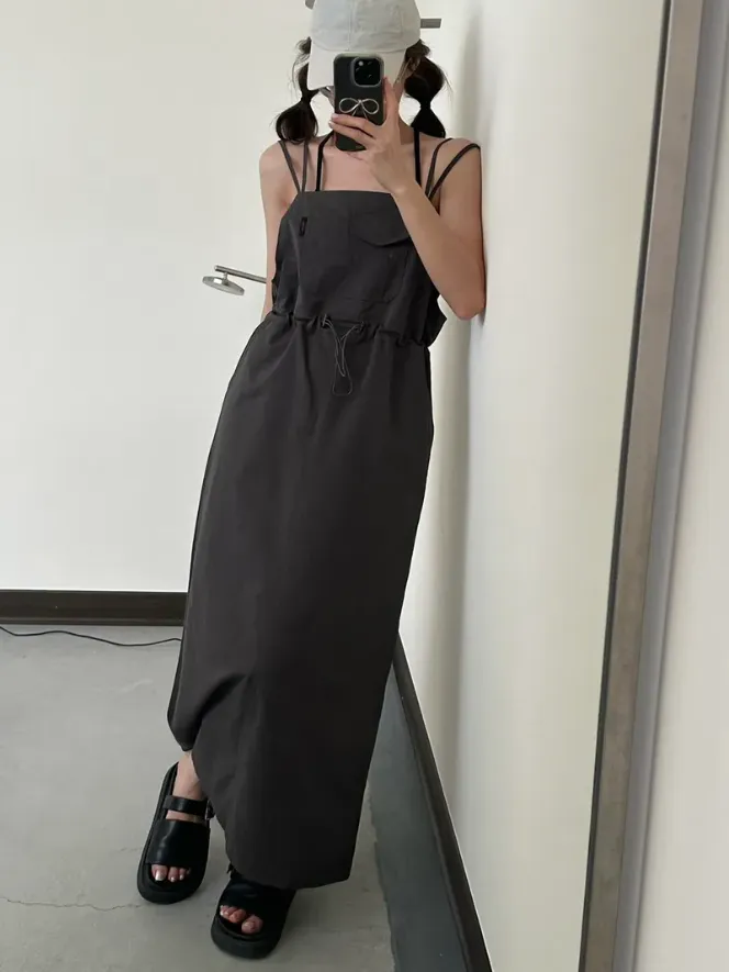 (現貨)灰色 雙肩帶腰抽繩洋裝