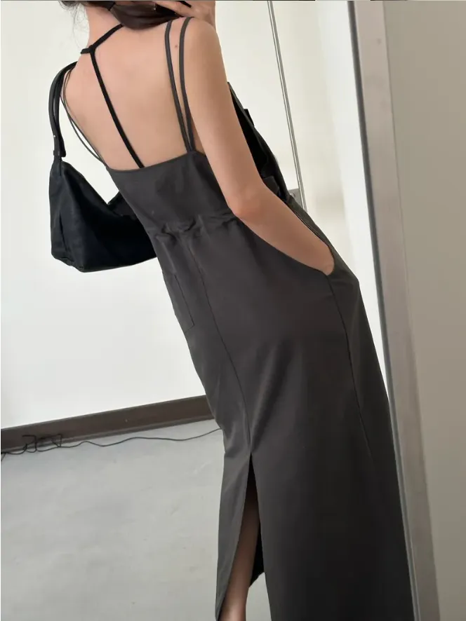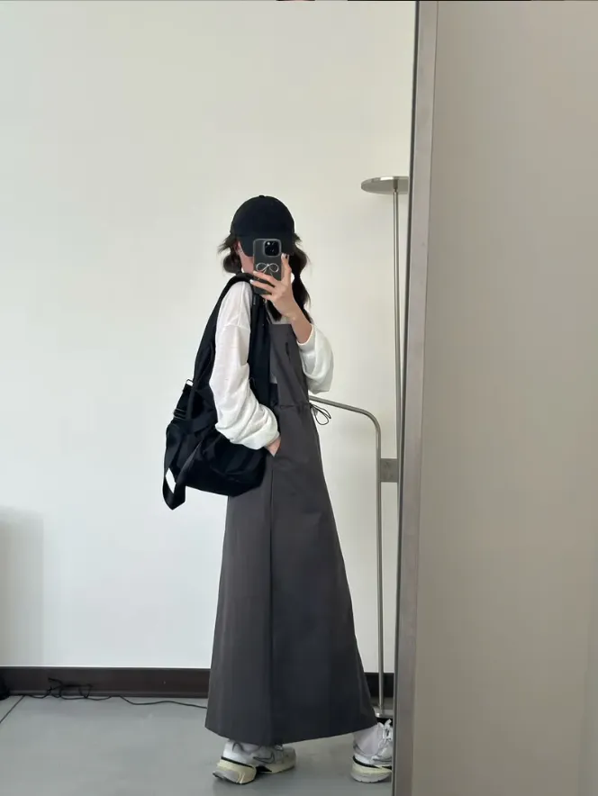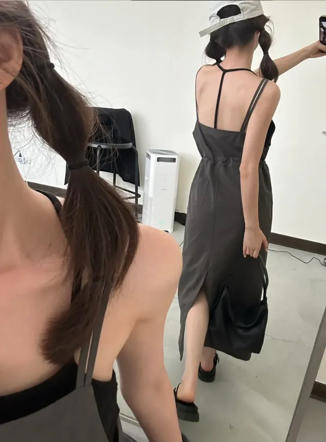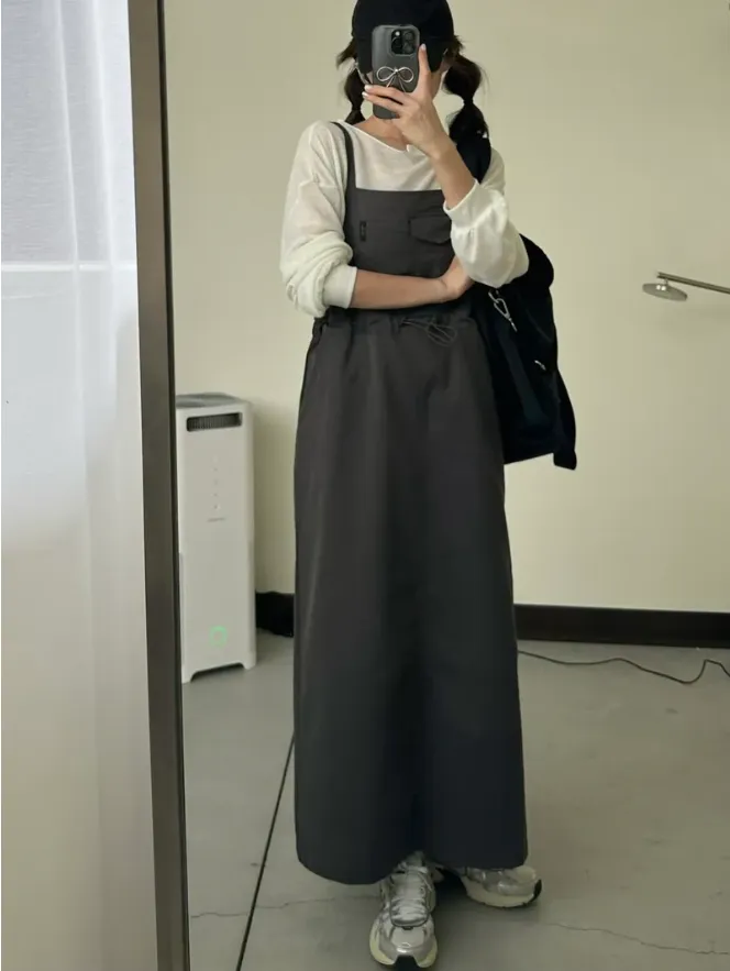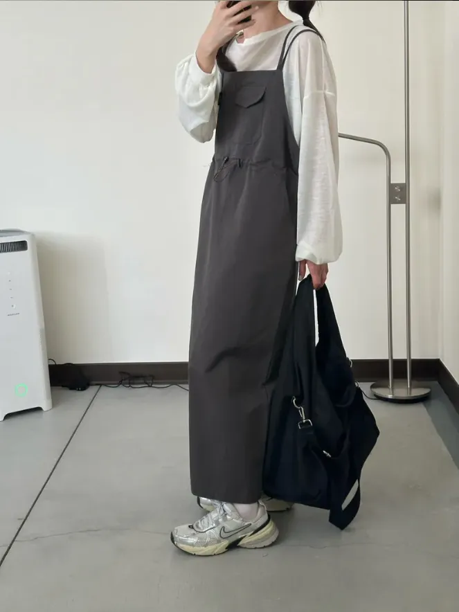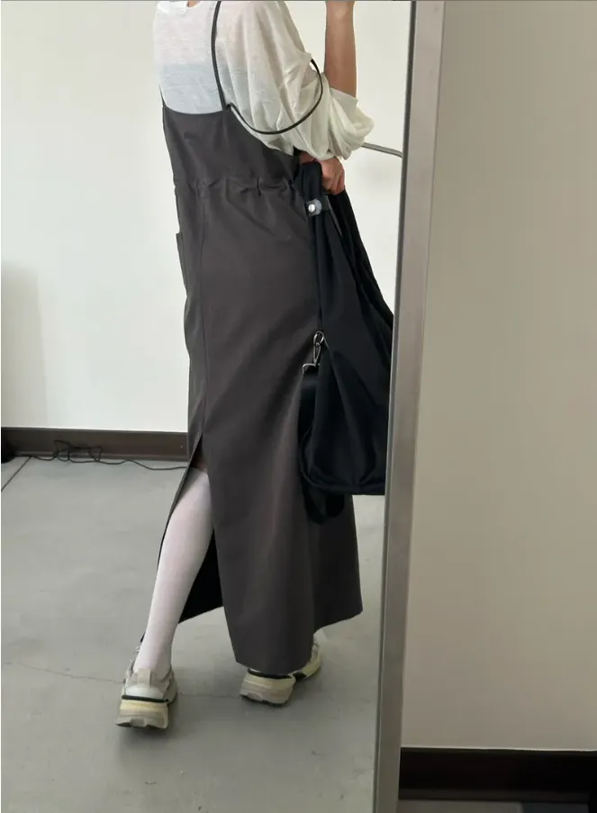 (現貨)灰色 雙肩帶腰抽繩洋裝