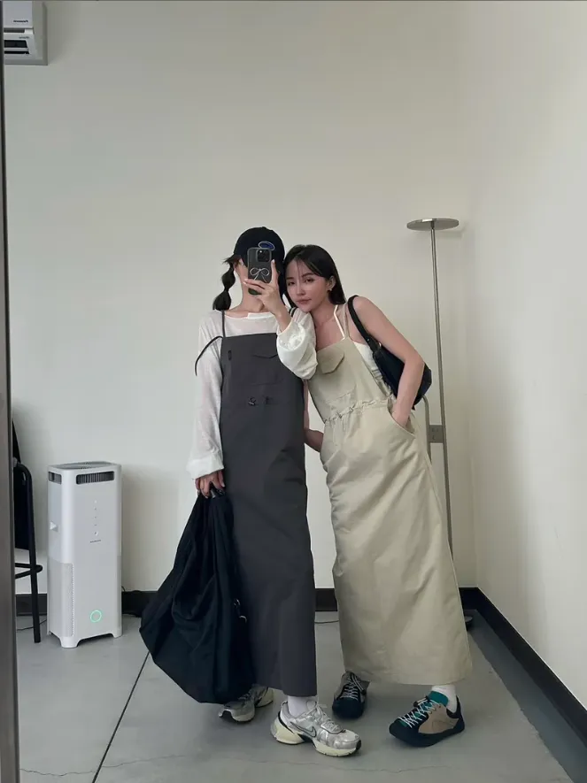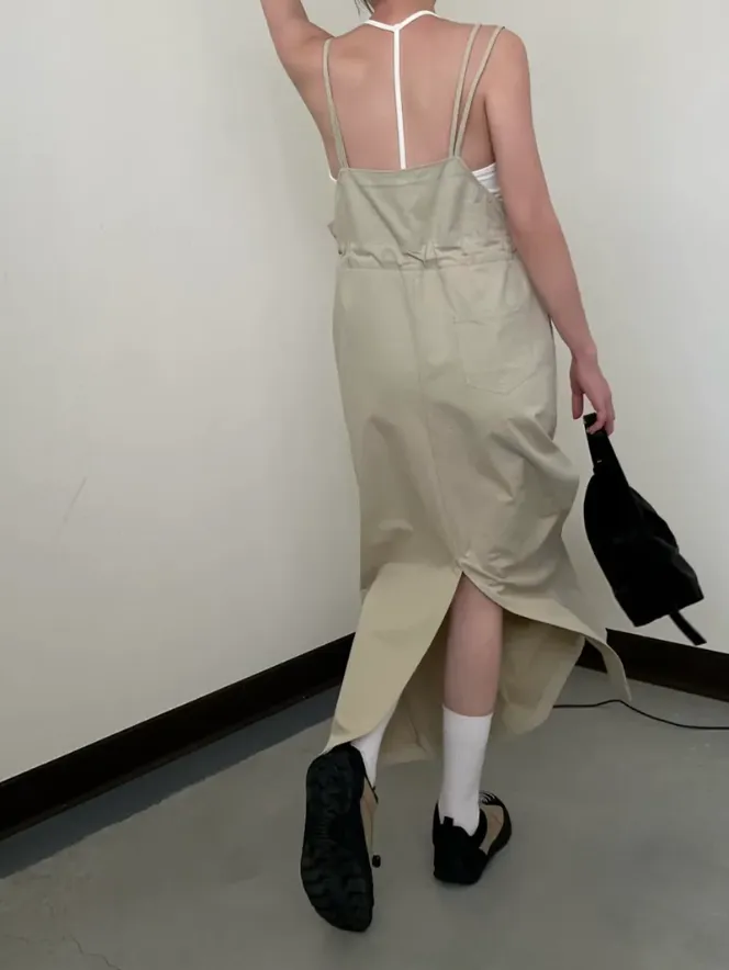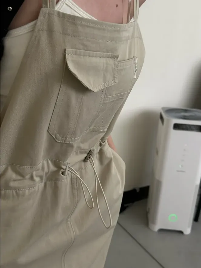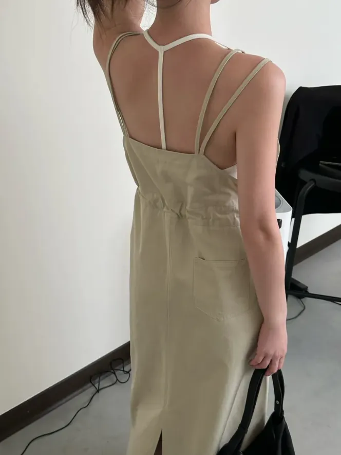 (現貨)杏色 雙肩帶腰抽繩洋裝