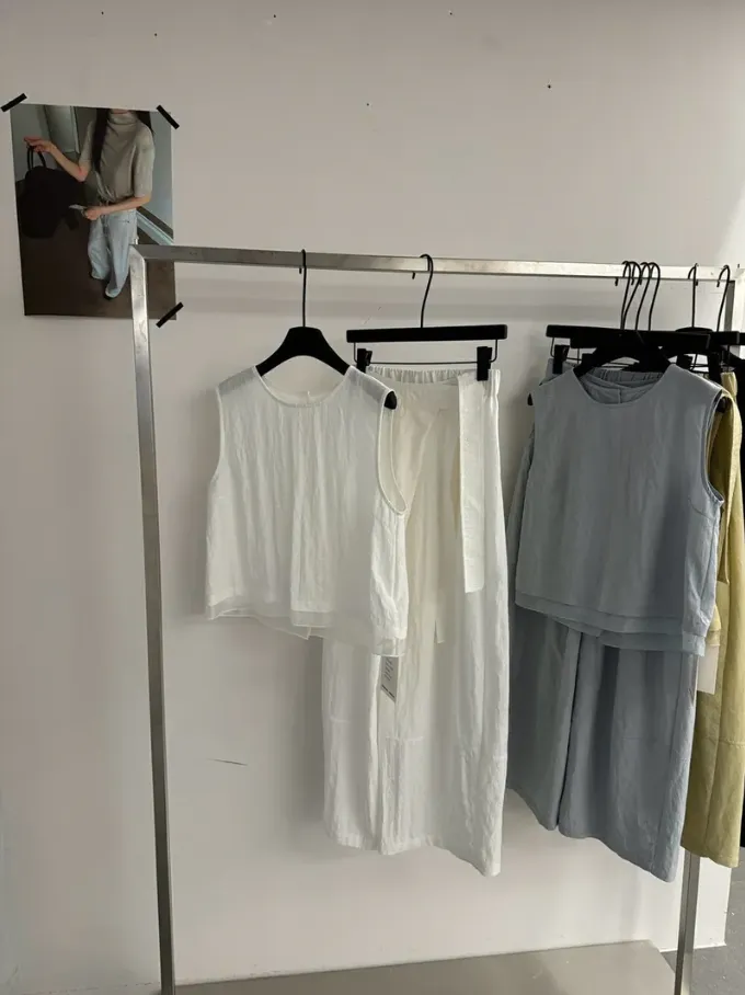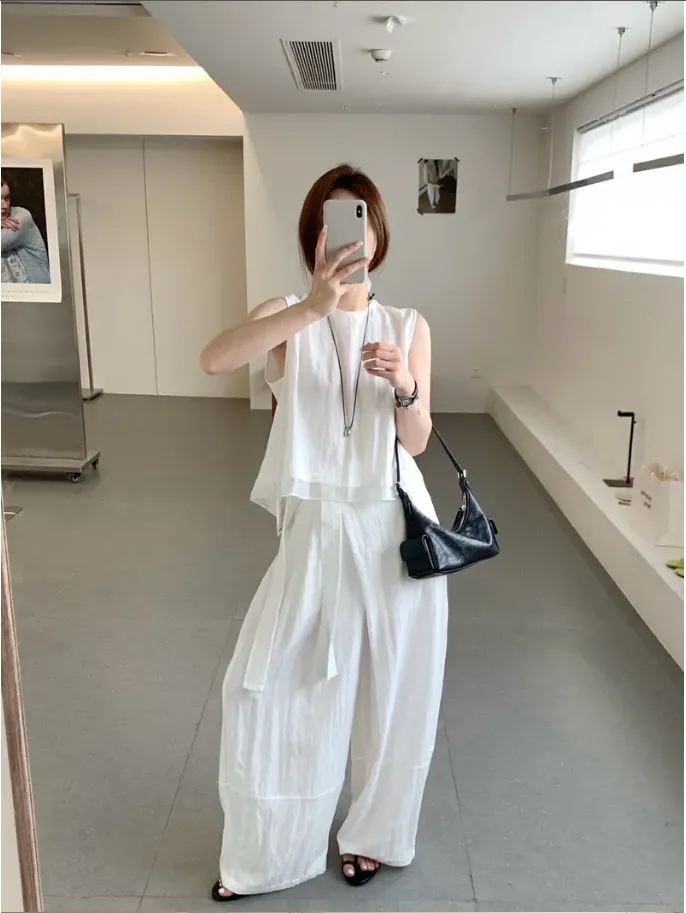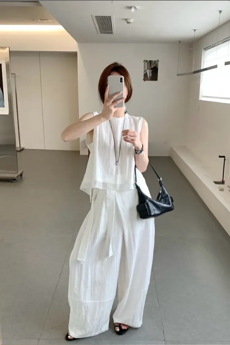 S/S (現貨)白色 涼感下雙層透紗背心+褲子SET