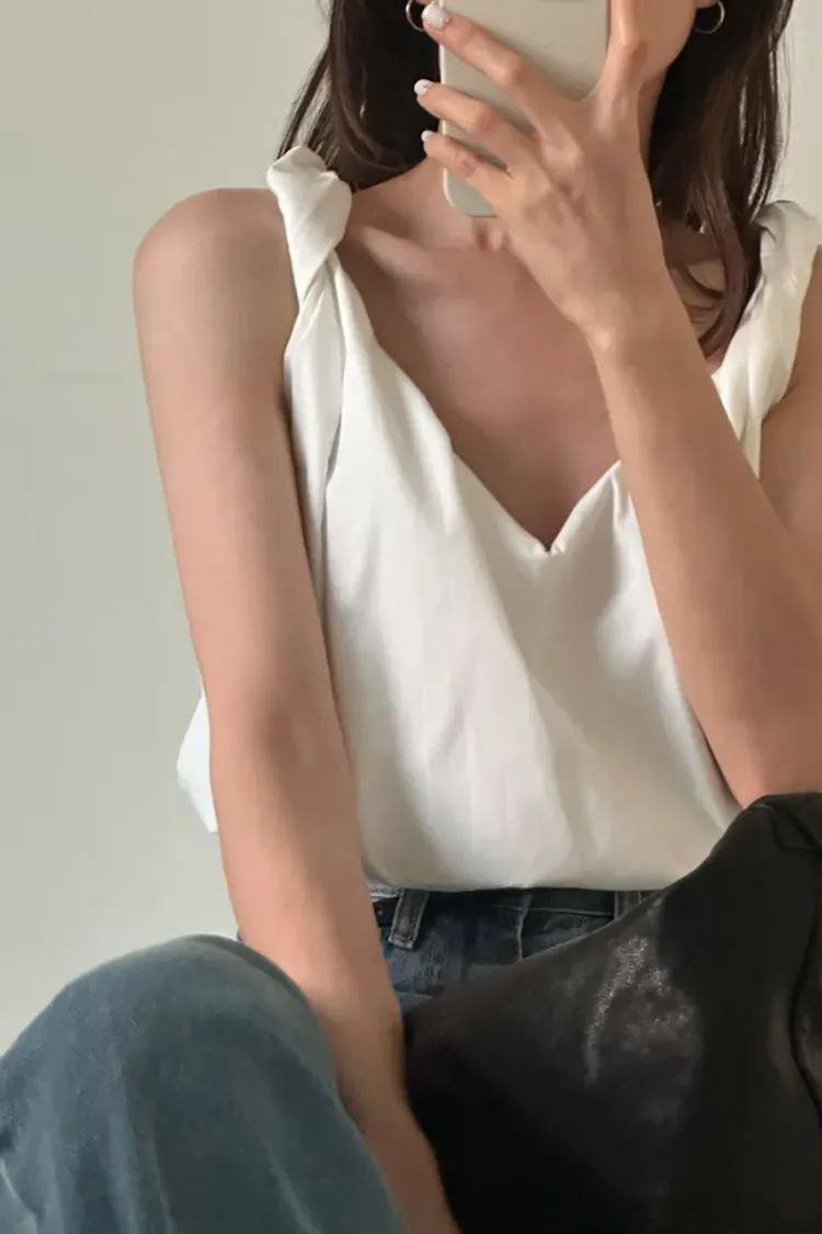 (現貨)白色 肩扭結雲朵背心