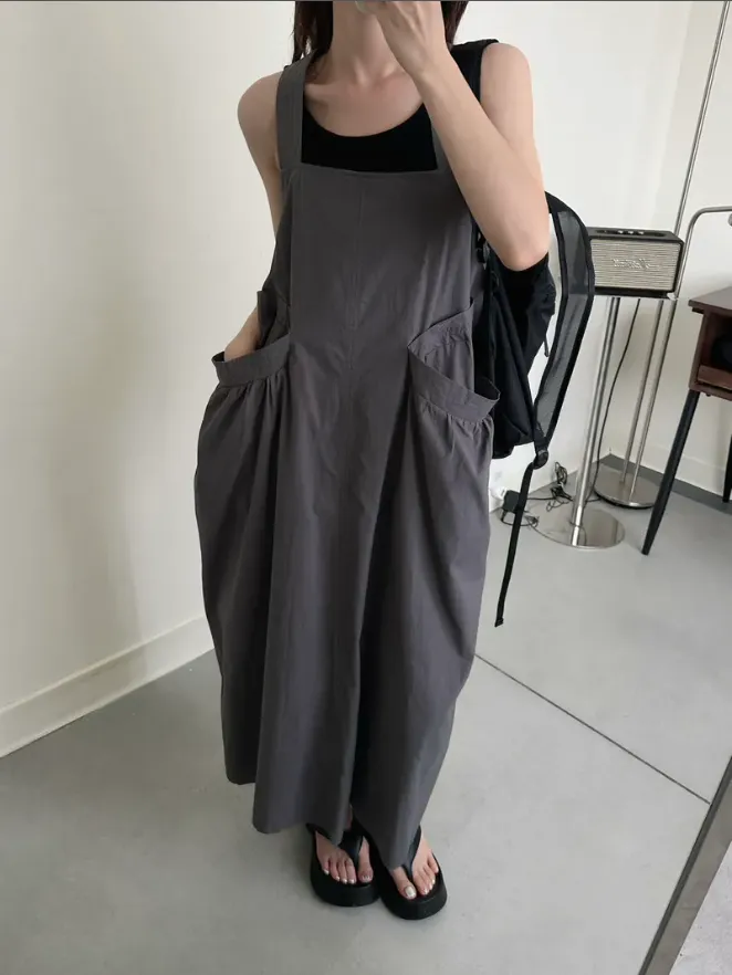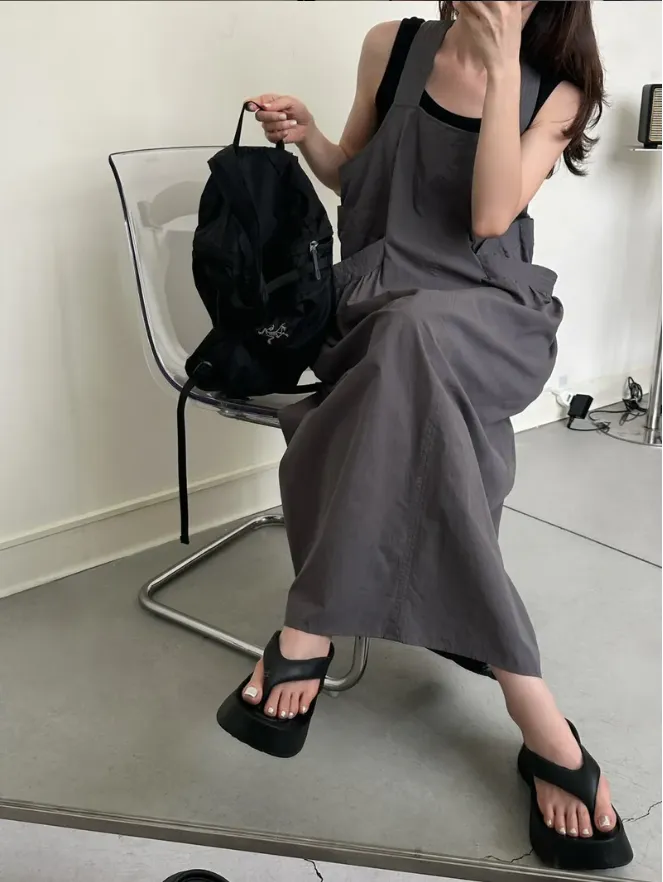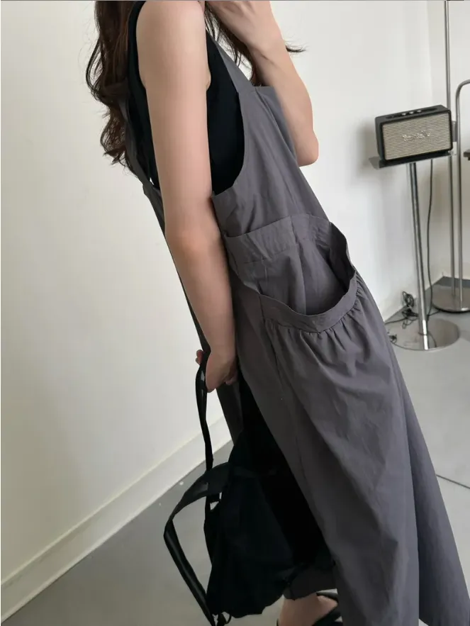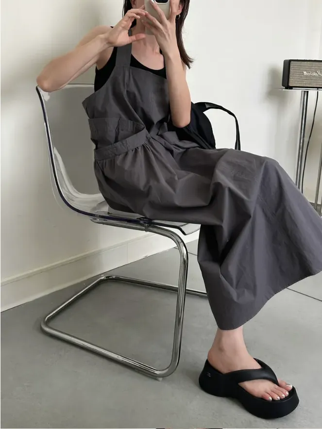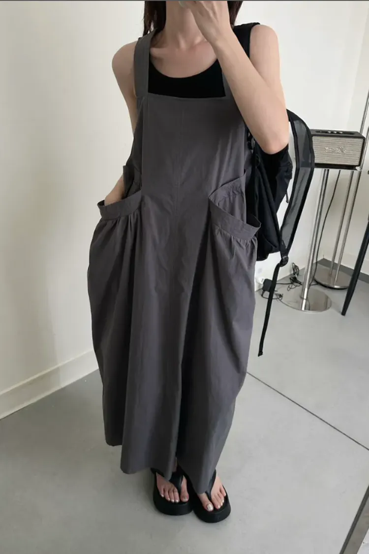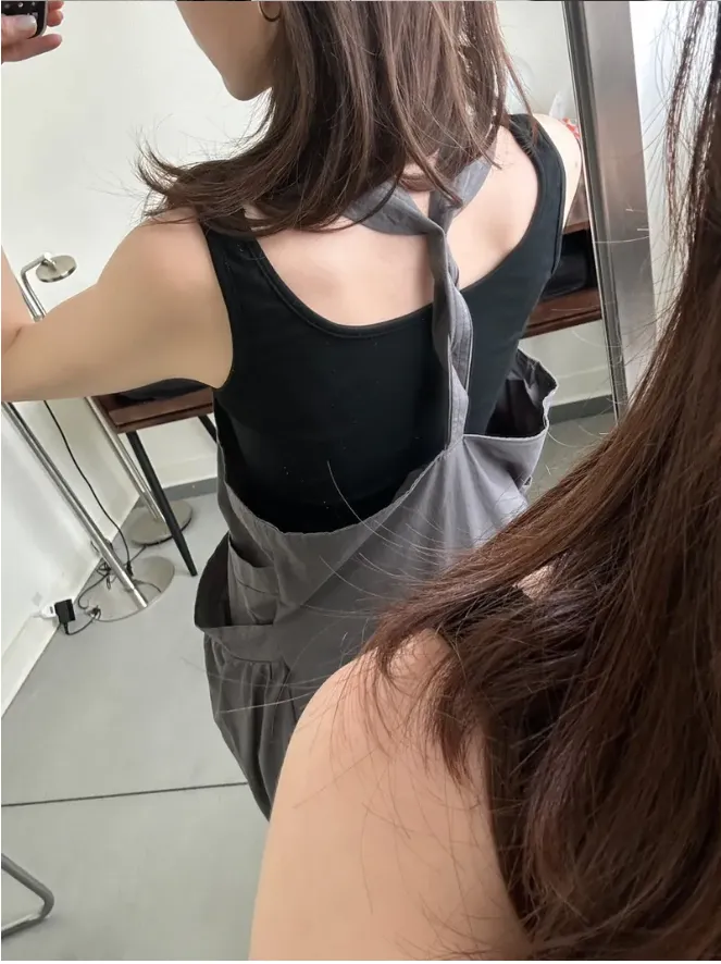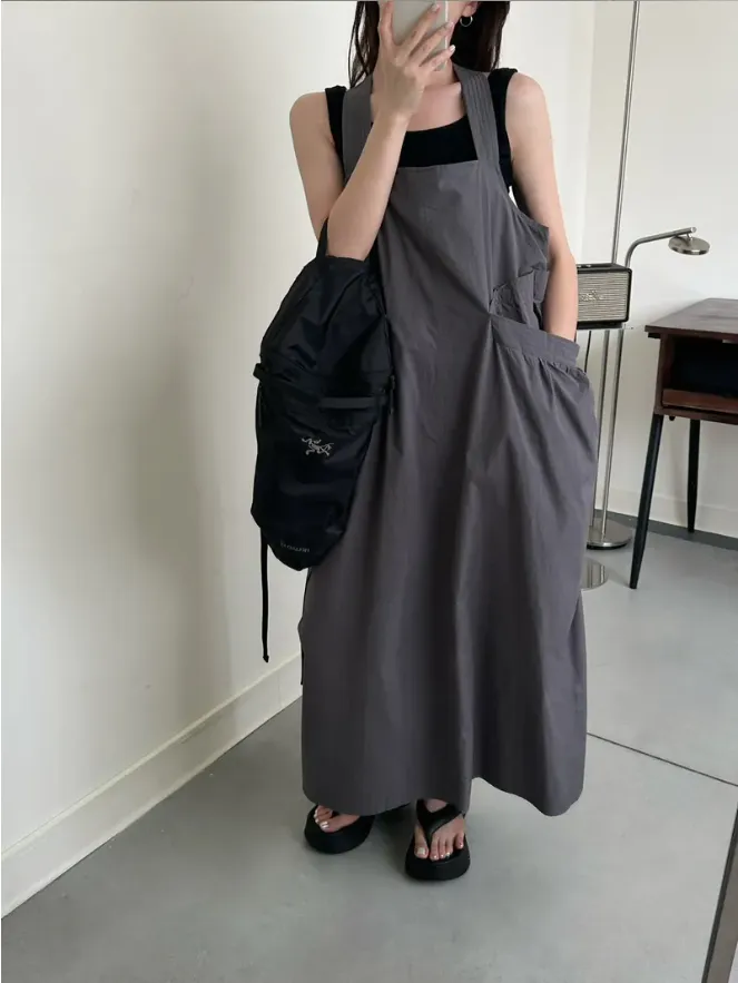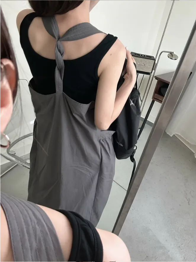 (現貨)KOREA 迷霧灰綠色 後扭結吊帶洋裝(附黑色背心)