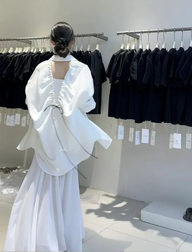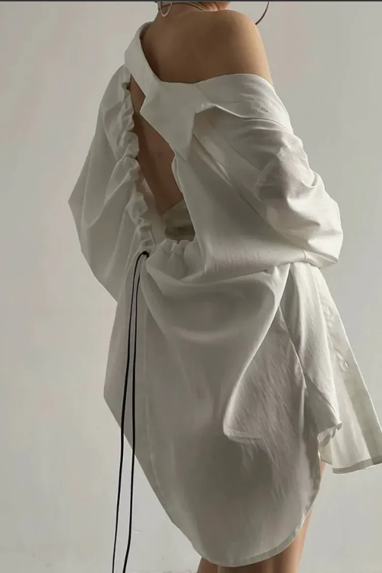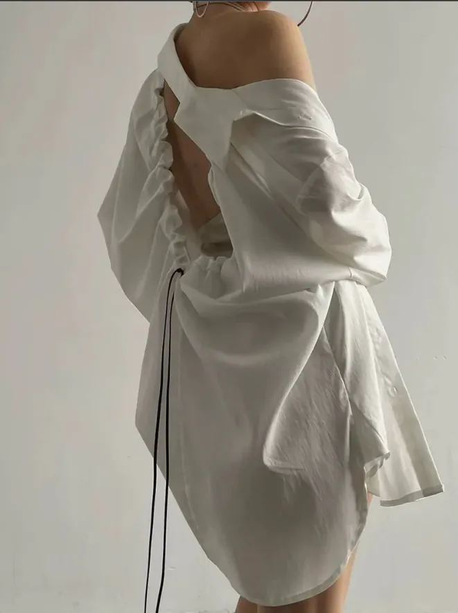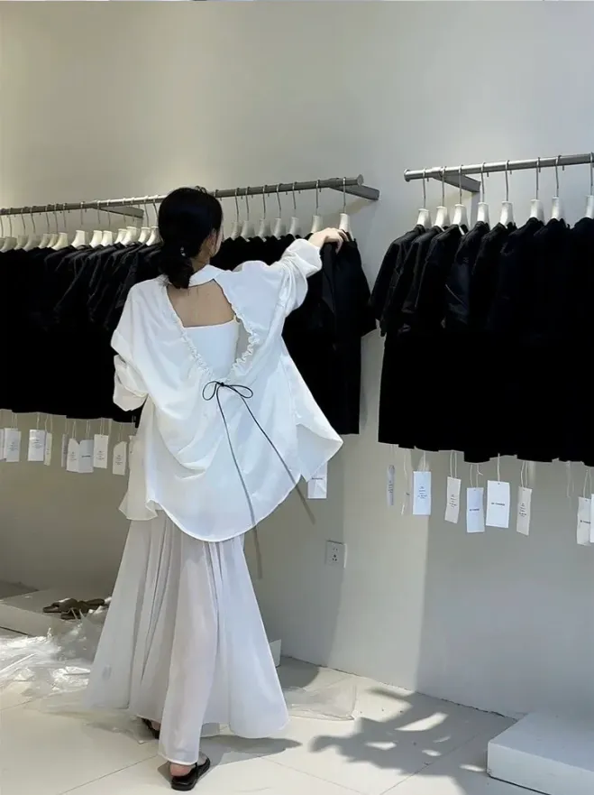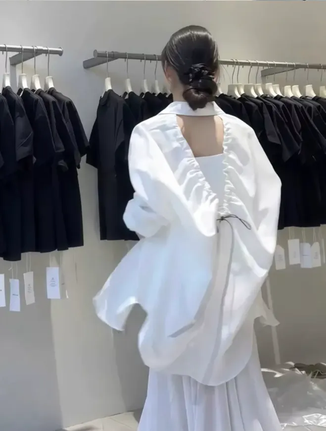 (現貨) 白色 好帥!極簡後簍空抽繩襯衫-