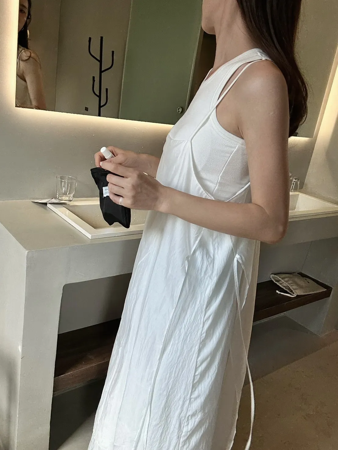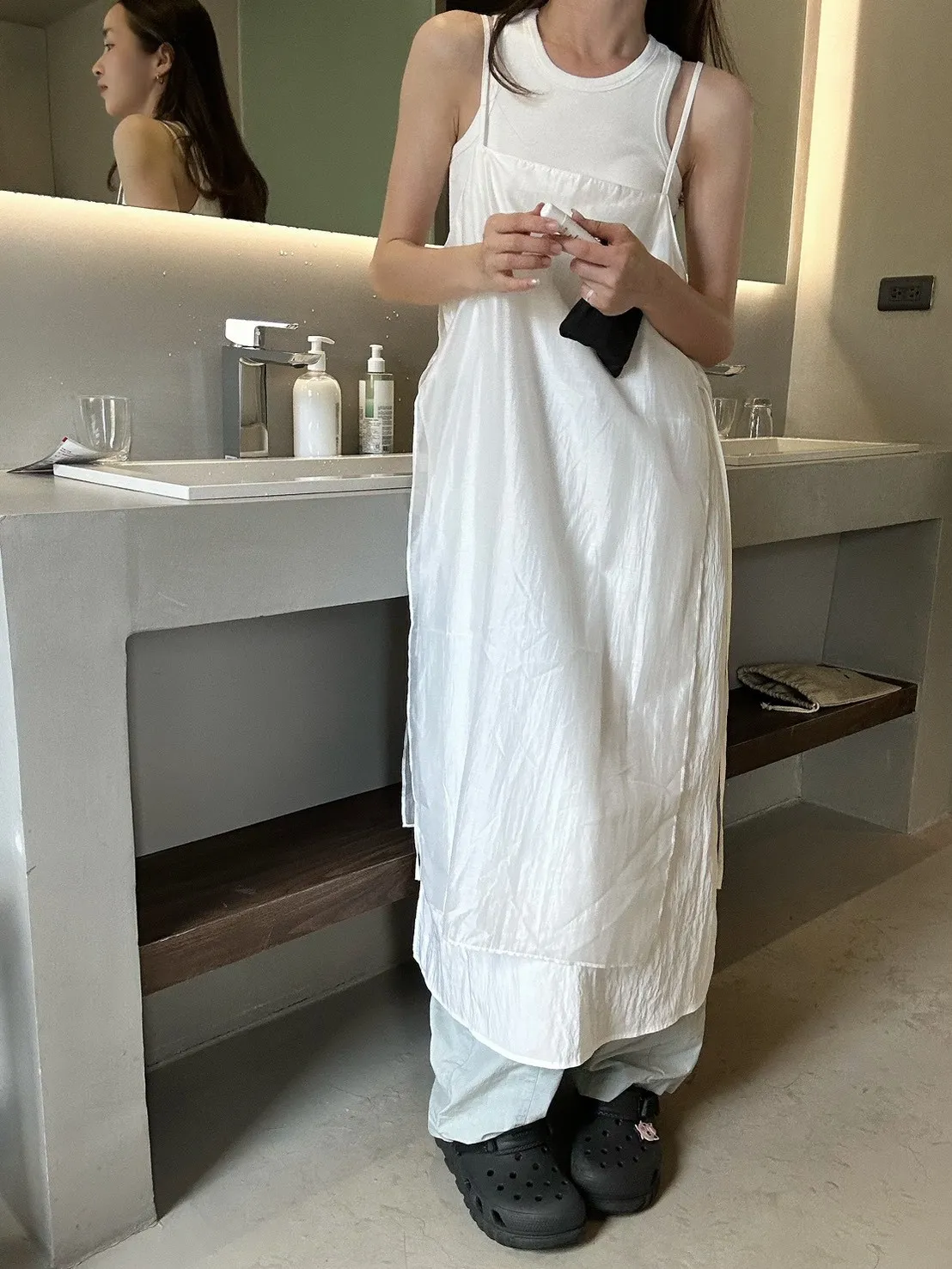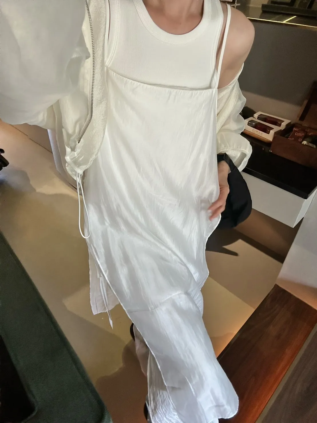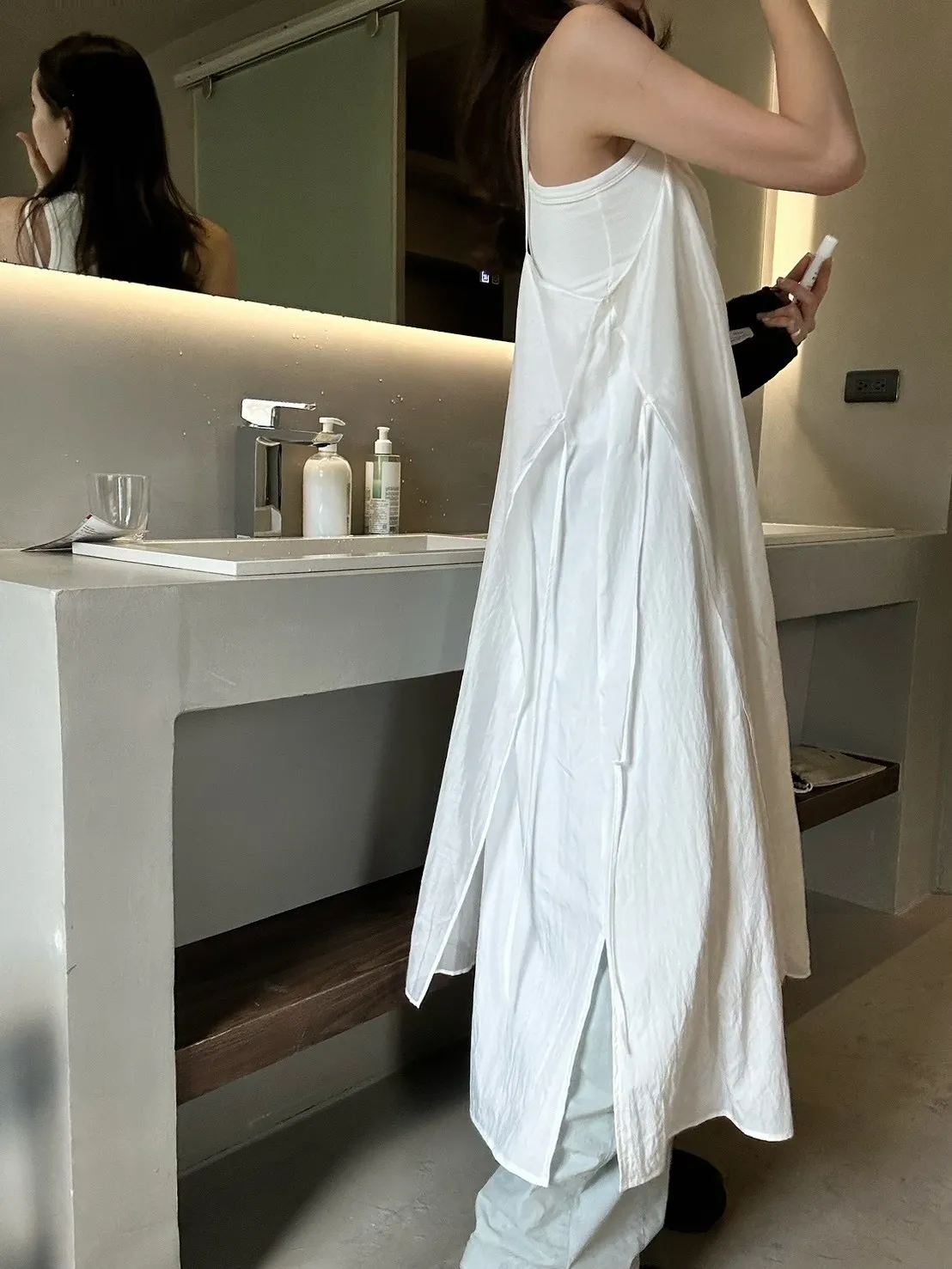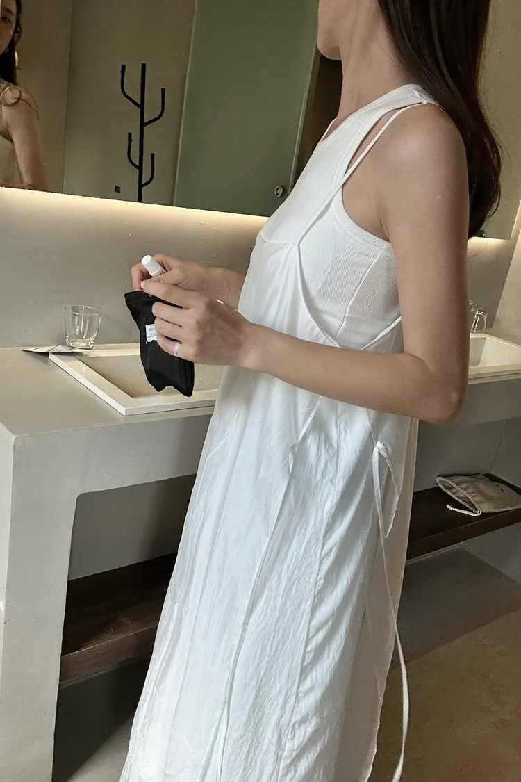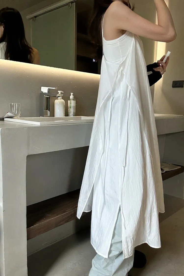 白色 巨美!仙女雙層側綁細肩背心洋裝