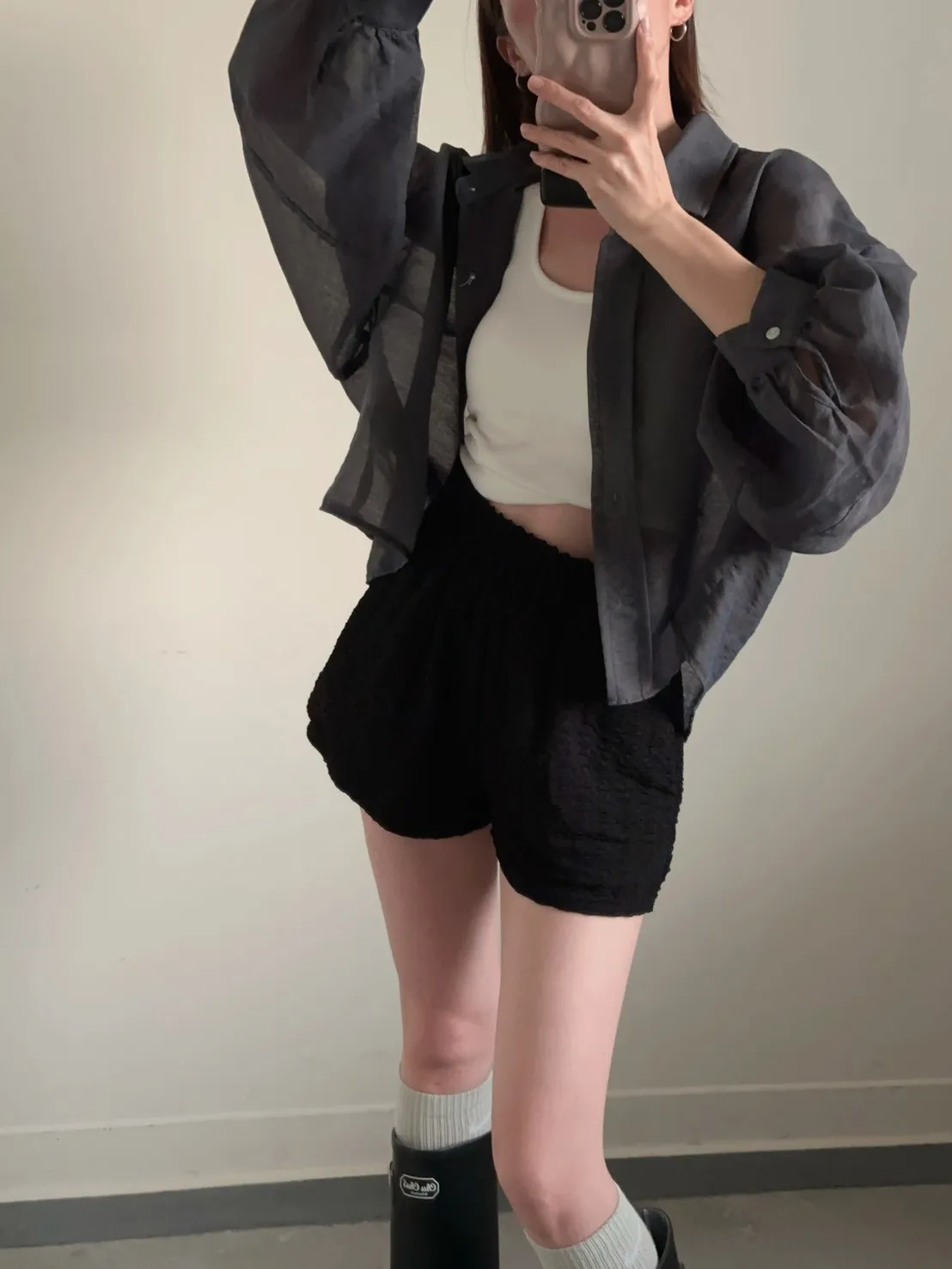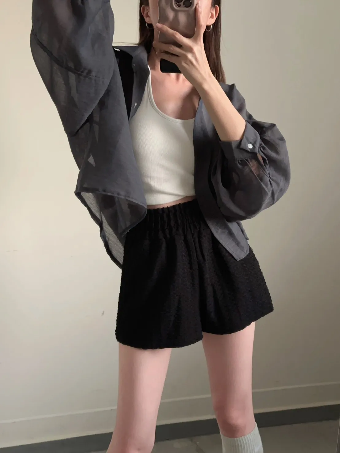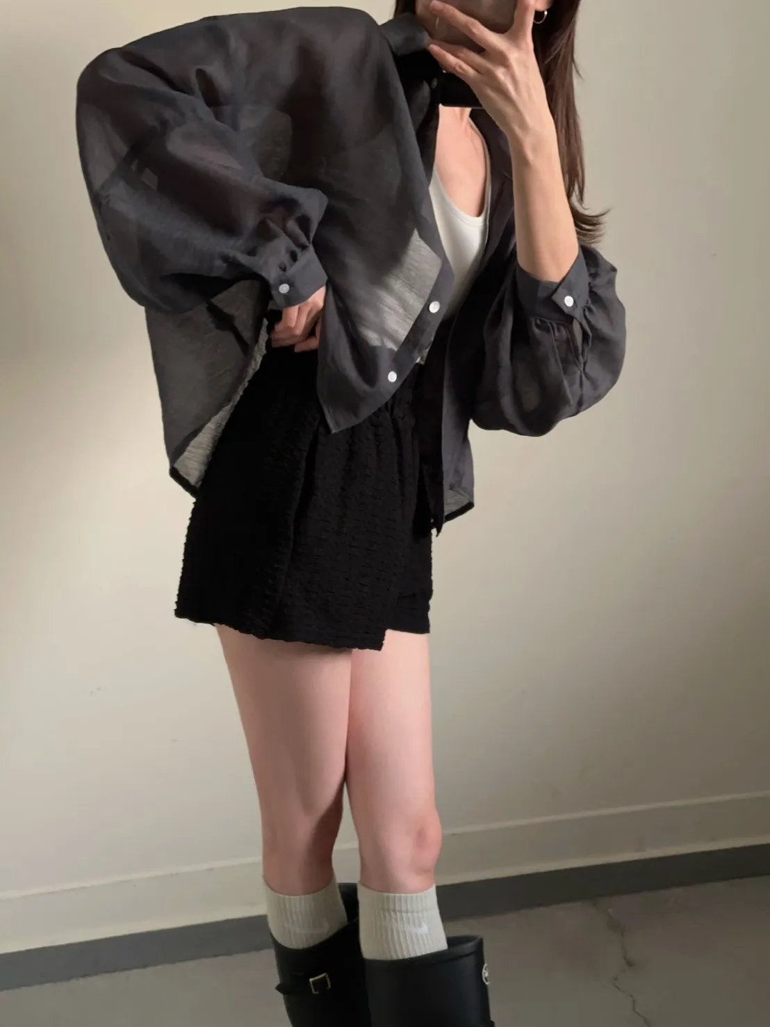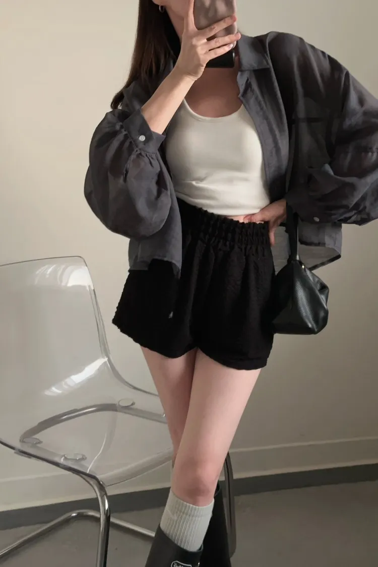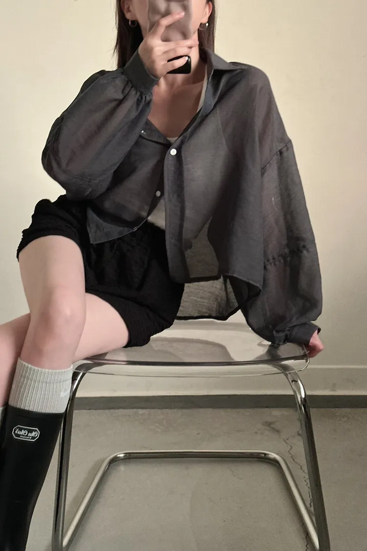 深灰色 挺版澎袖透紗絲襯衫