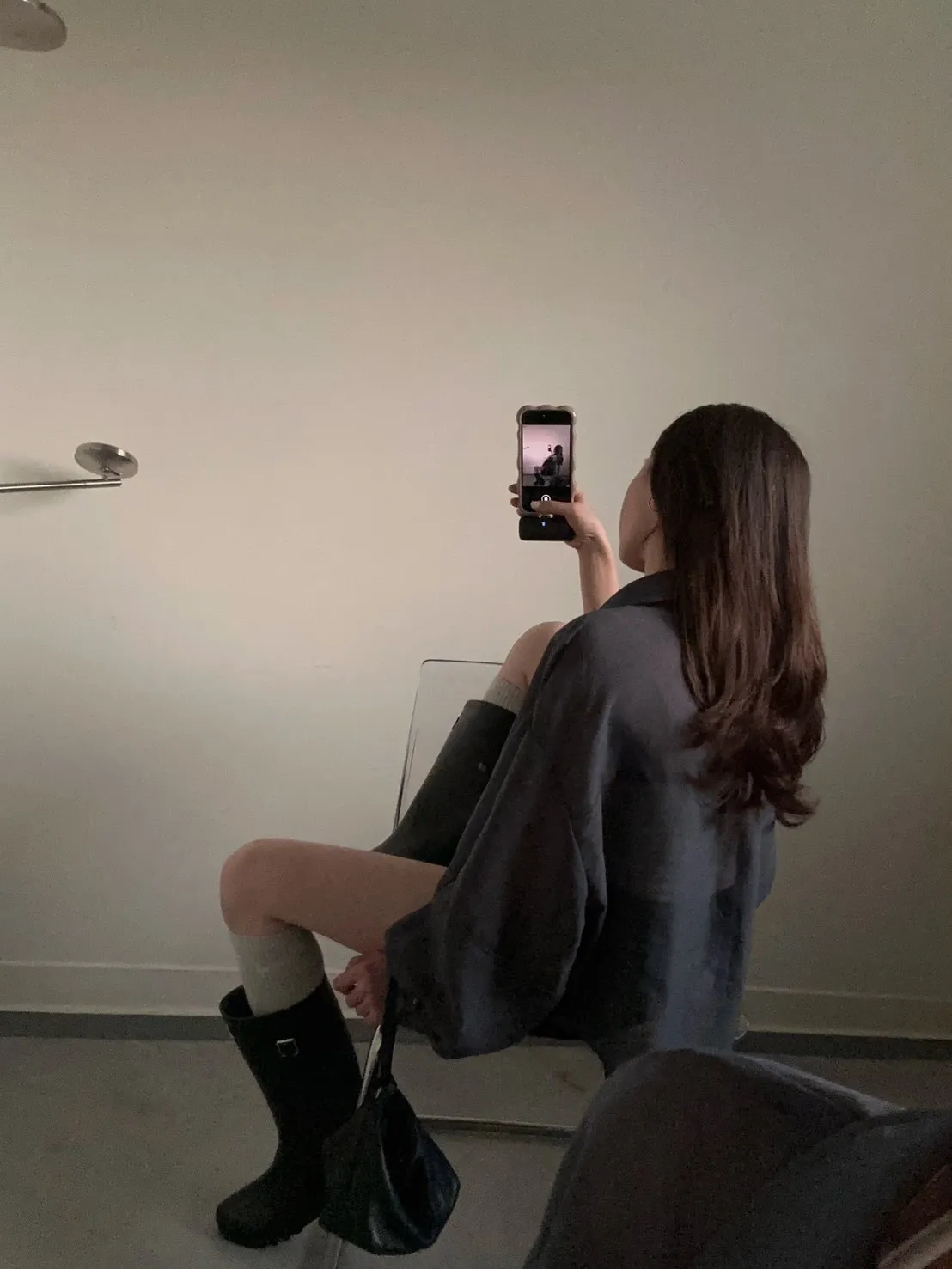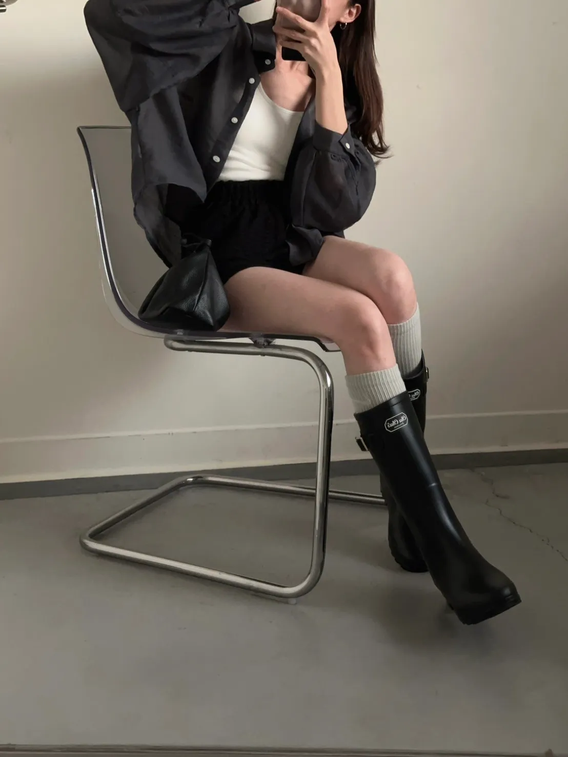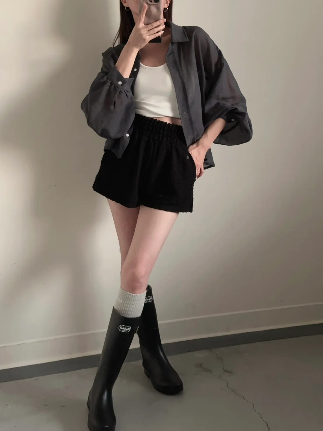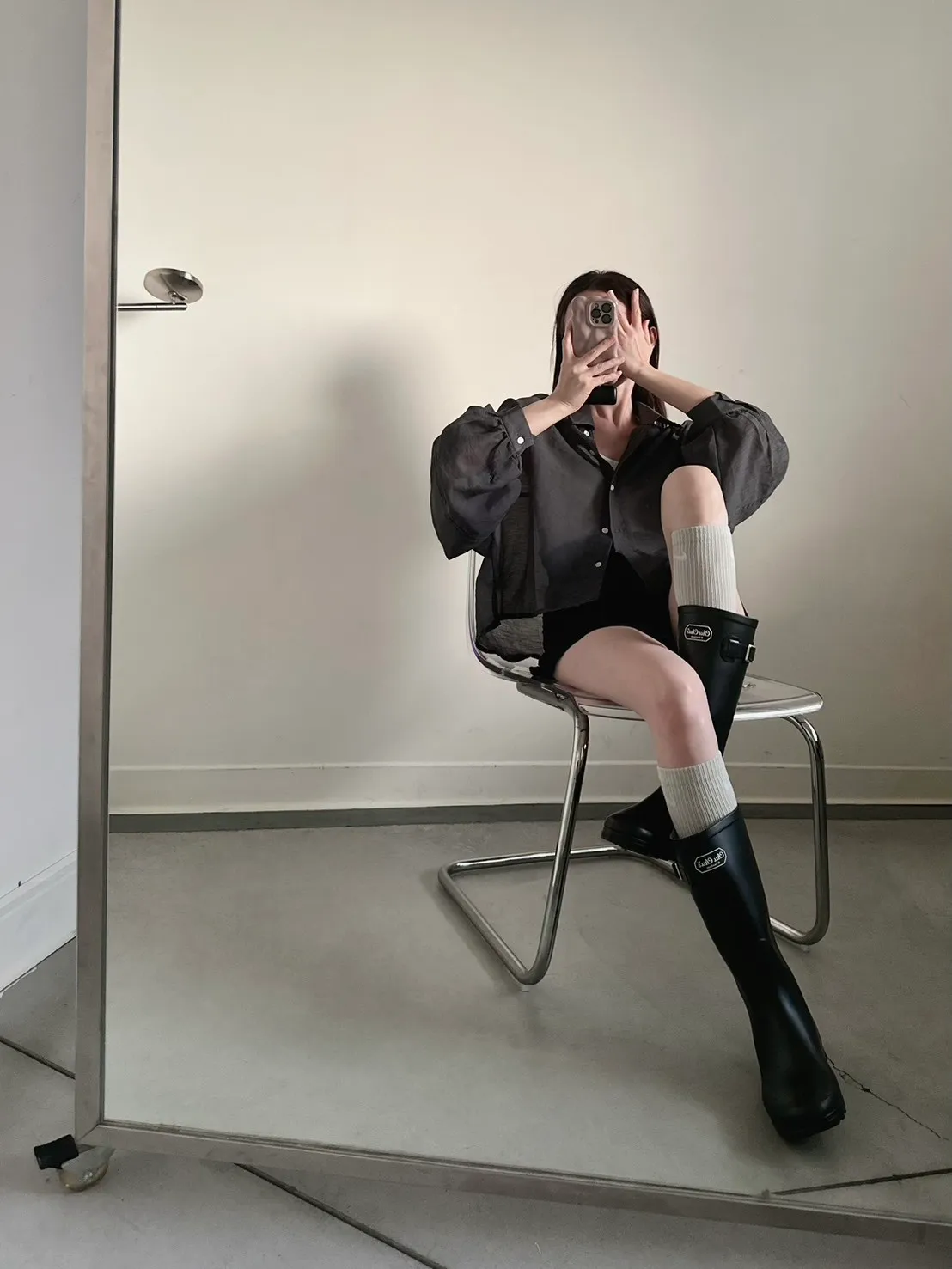 深灰色 挺版澎袖透紗絲襯衫