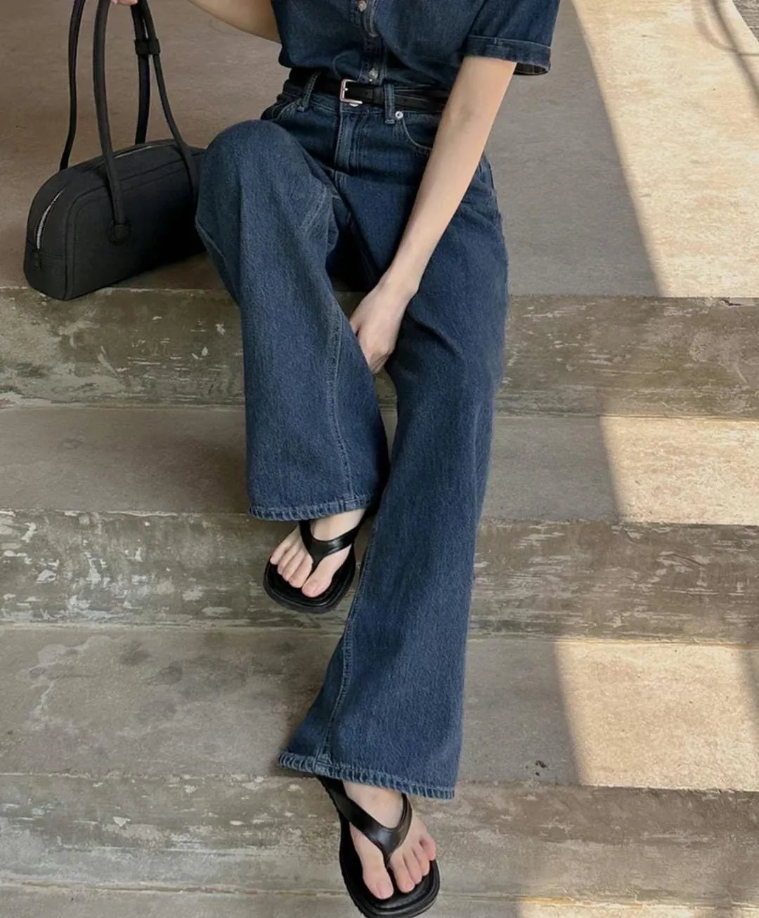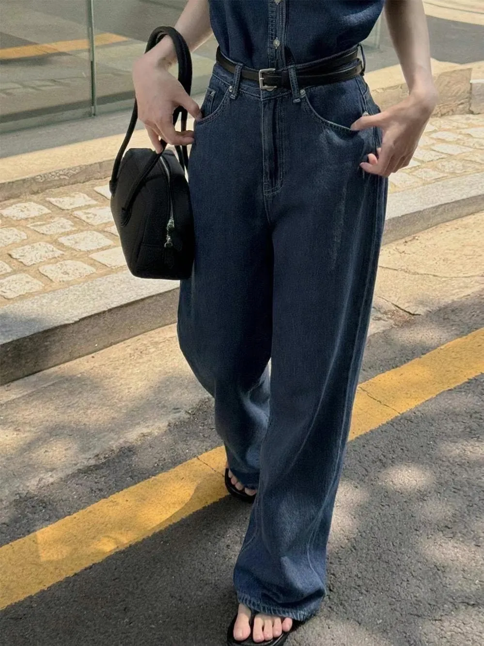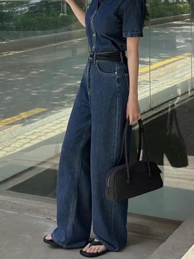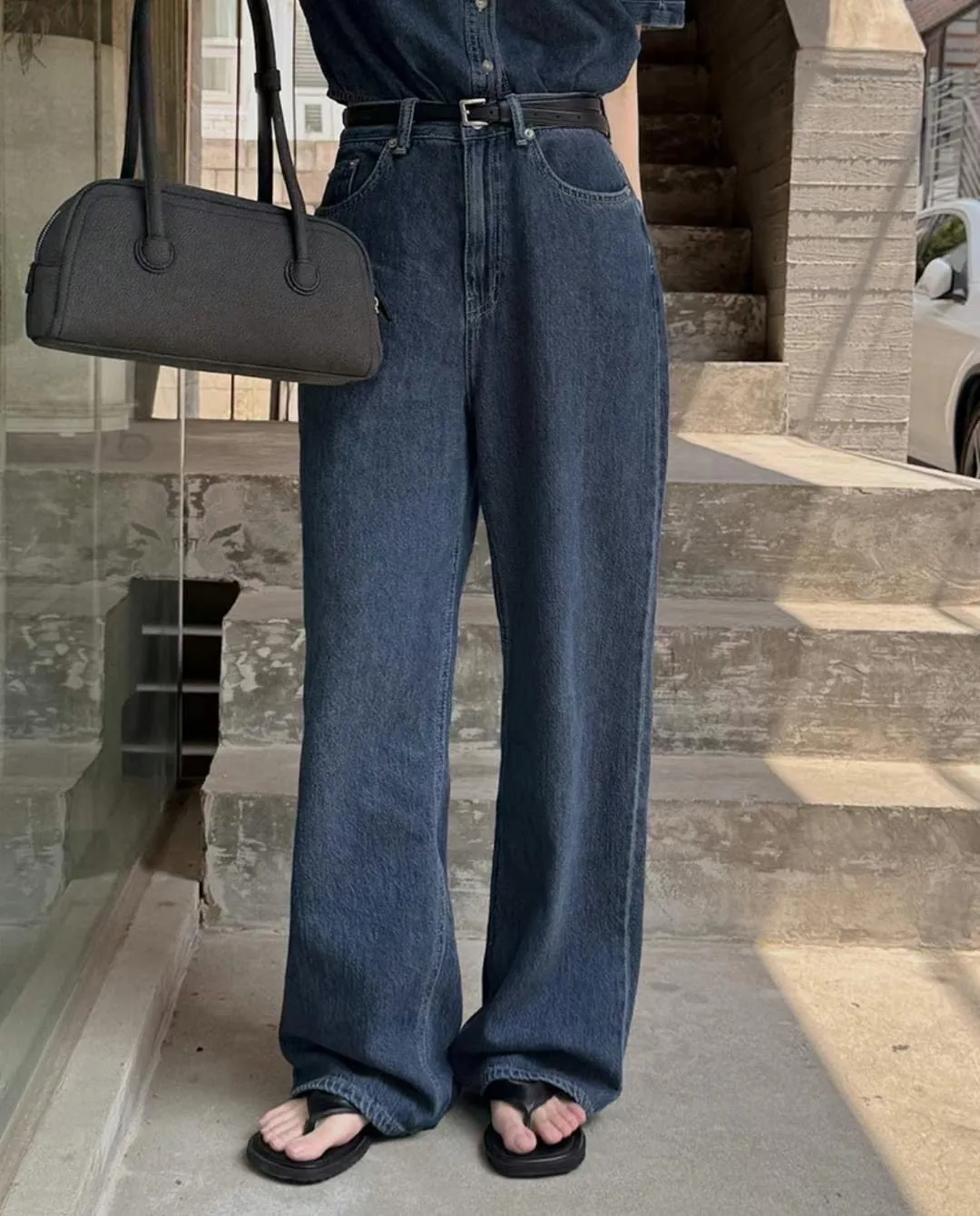 Korea 深藍色 大長腿直筒牛仔褲