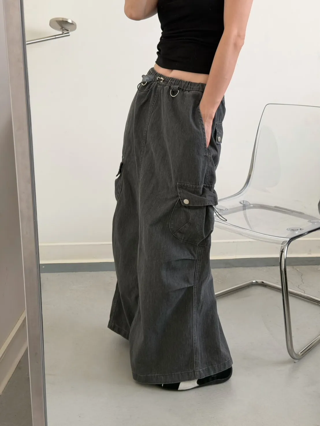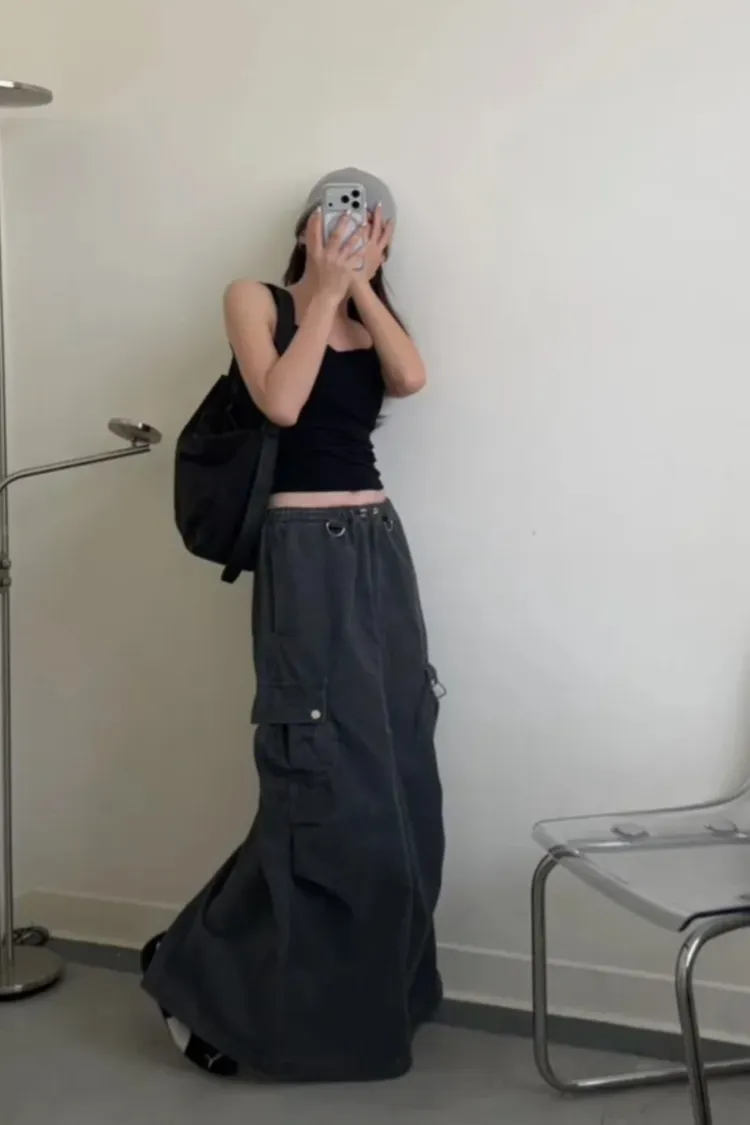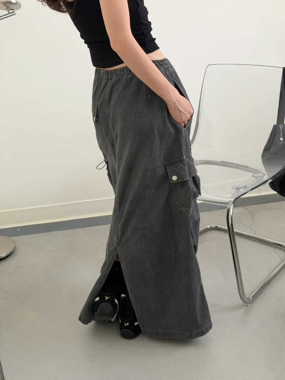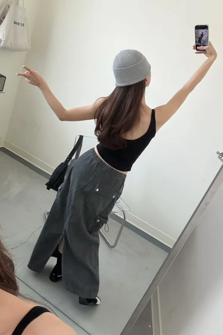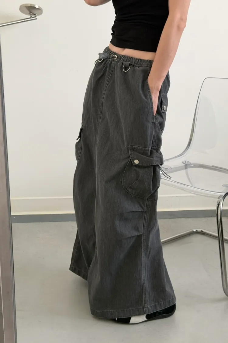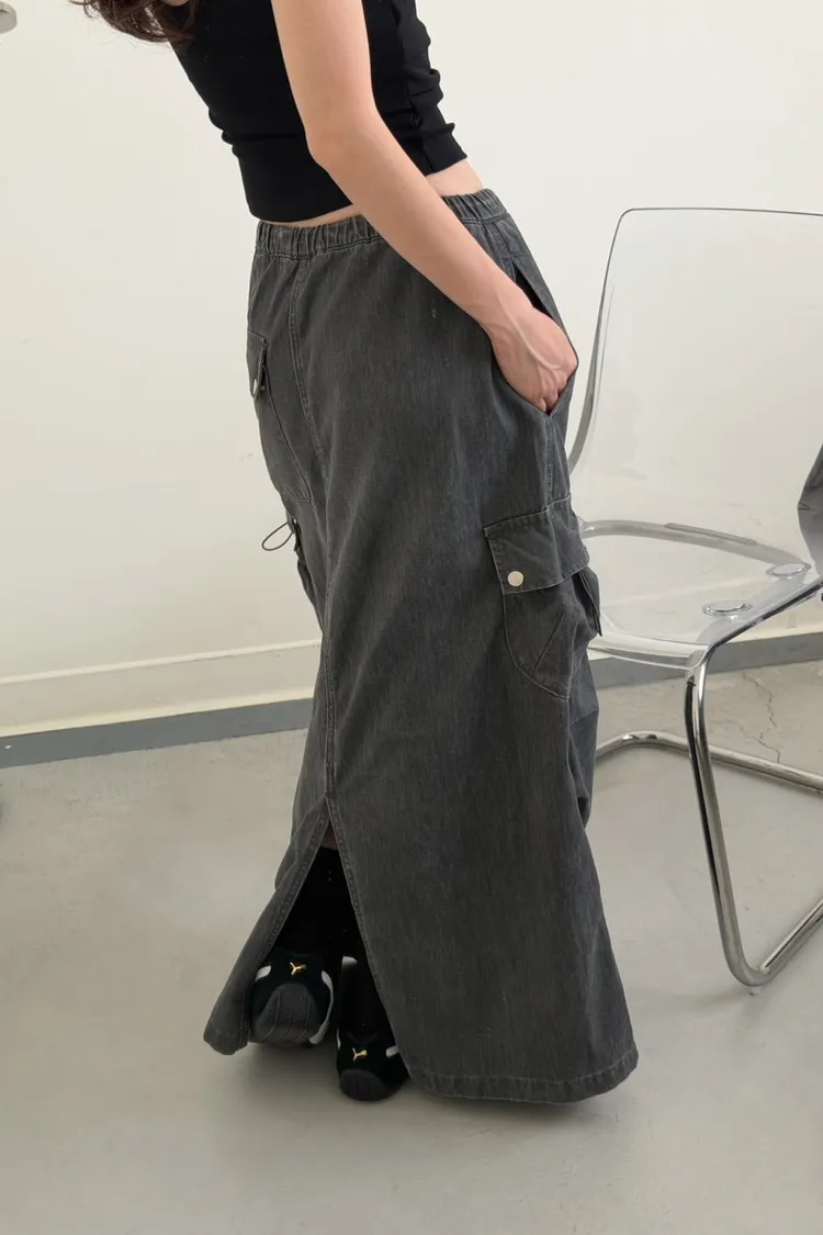 灰色 超愛!洗舊酷帥抽繩後開岔工裝裙