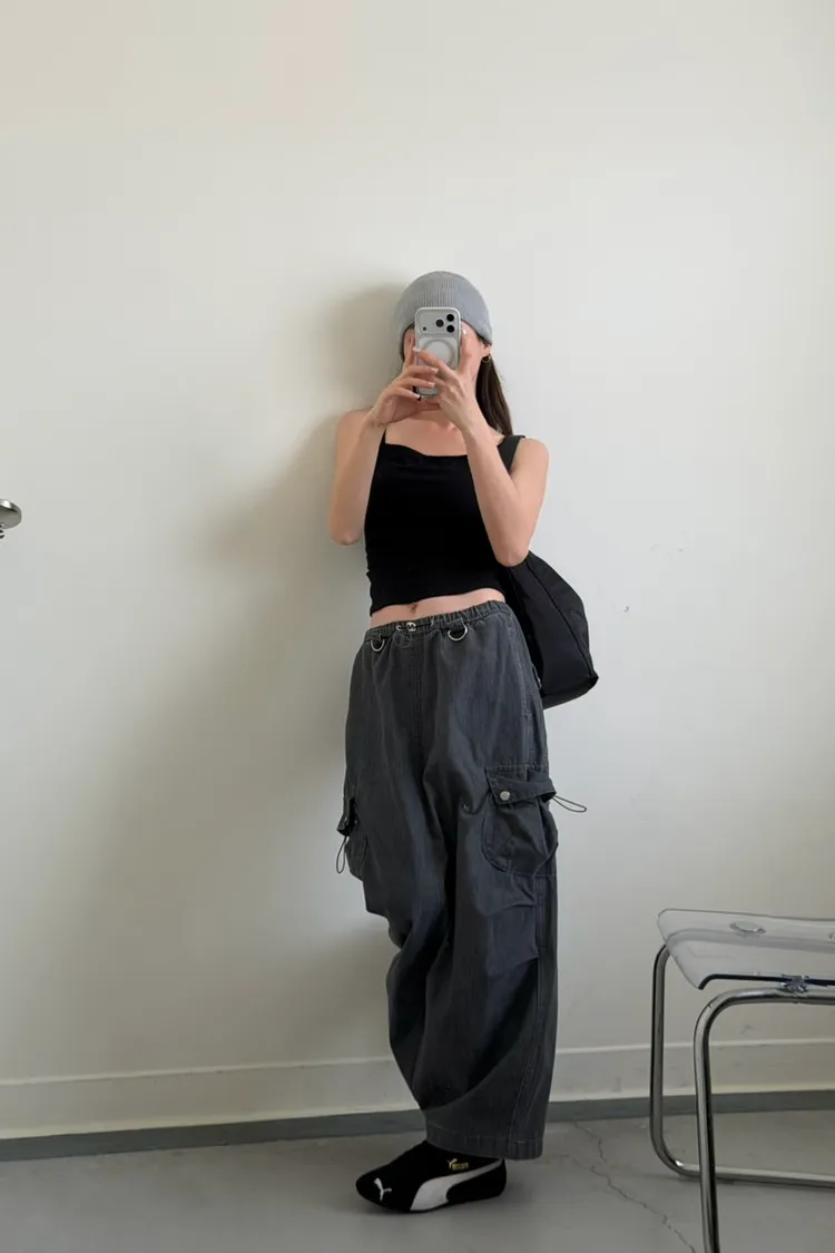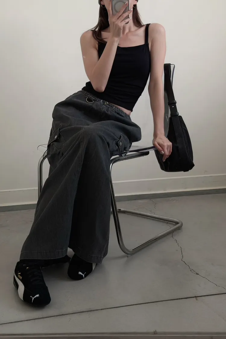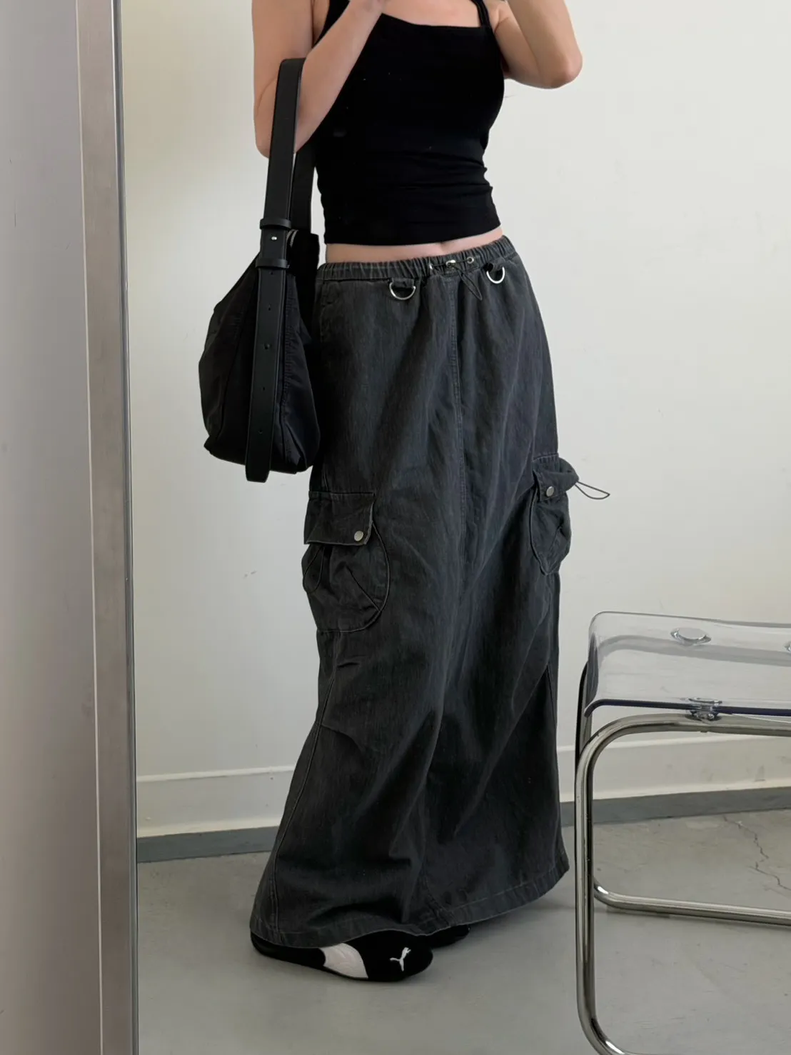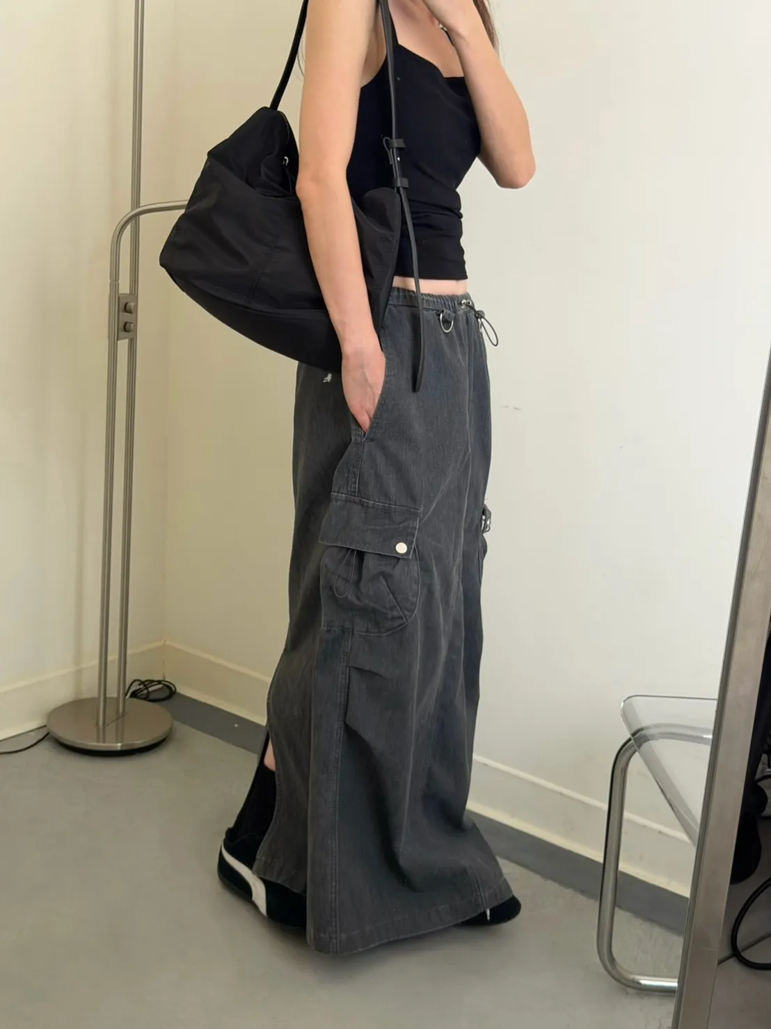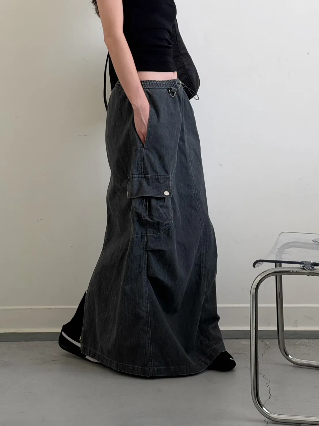 灰色 超愛!洗舊酷帥抽繩後開岔工裝裙