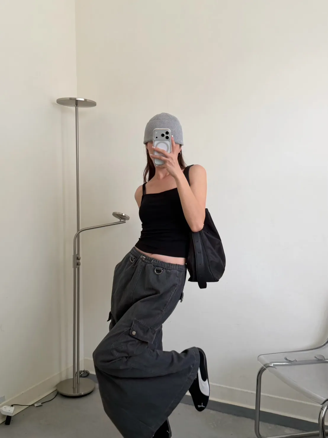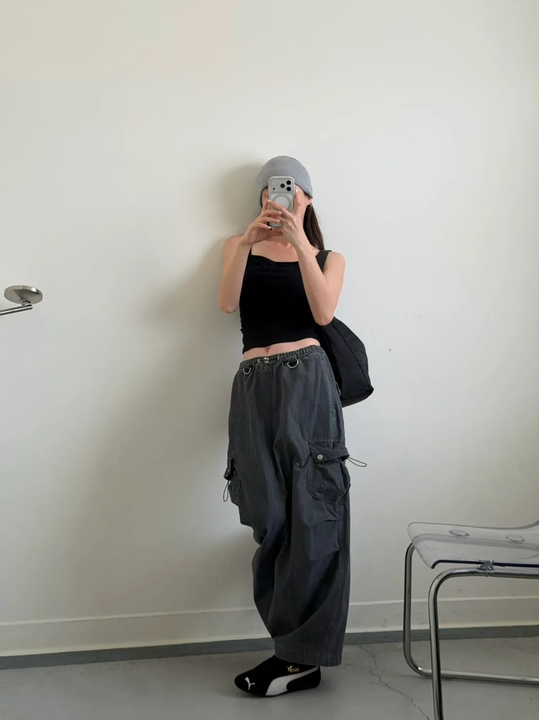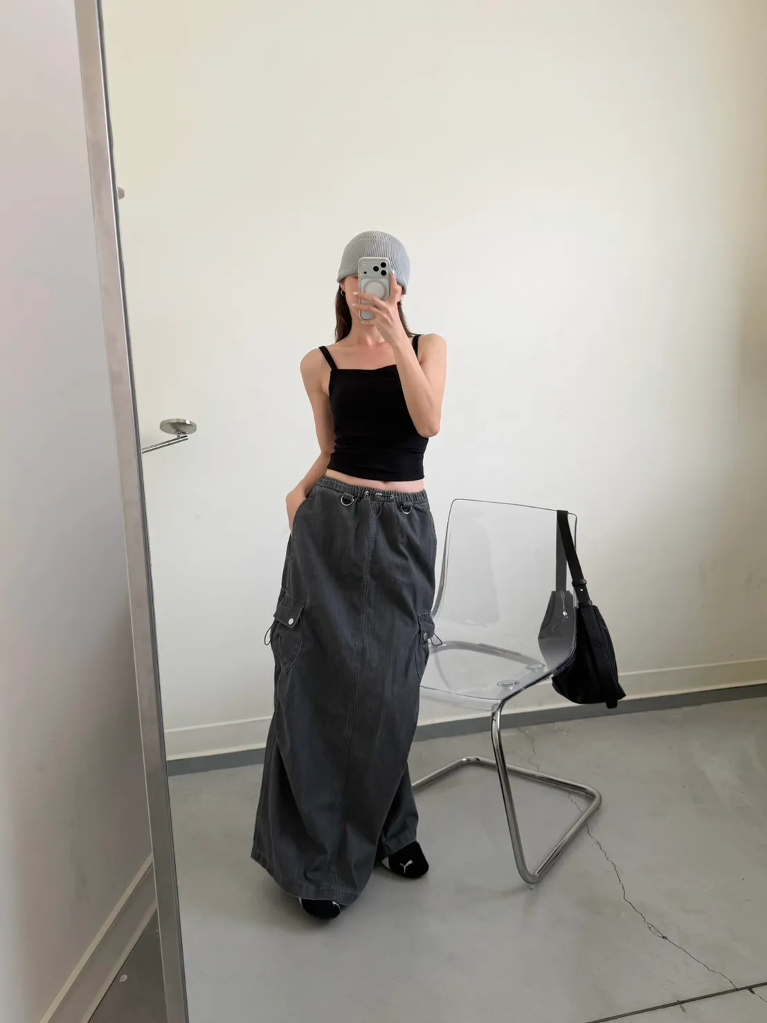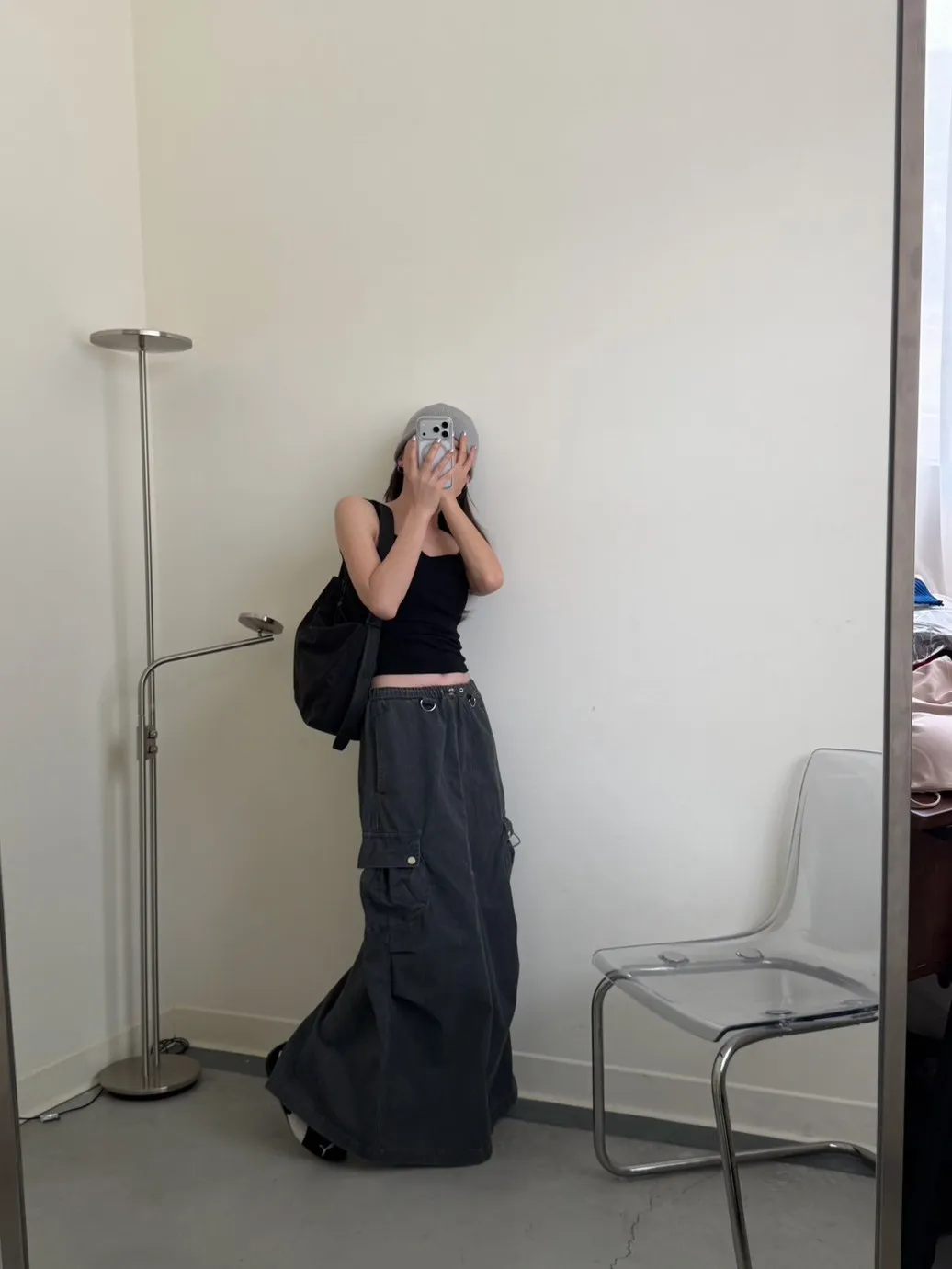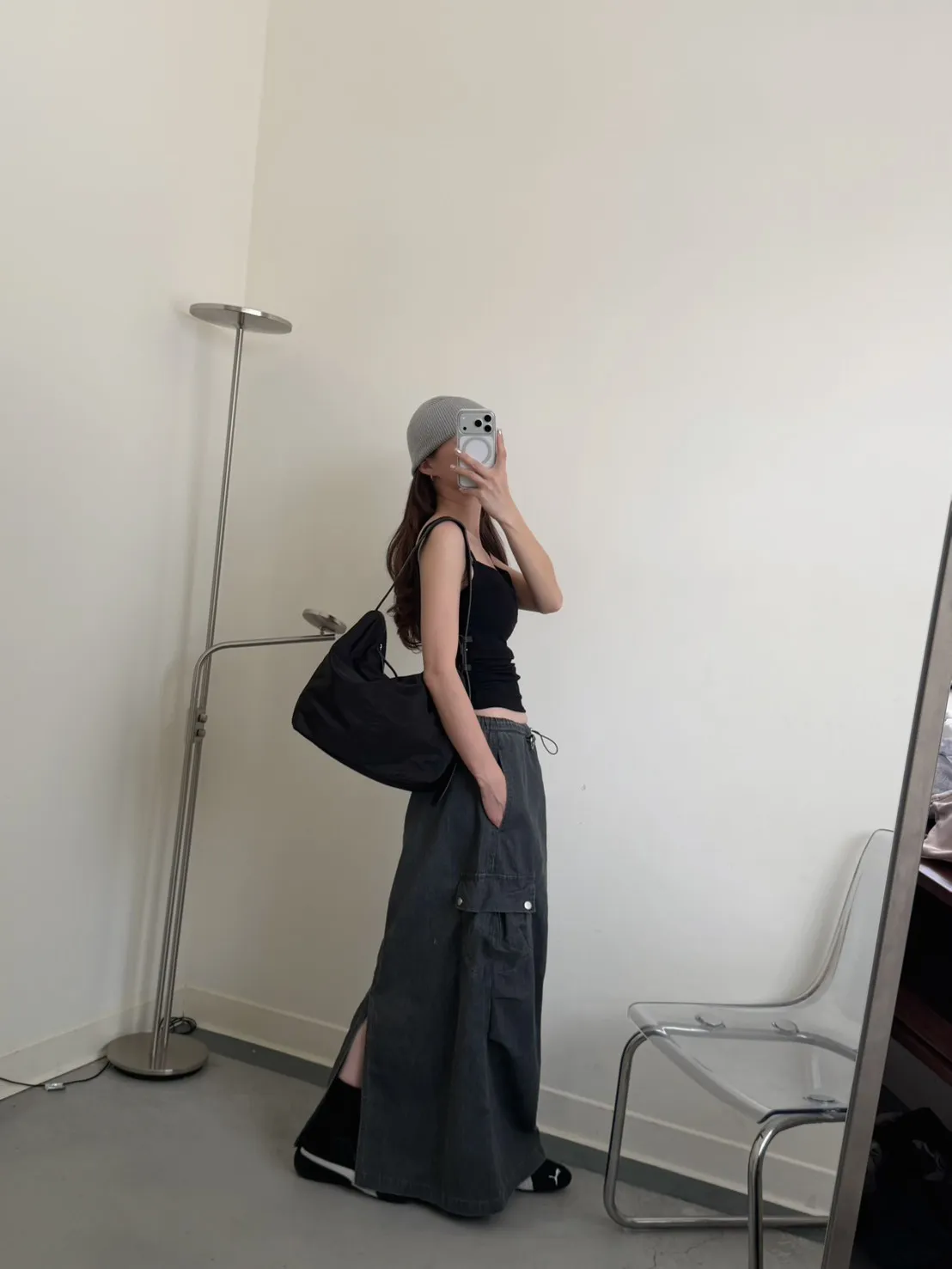 灰色 超愛!洗舊酷帥抽繩後開岔工裝裙