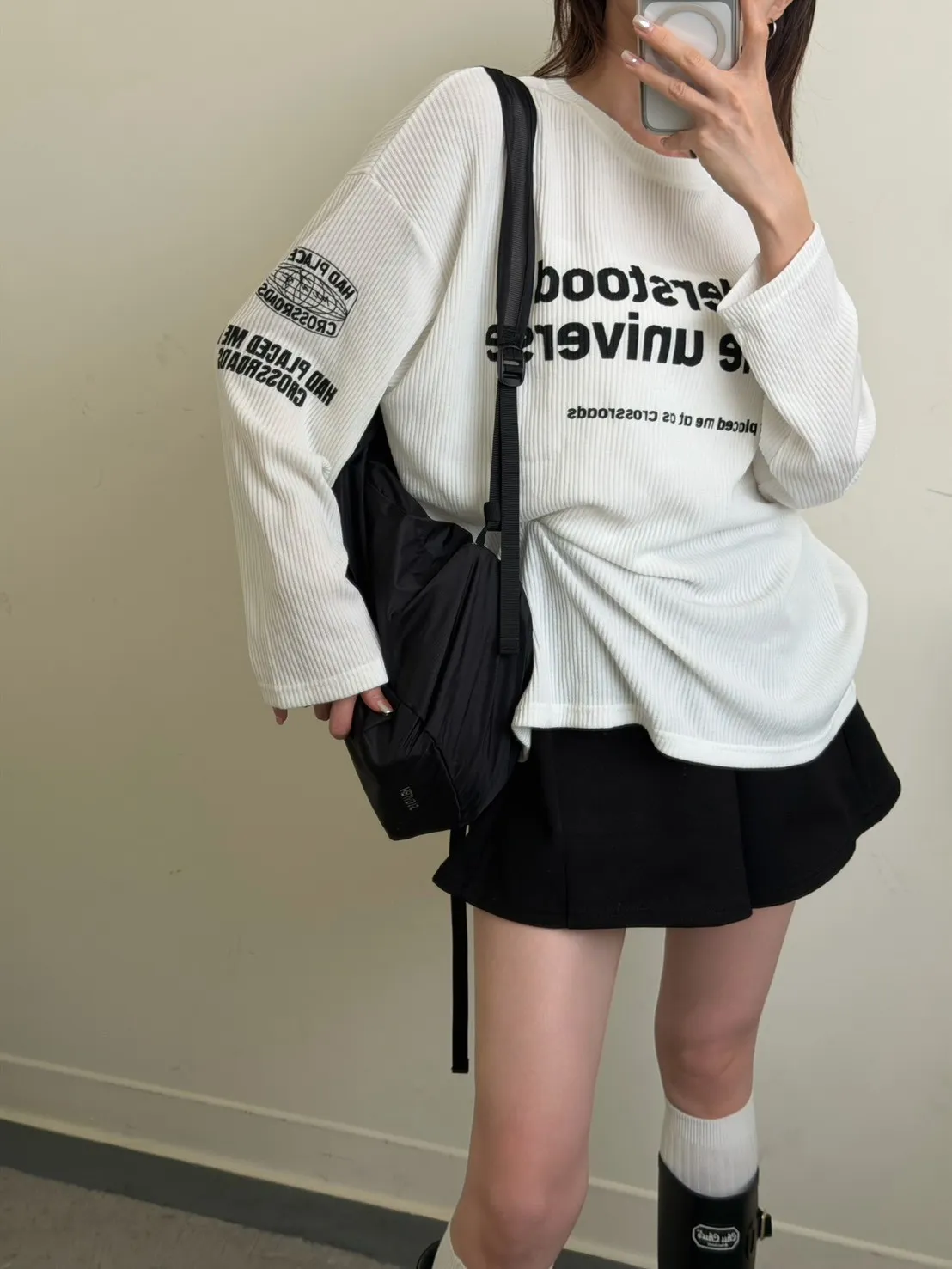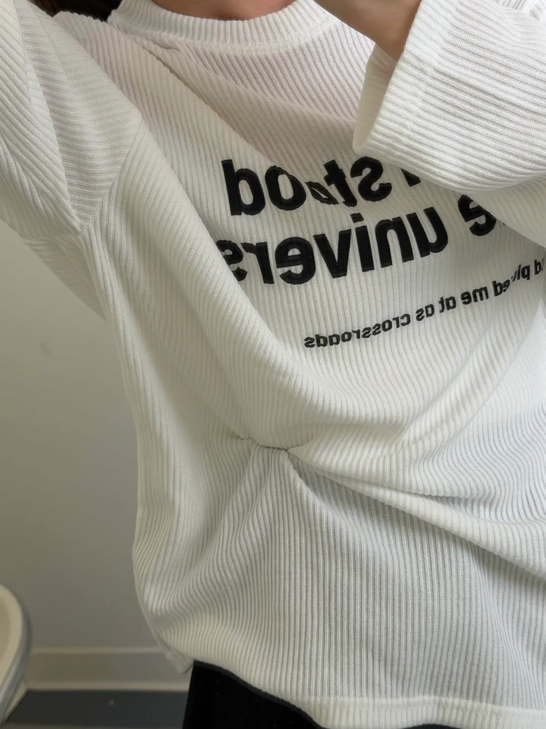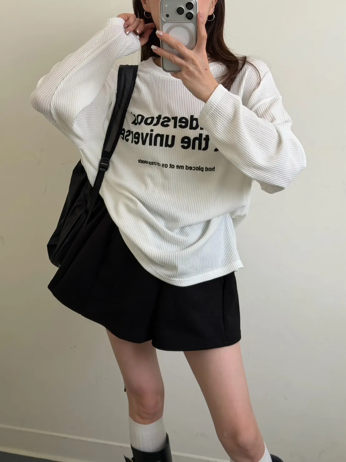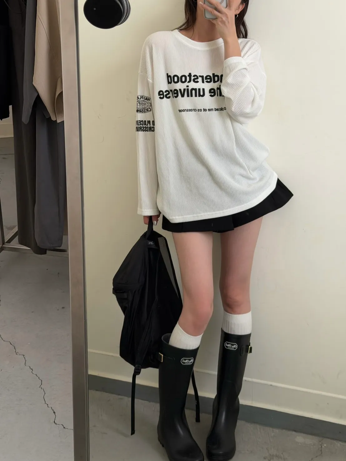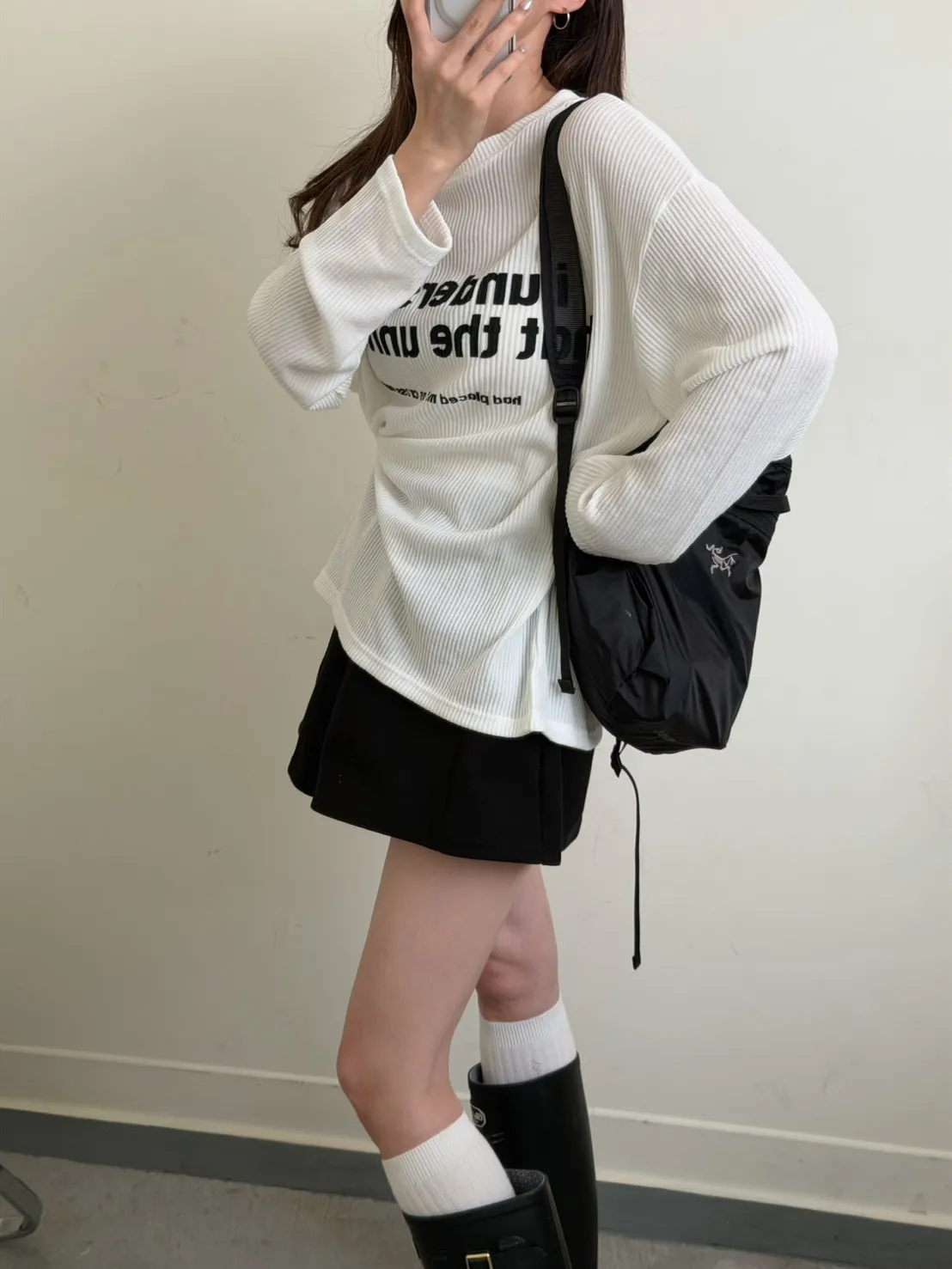 KOREA 白色 坑紋感字母長袖棉紗tee