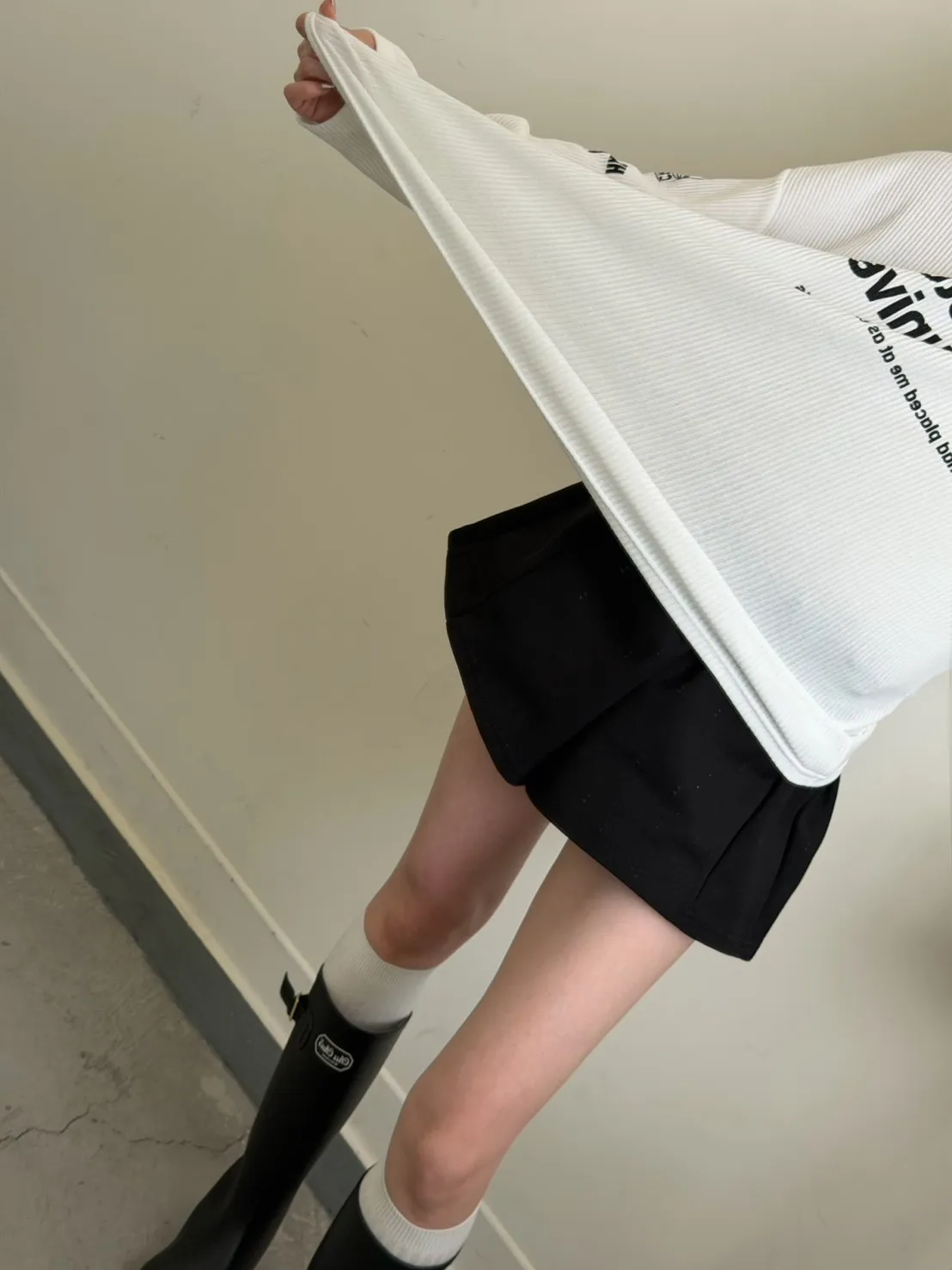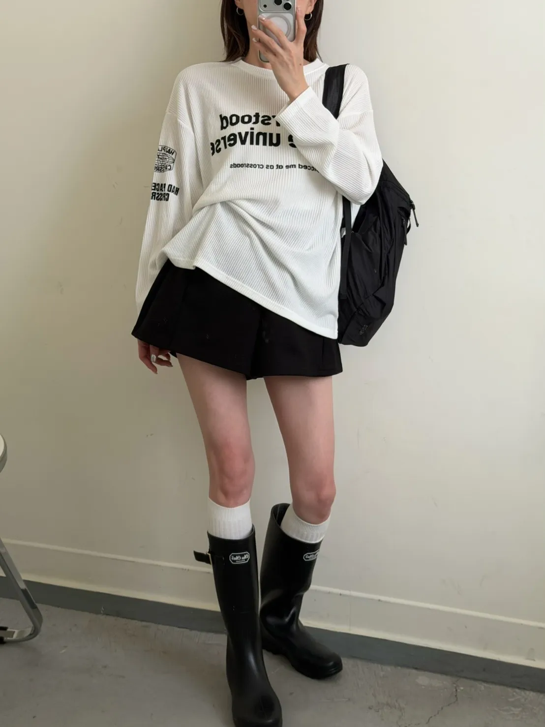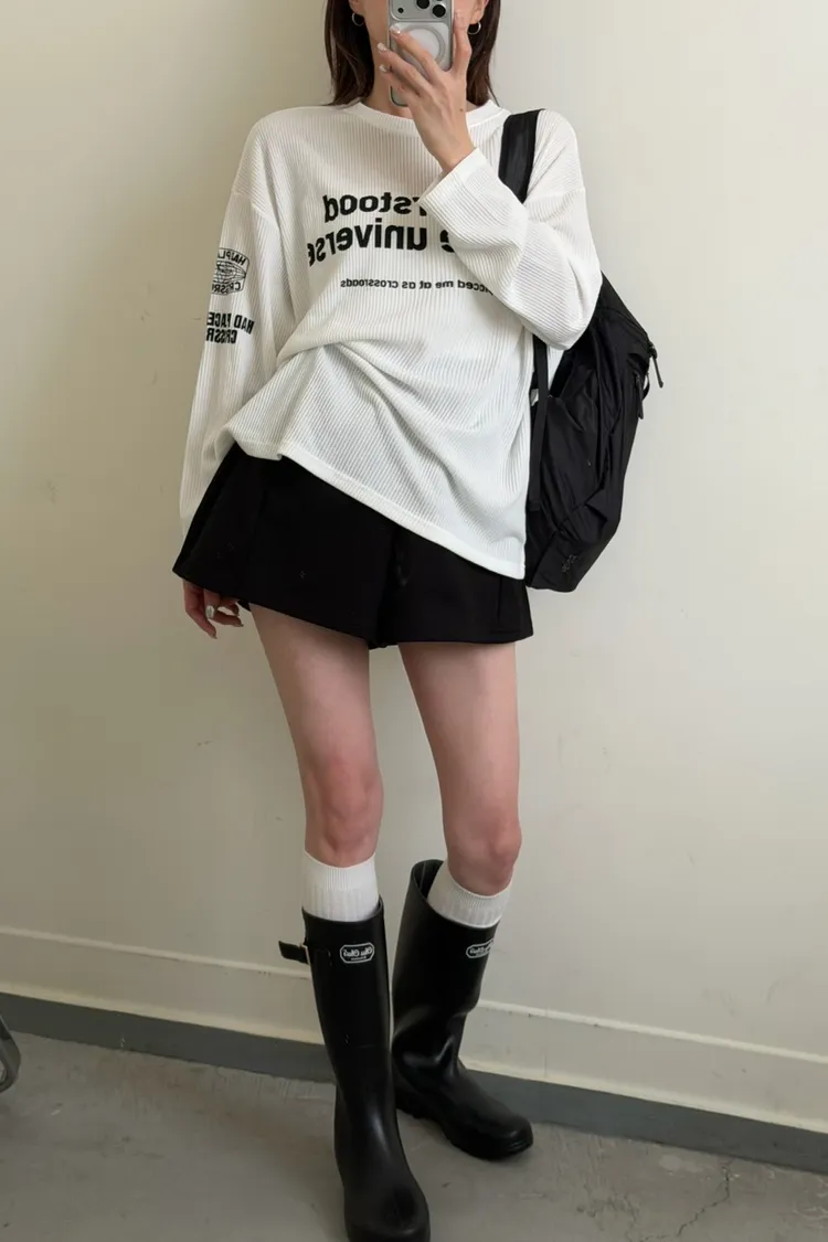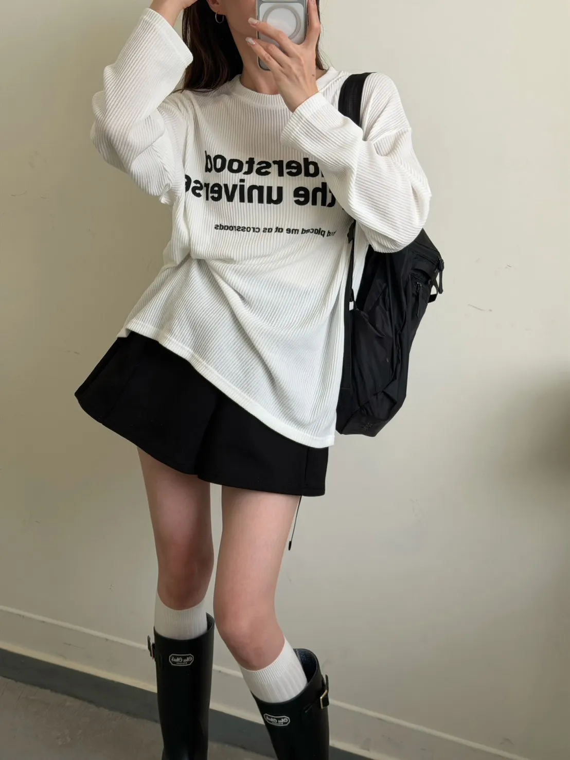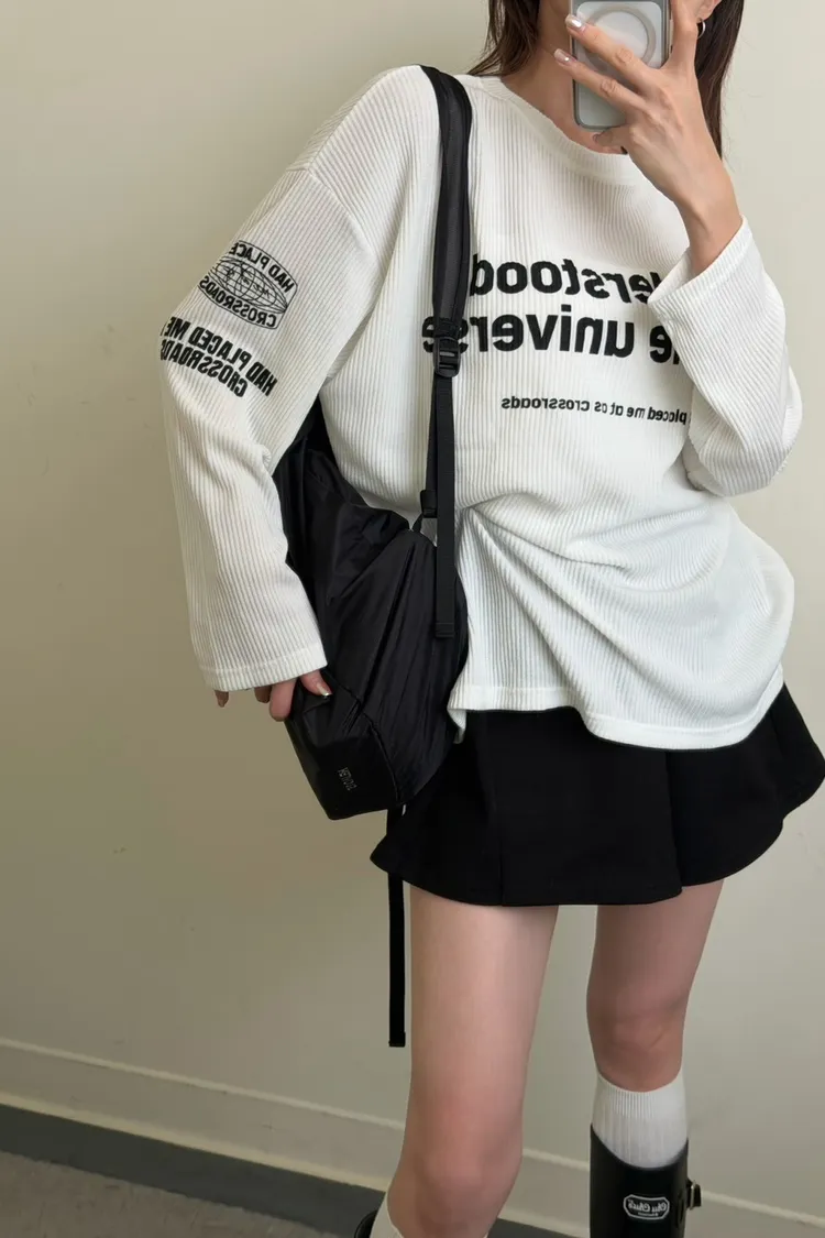 KOREA 白色 坑紋感字母長袖棉紗tee