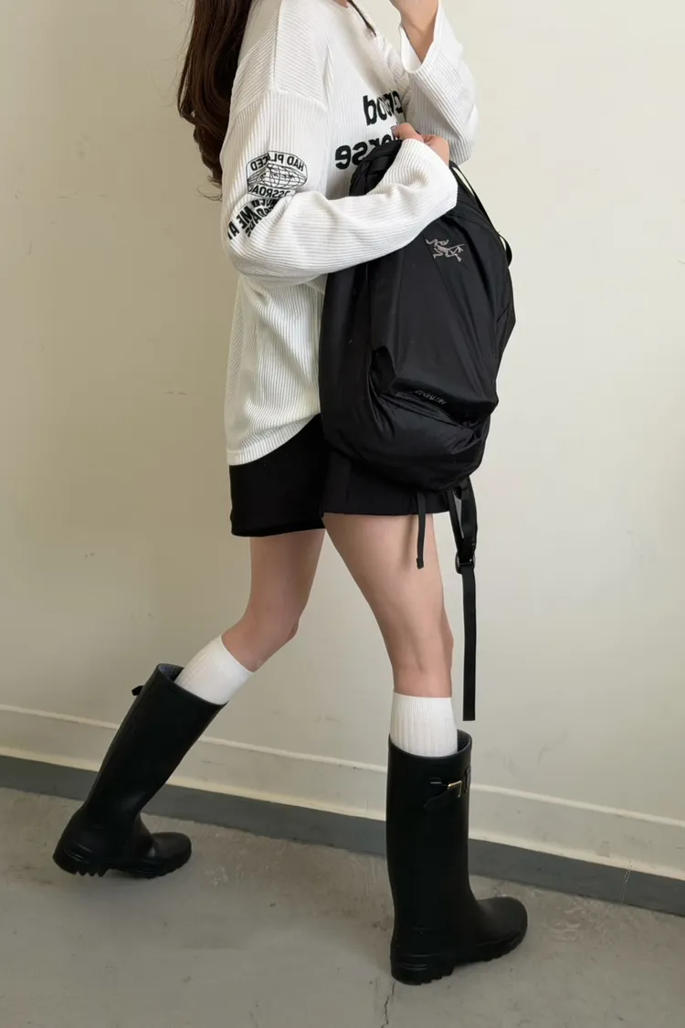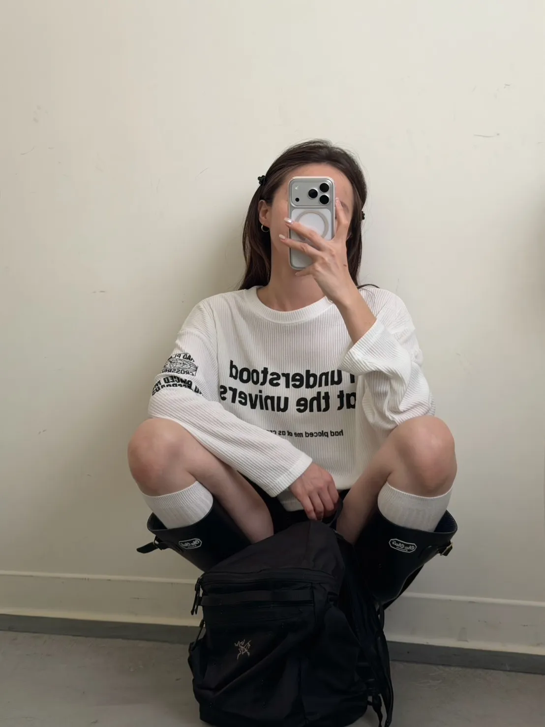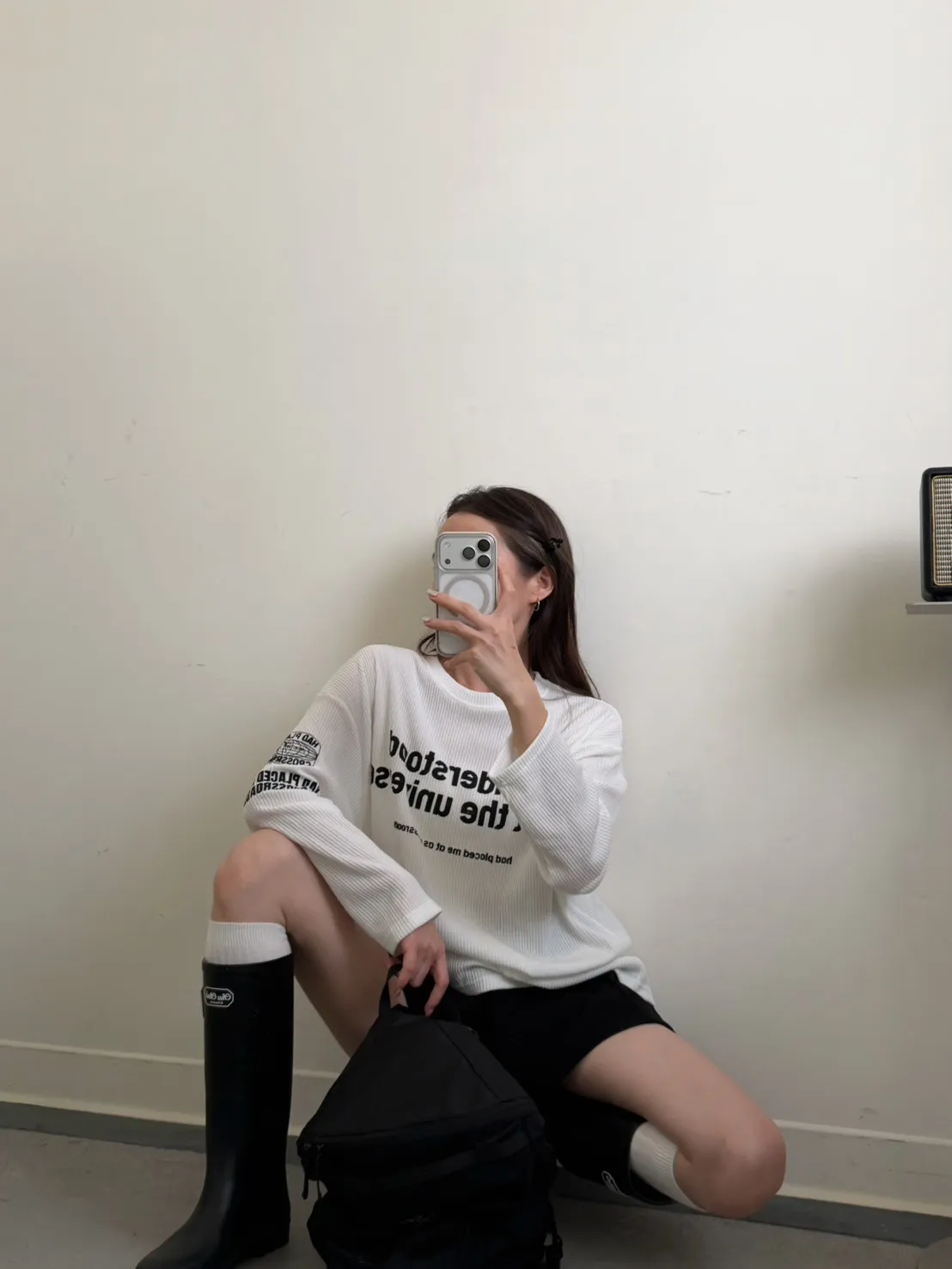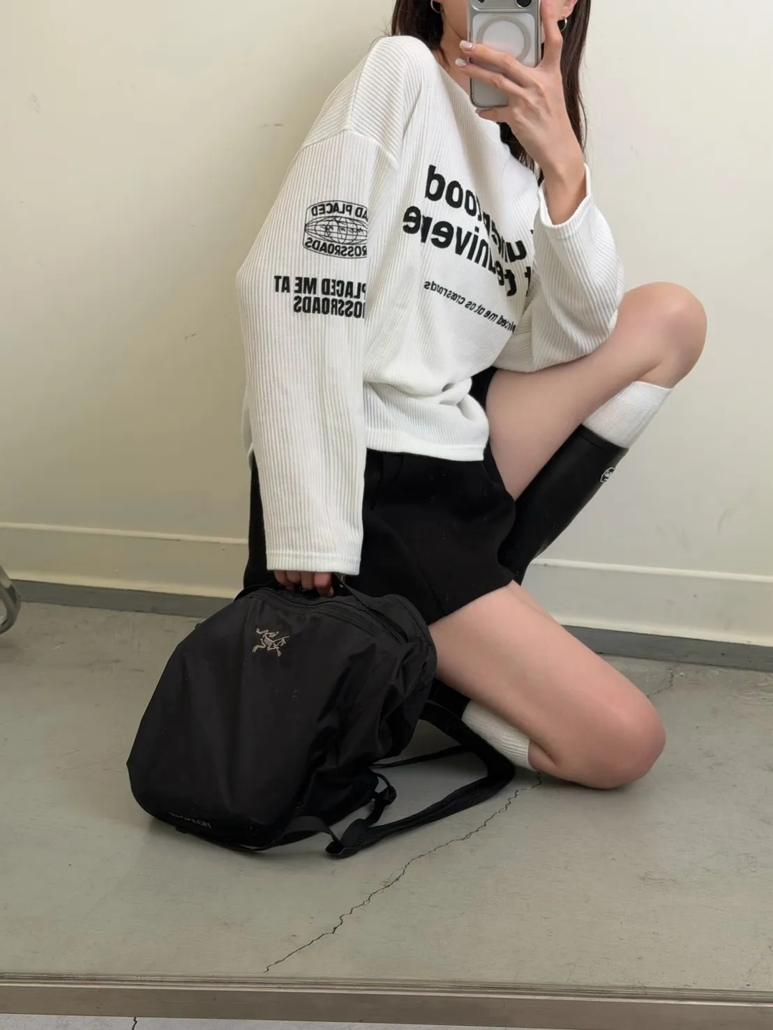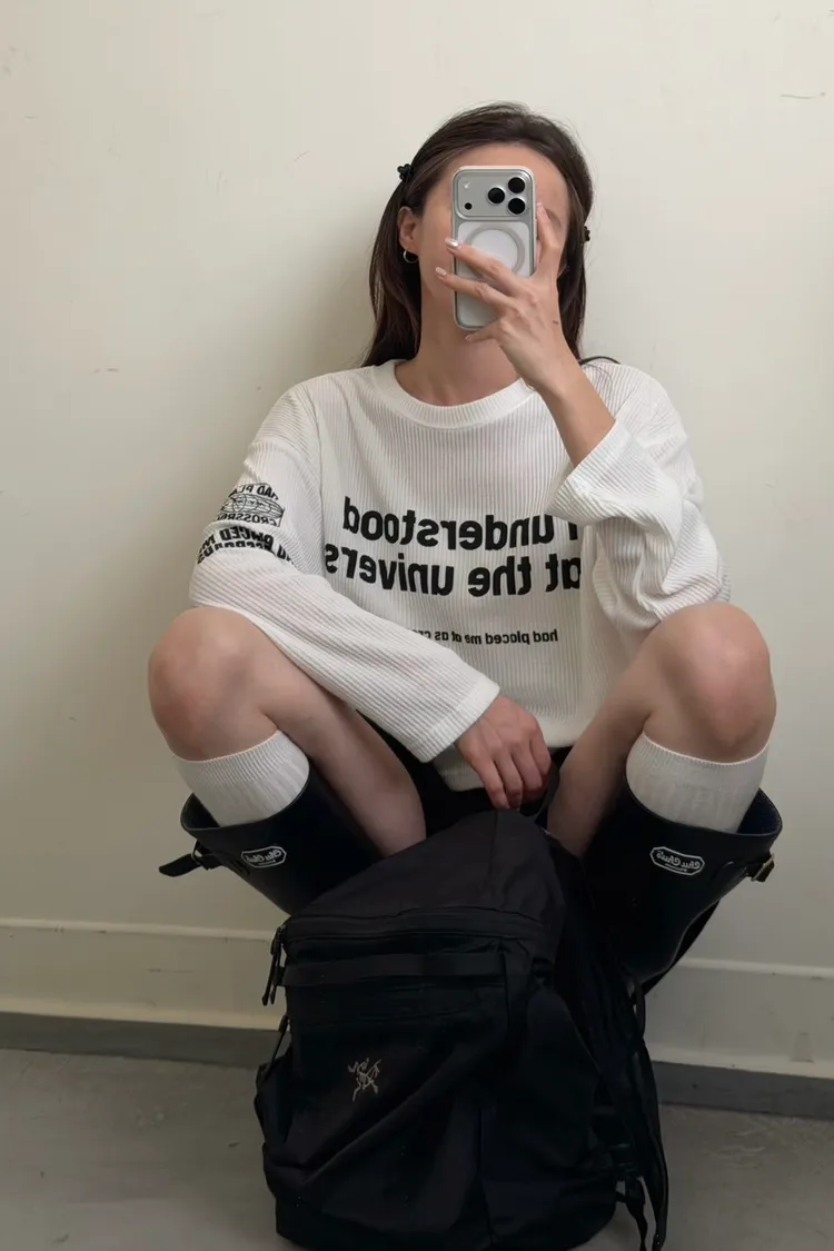 KOREA 白色 坑紋感字母長袖棉紗tee