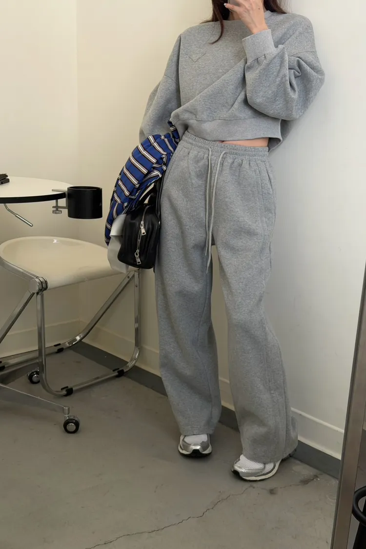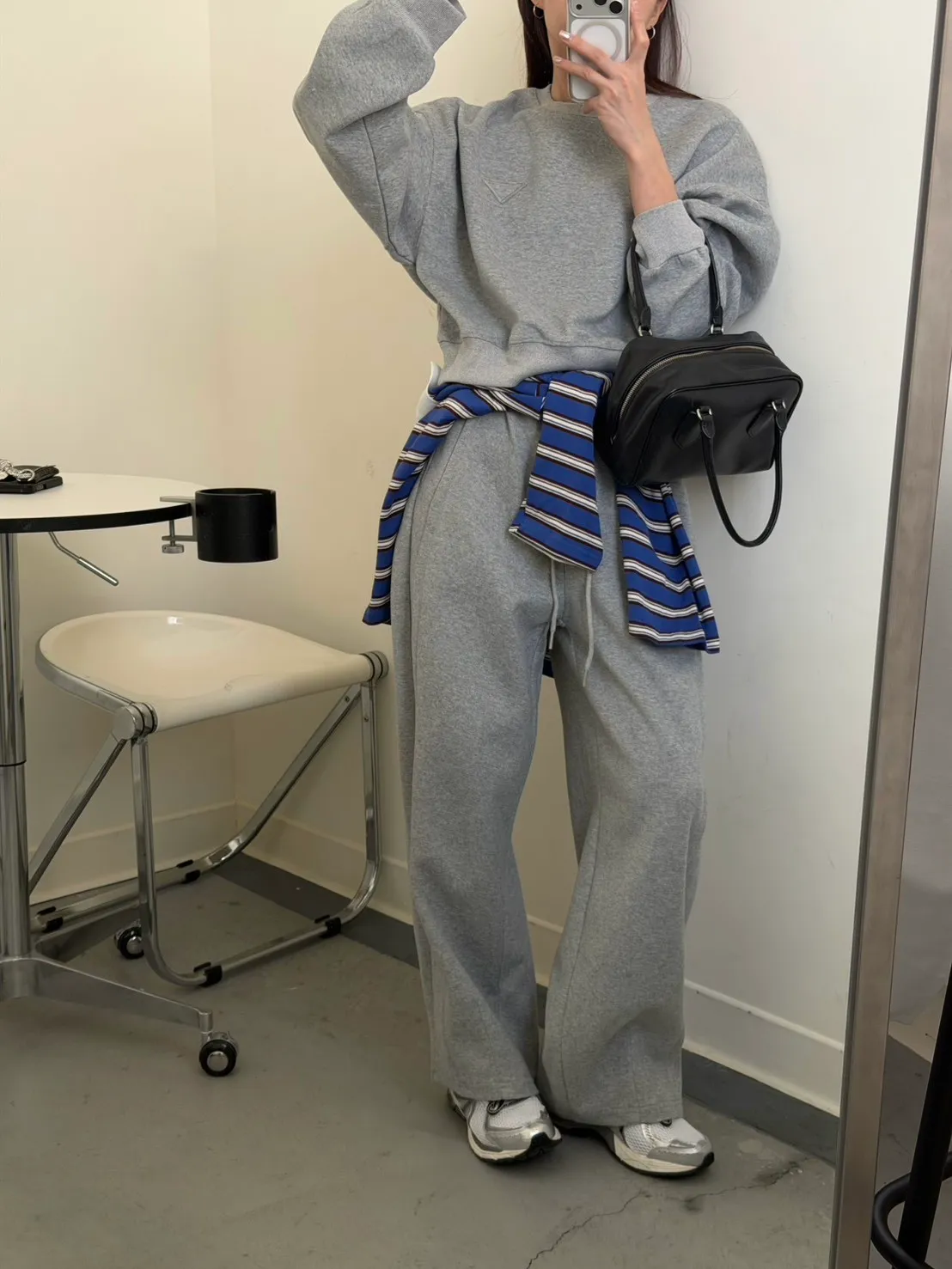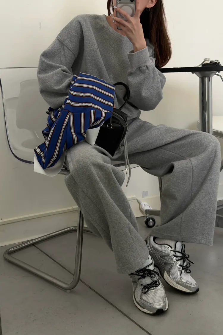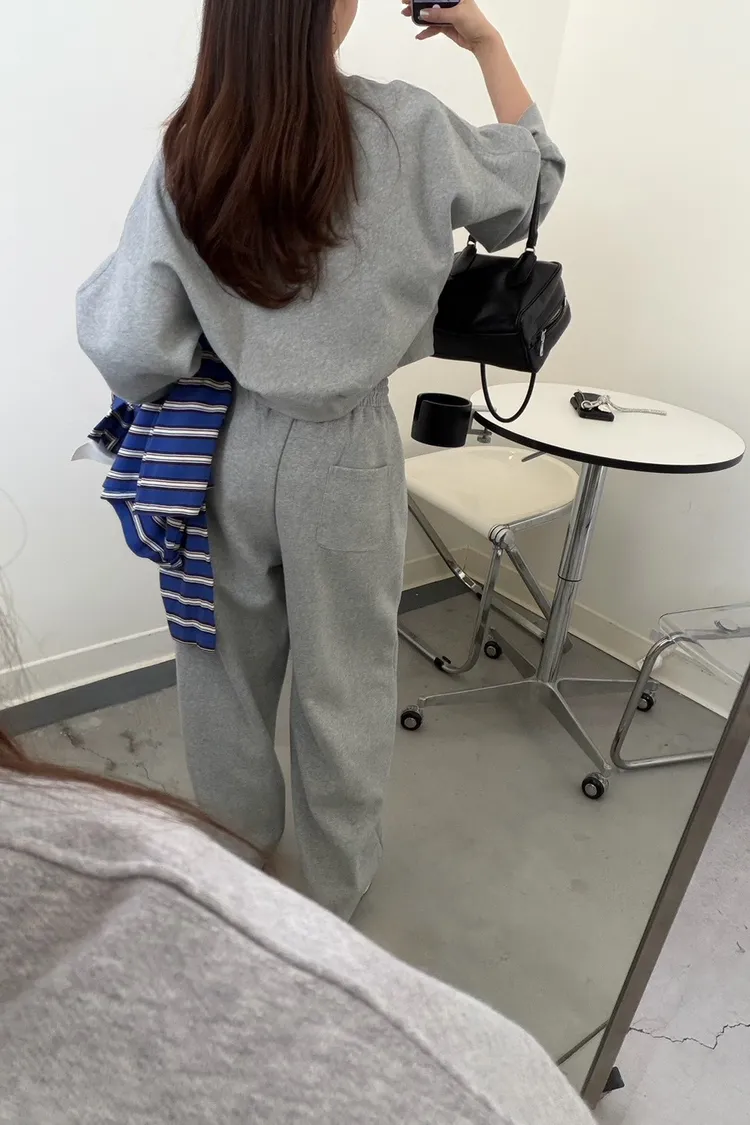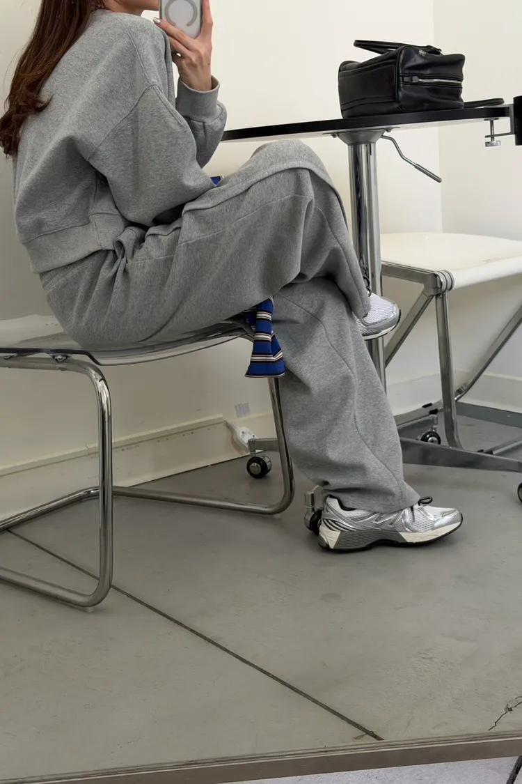 灰色 落肩澎袖高磅tee+壓線棉褲SET