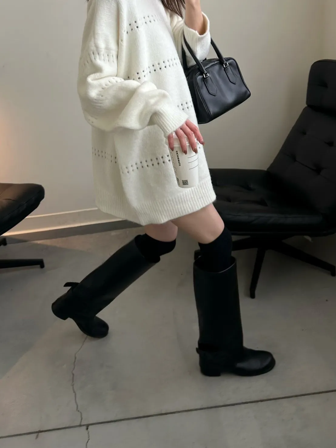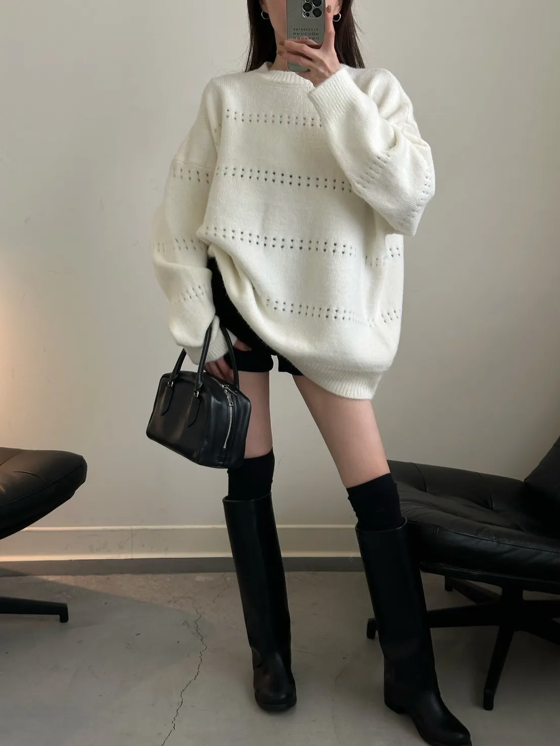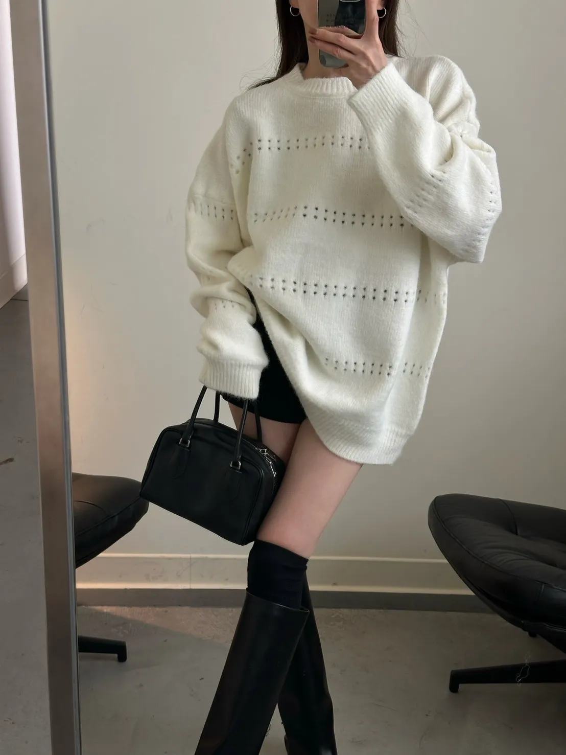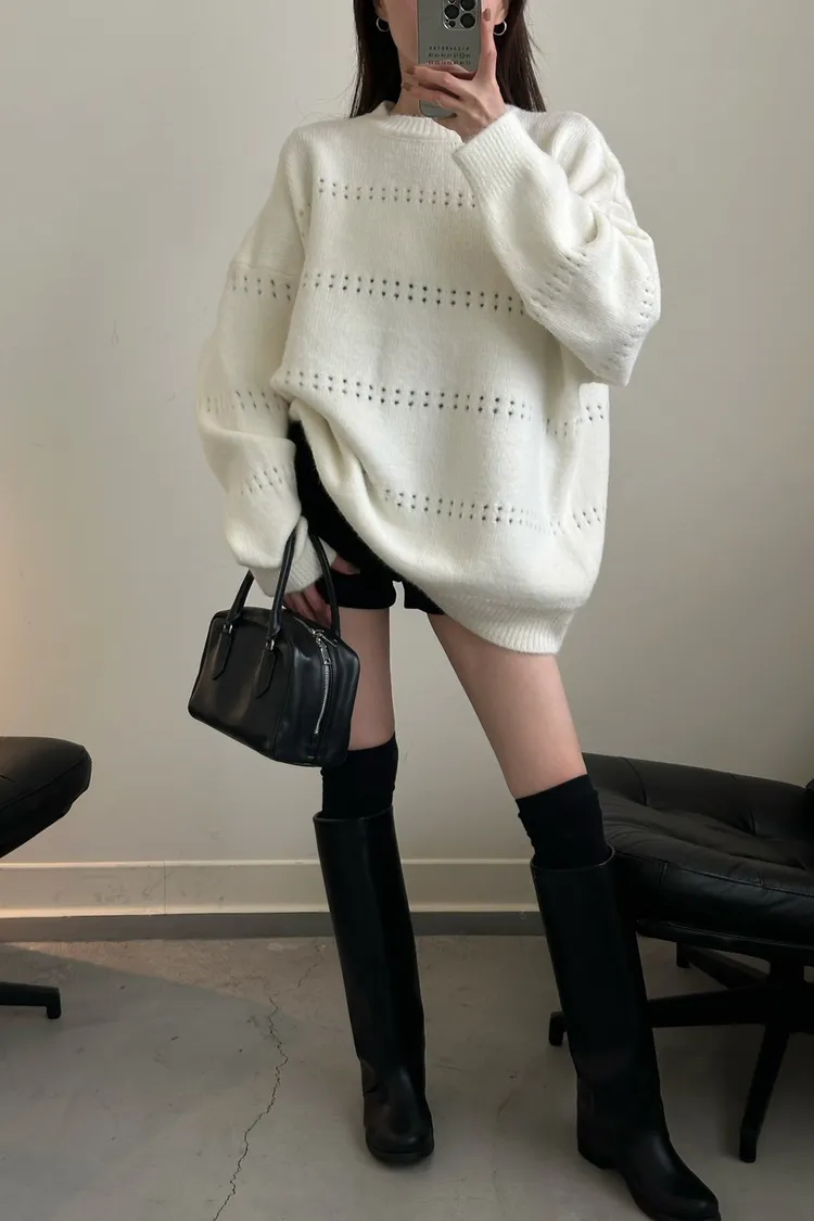 奶白色 超級愛!洞洞橫條軟綿針織毛衣