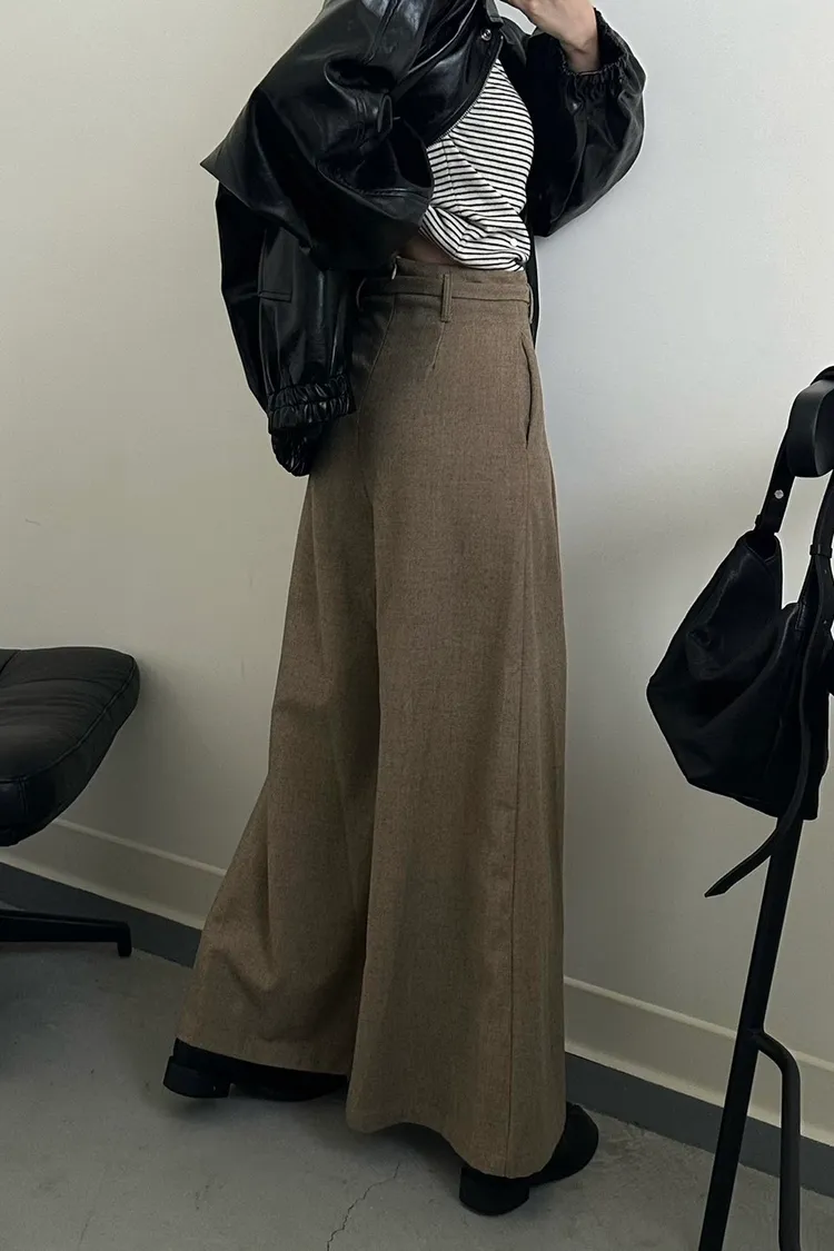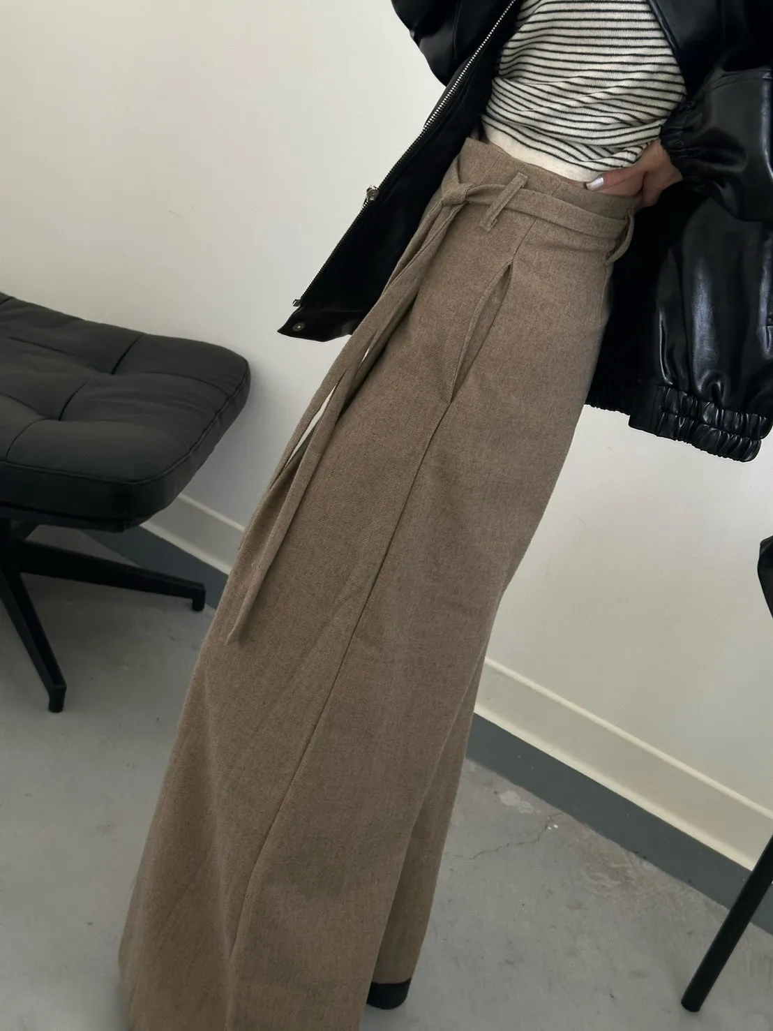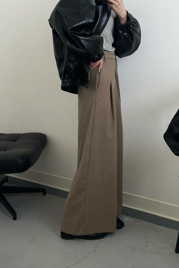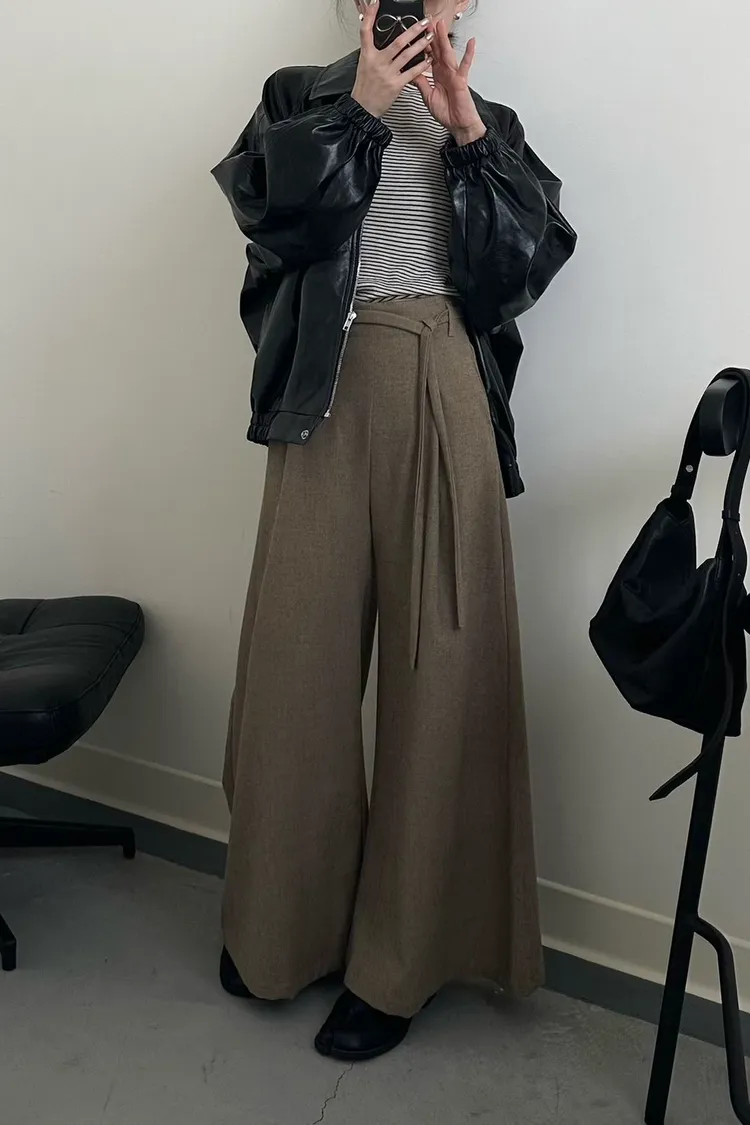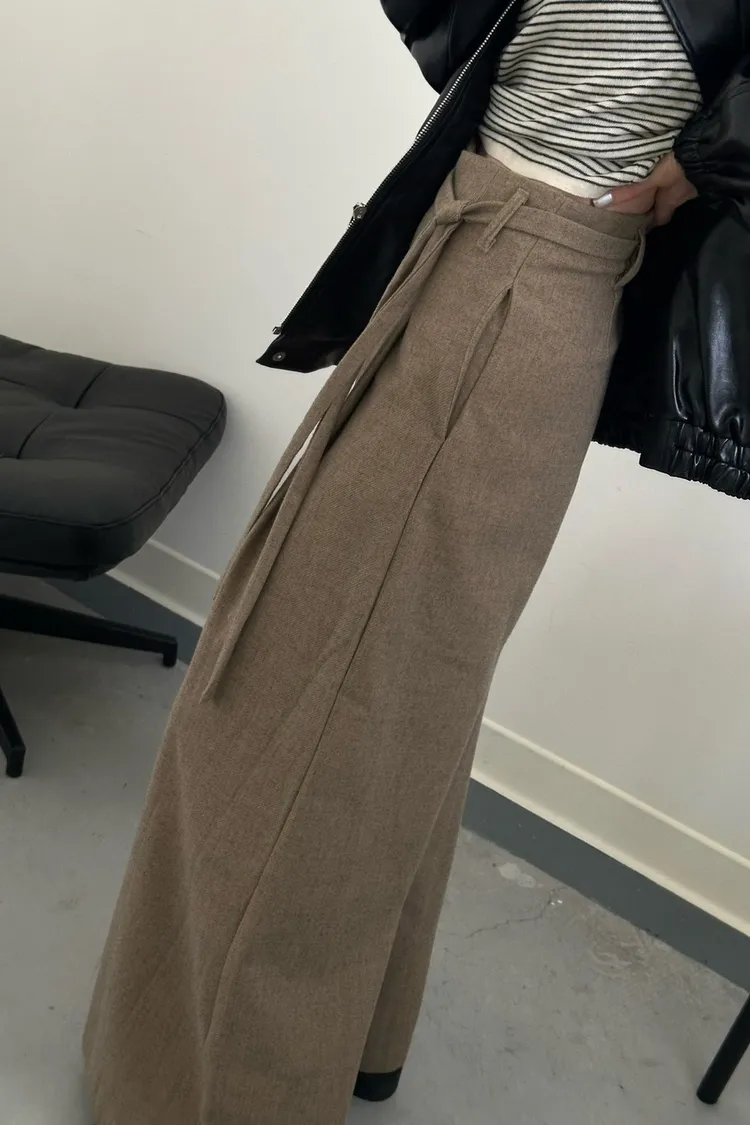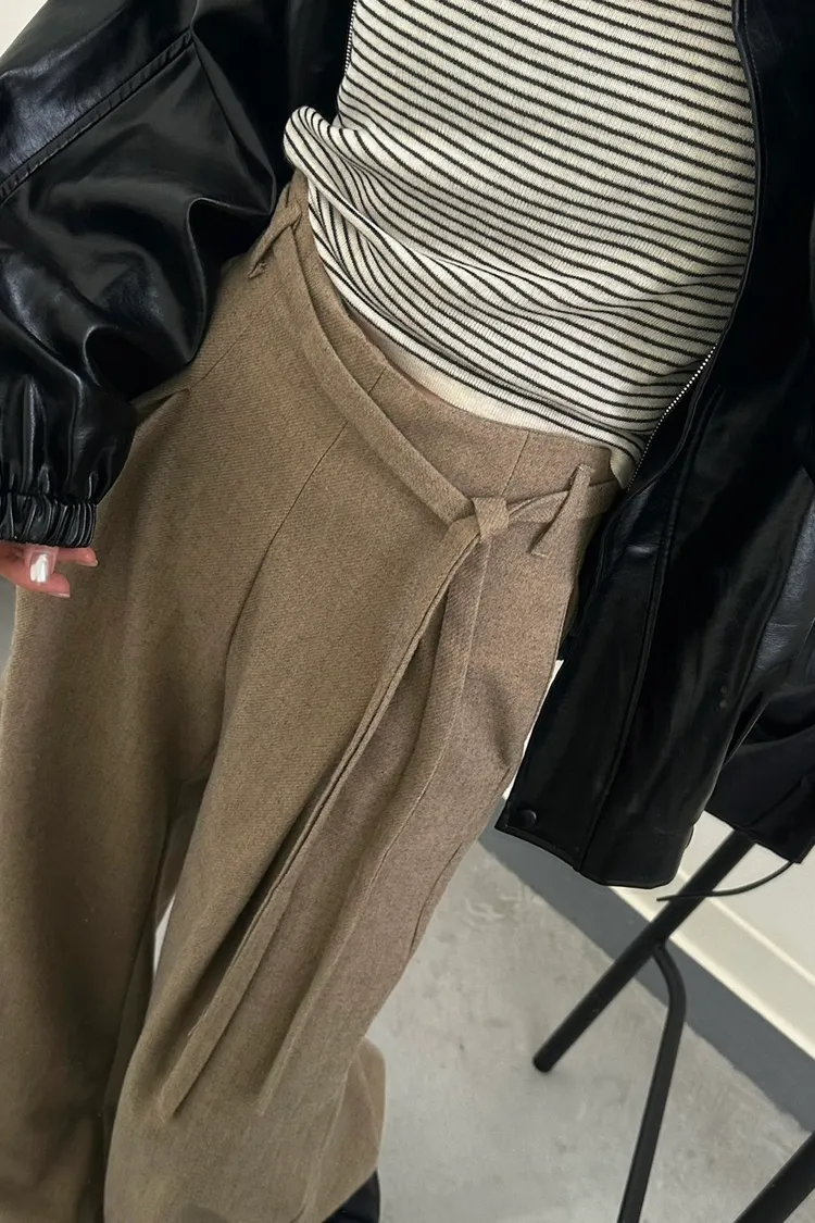 咖啡色 毛料腰綁線寬褲