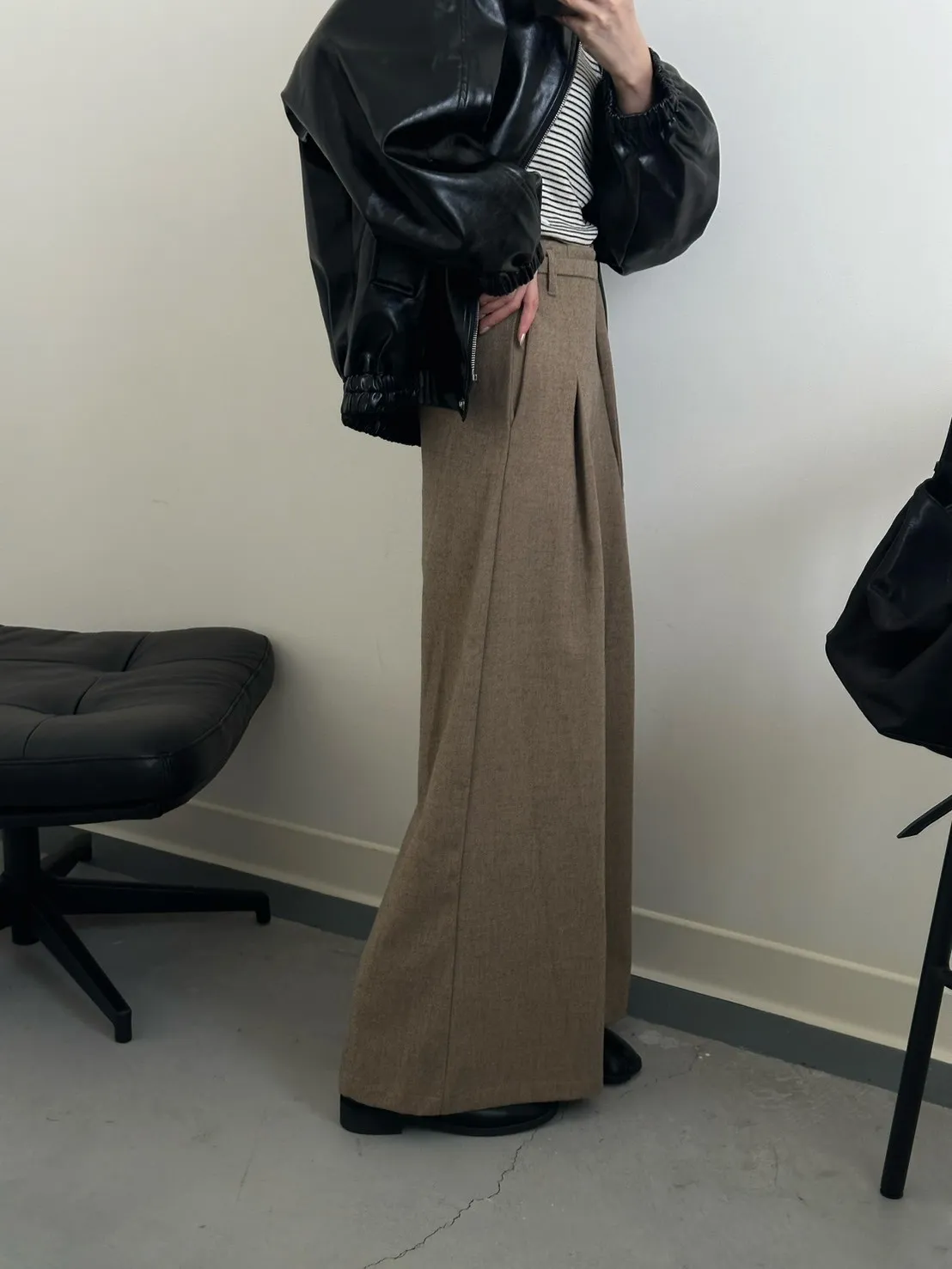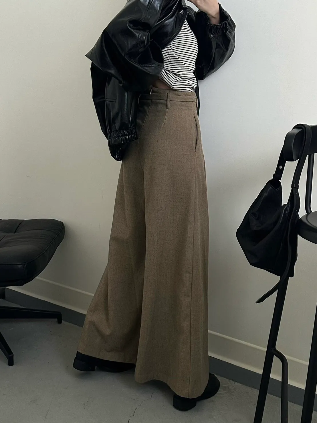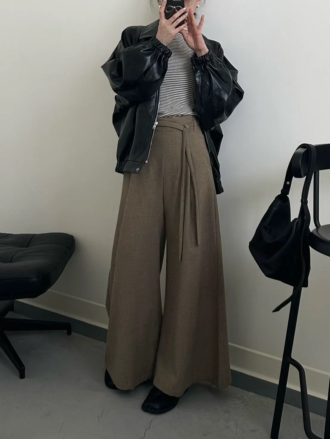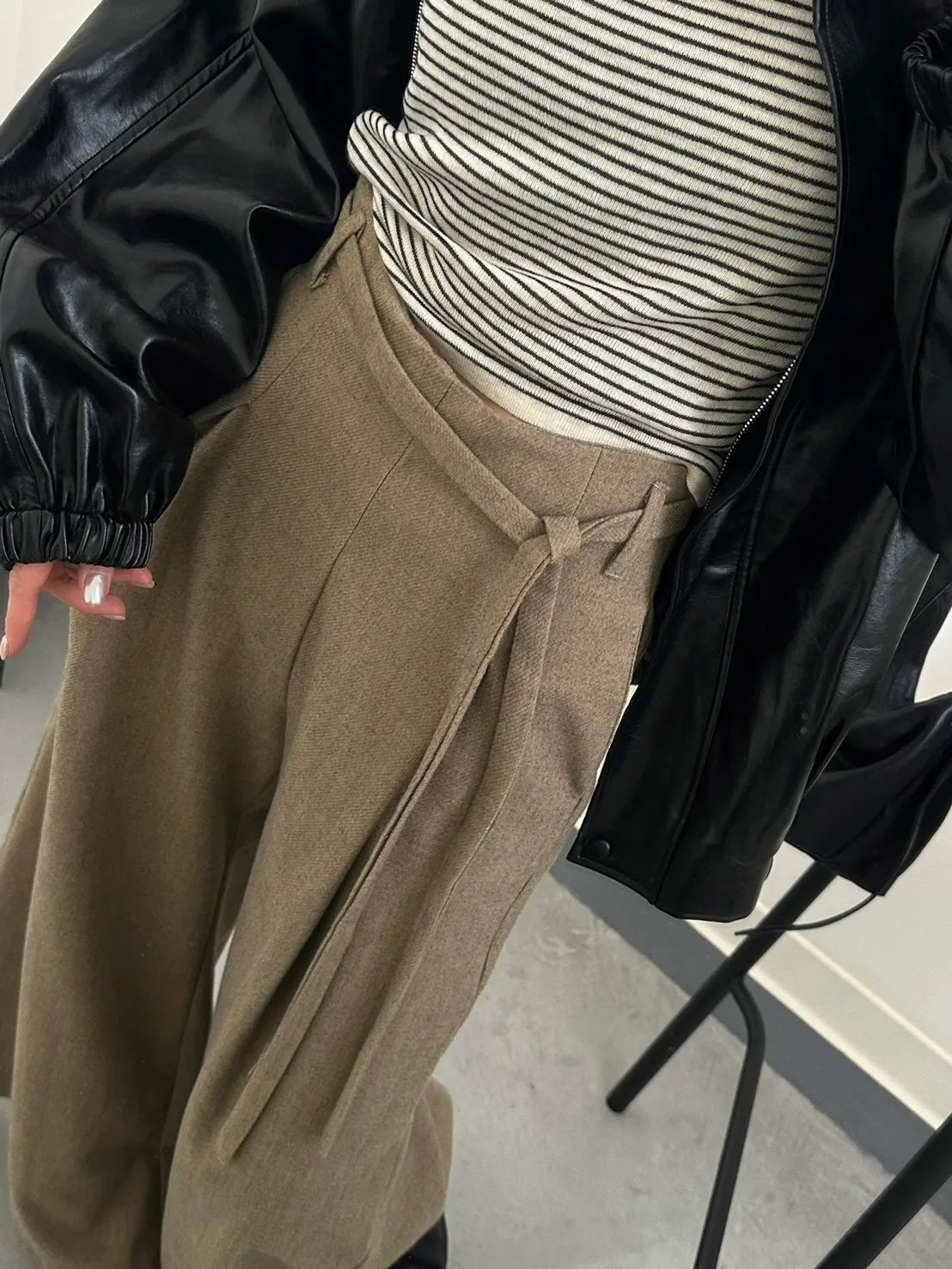 咖啡色 毛料腰綁線寬褲