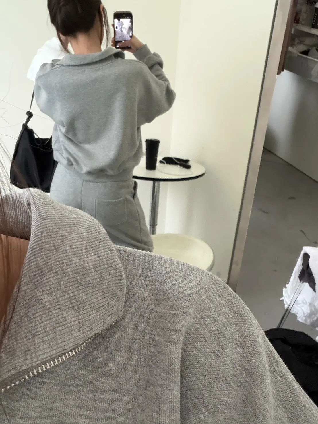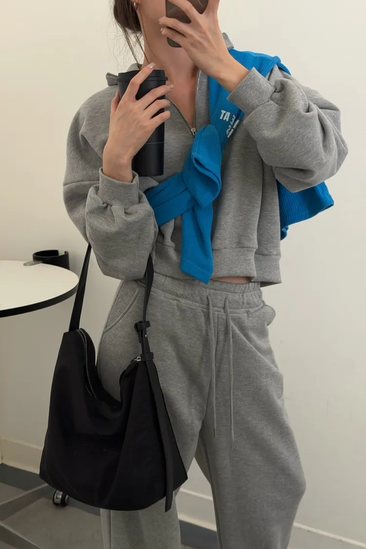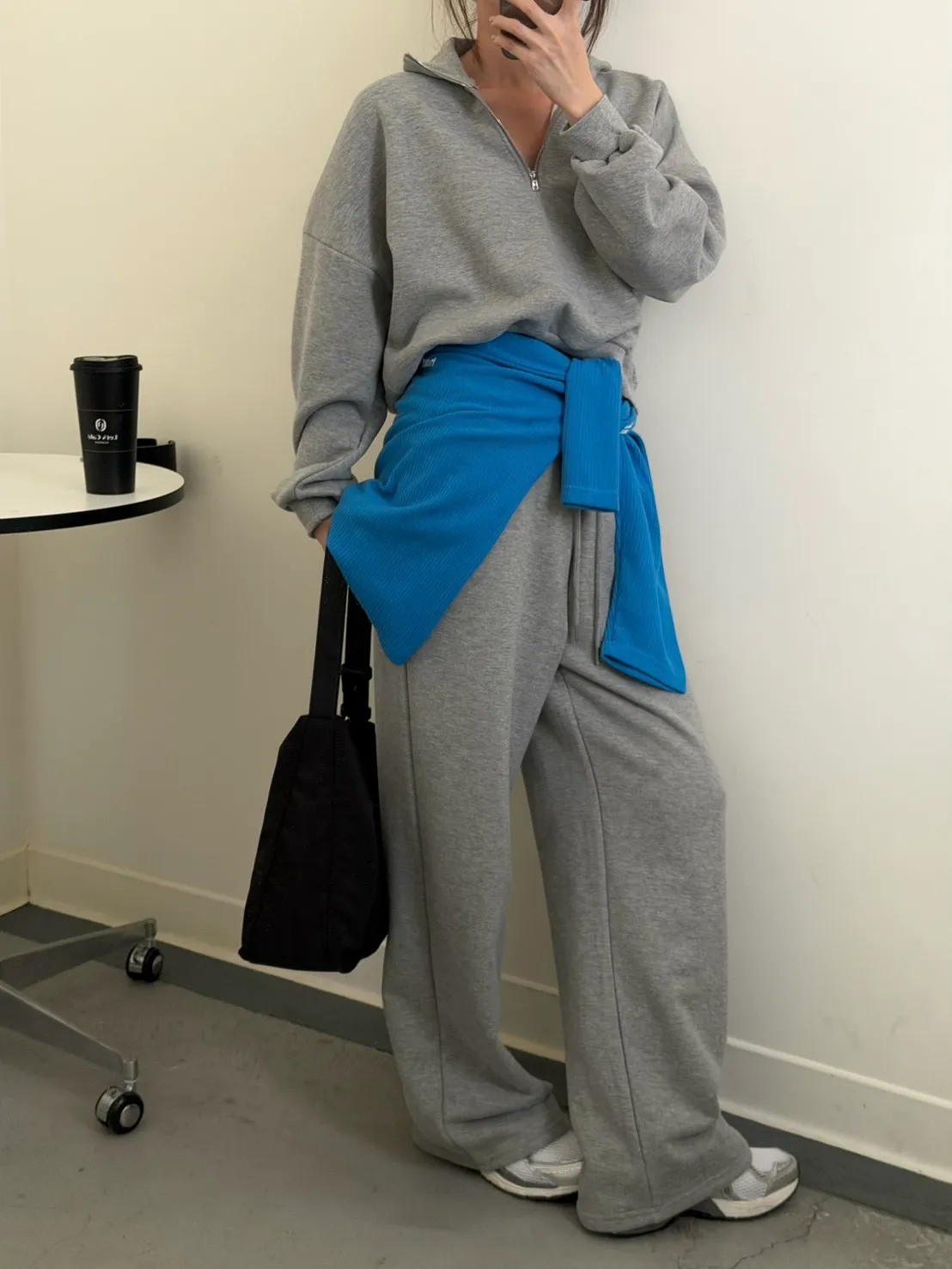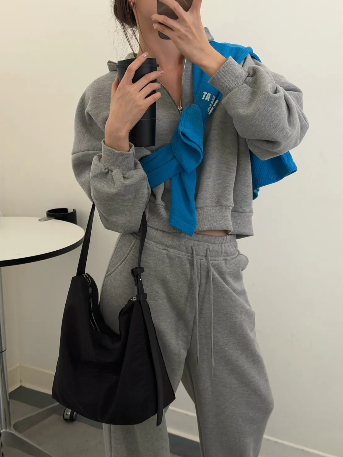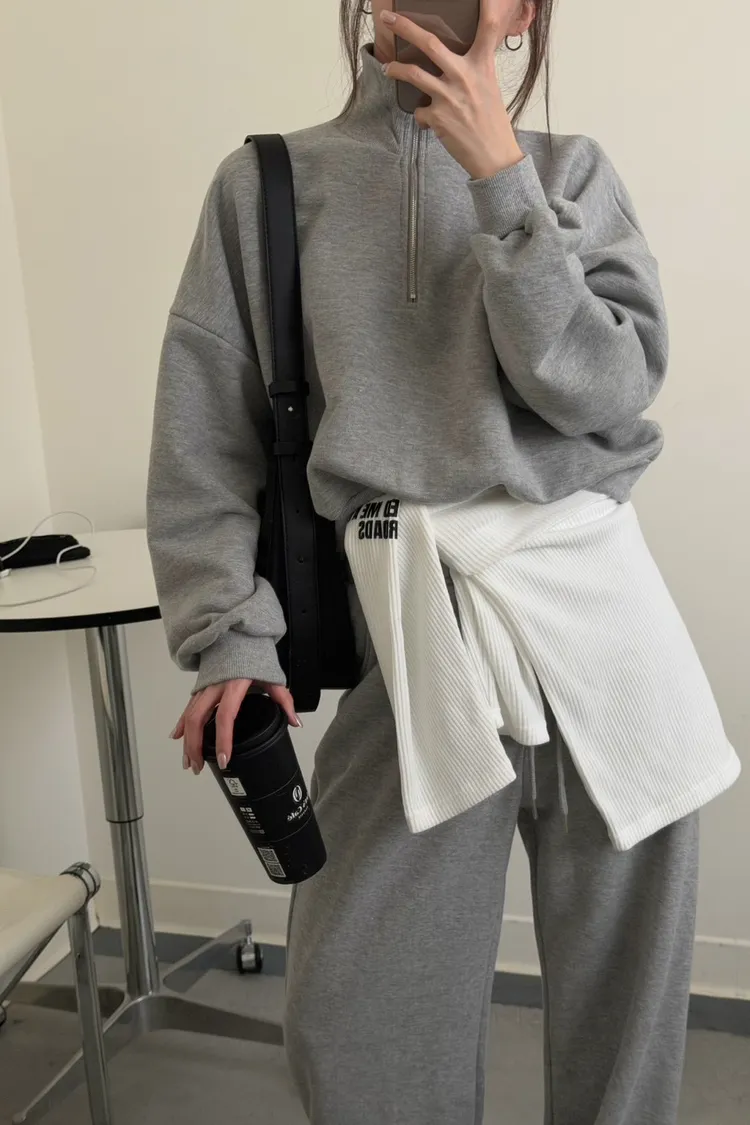 KOREA 灰色 拉鍊立領tee+長褲SET