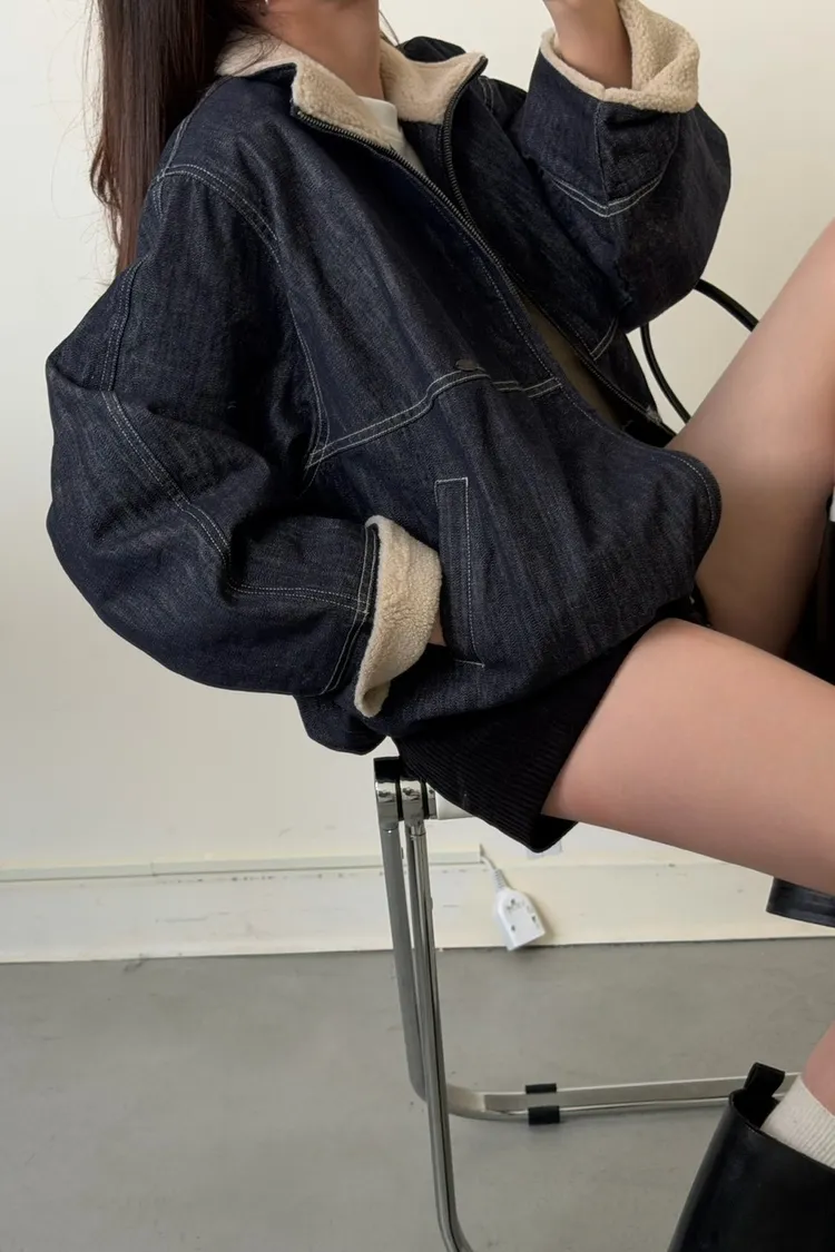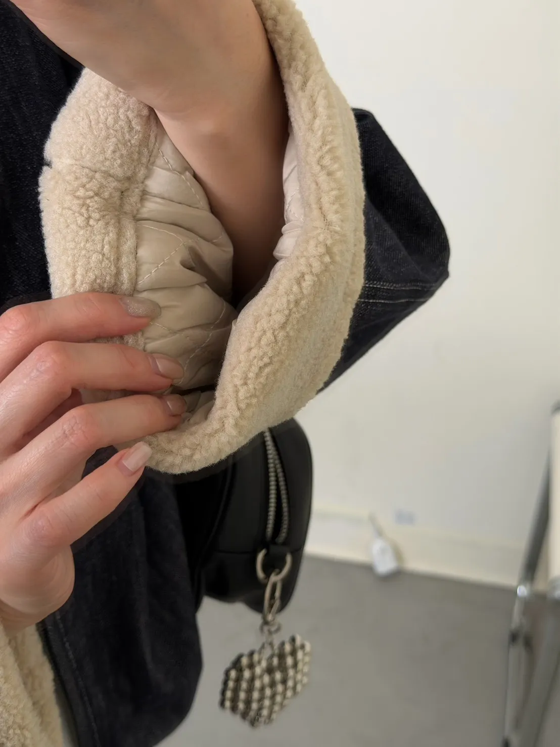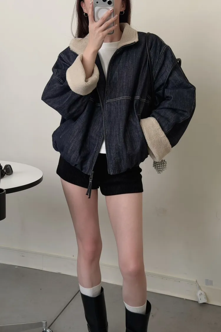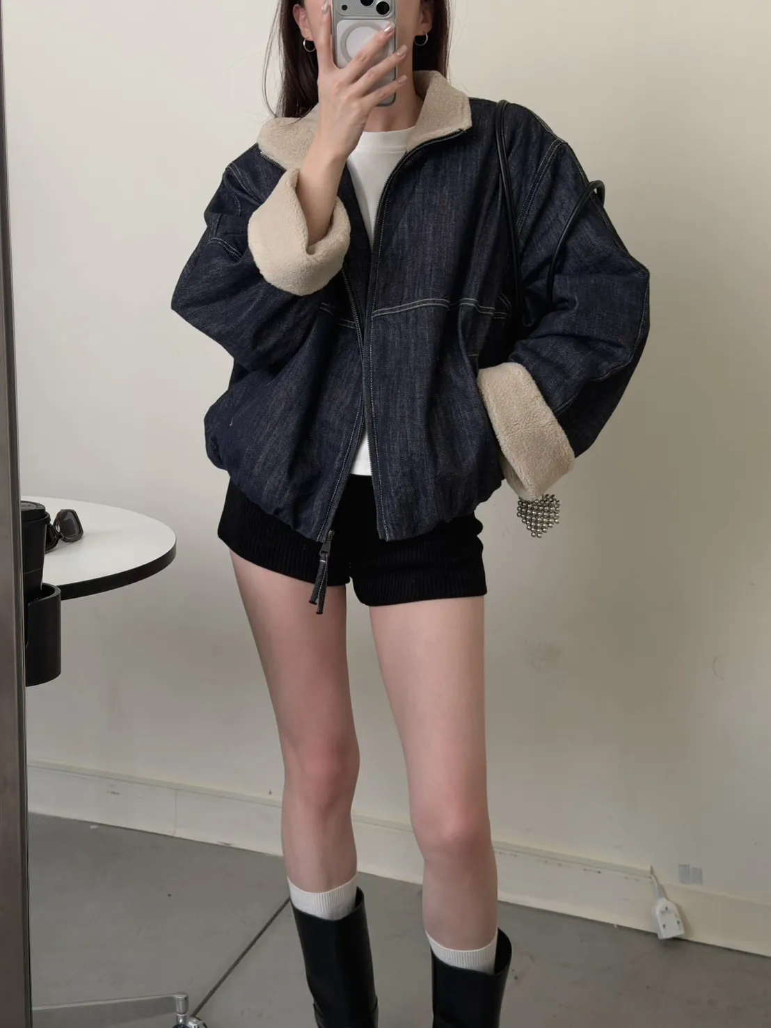 KOREA 深藍牛仔拼接柔軟羔羊外套