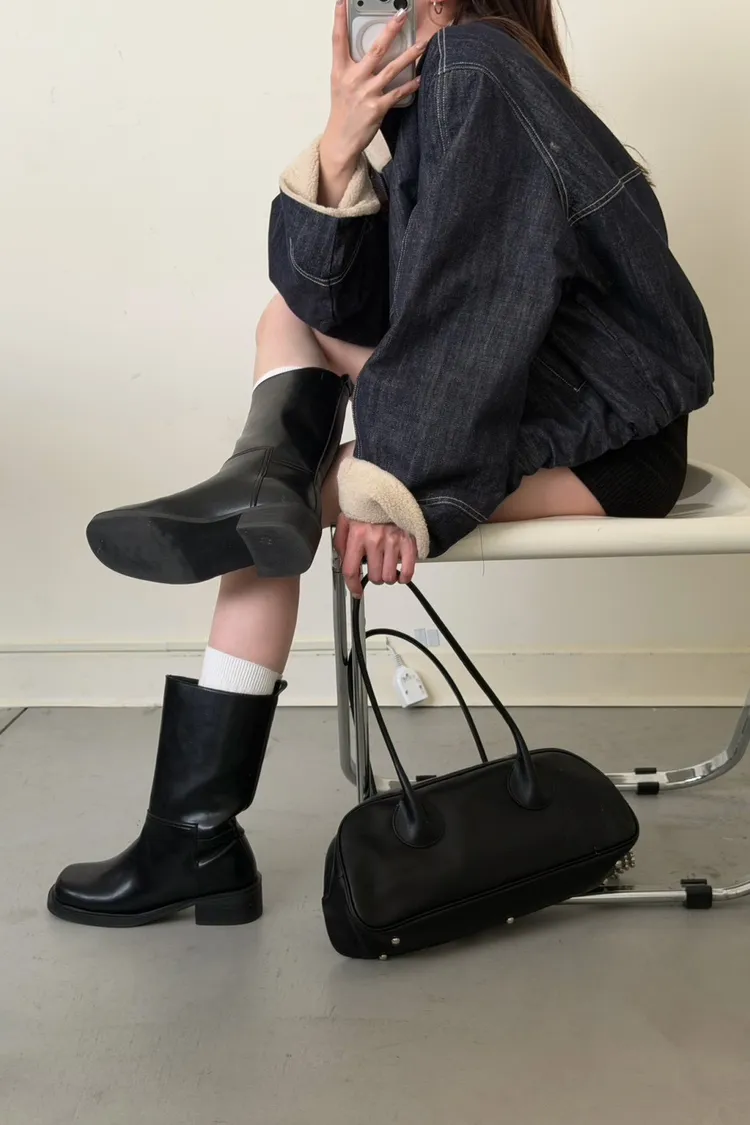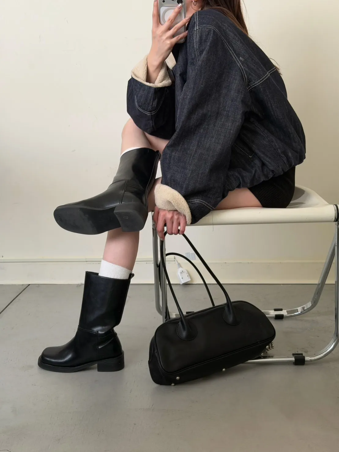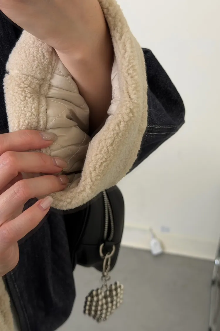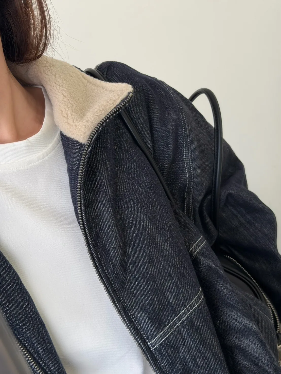 KOREA 深藍牛仔拼接柔軟羔羊外套