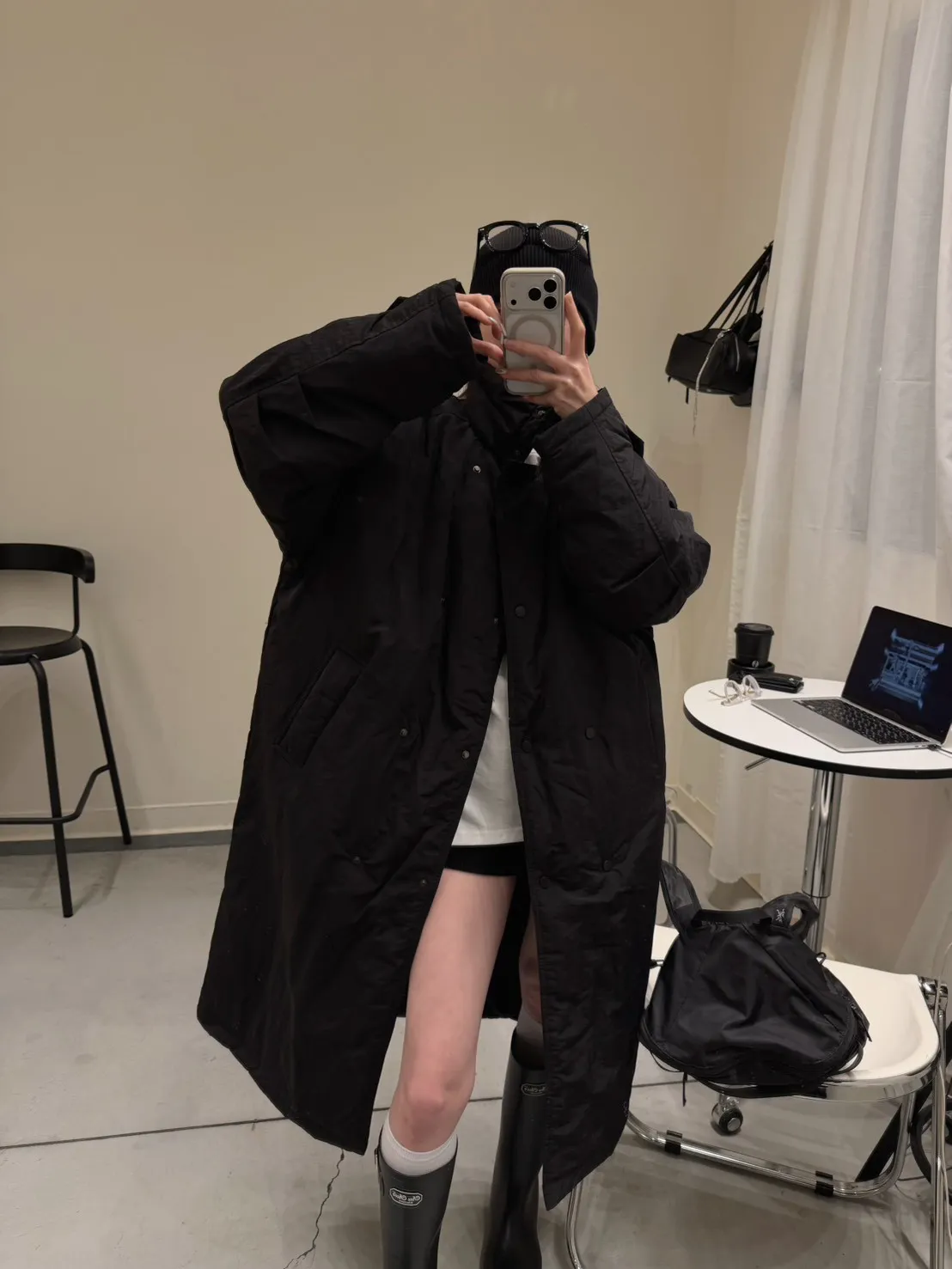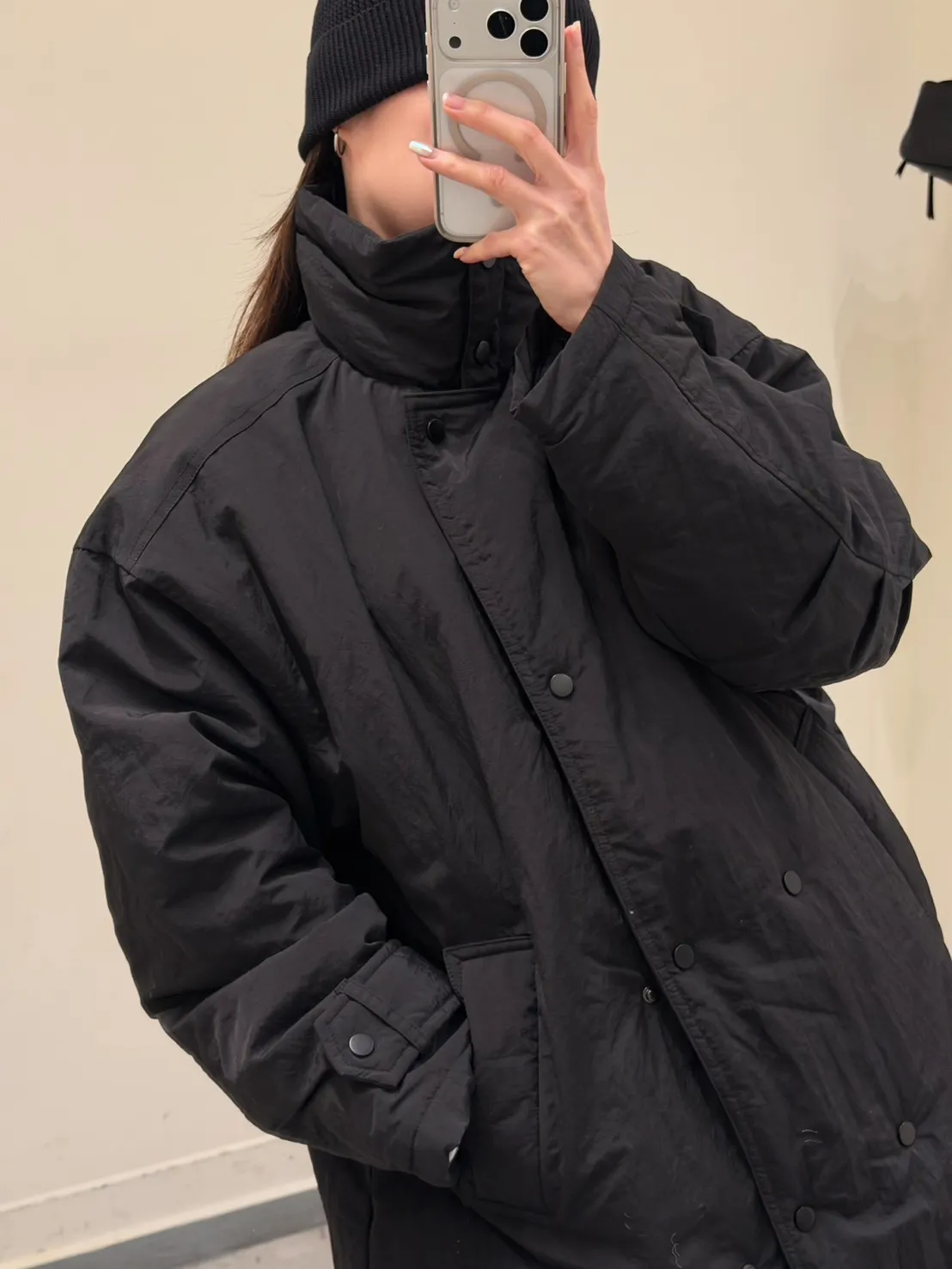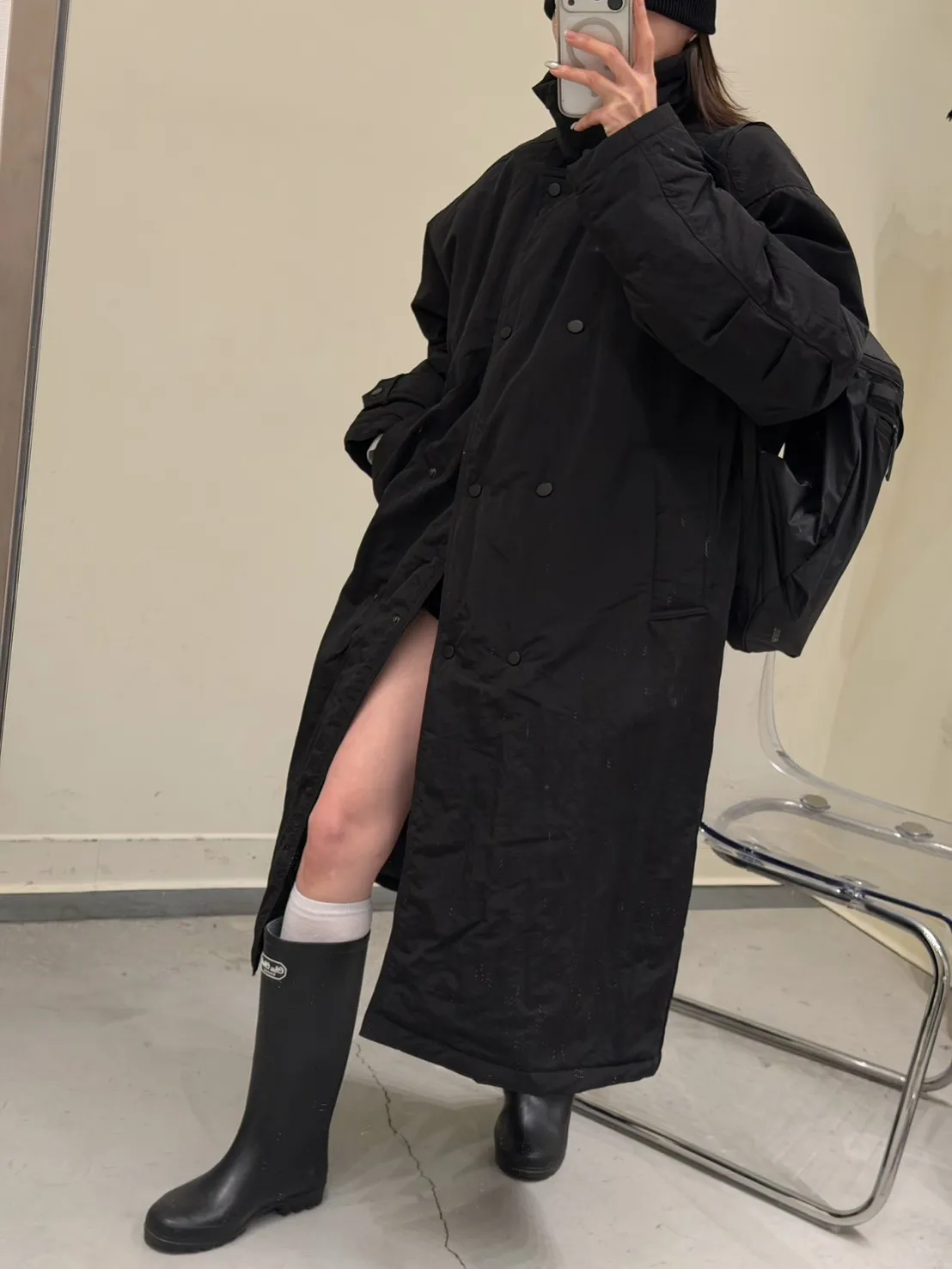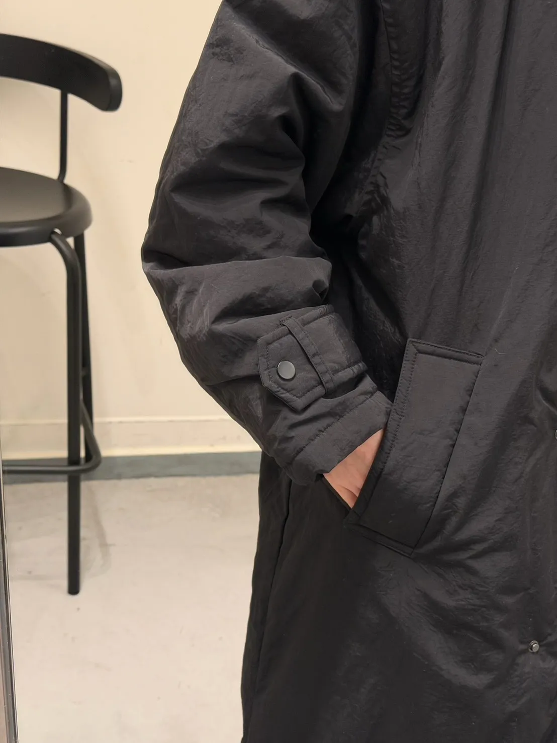 KOREA 黑色 立領長版鋪棉外套