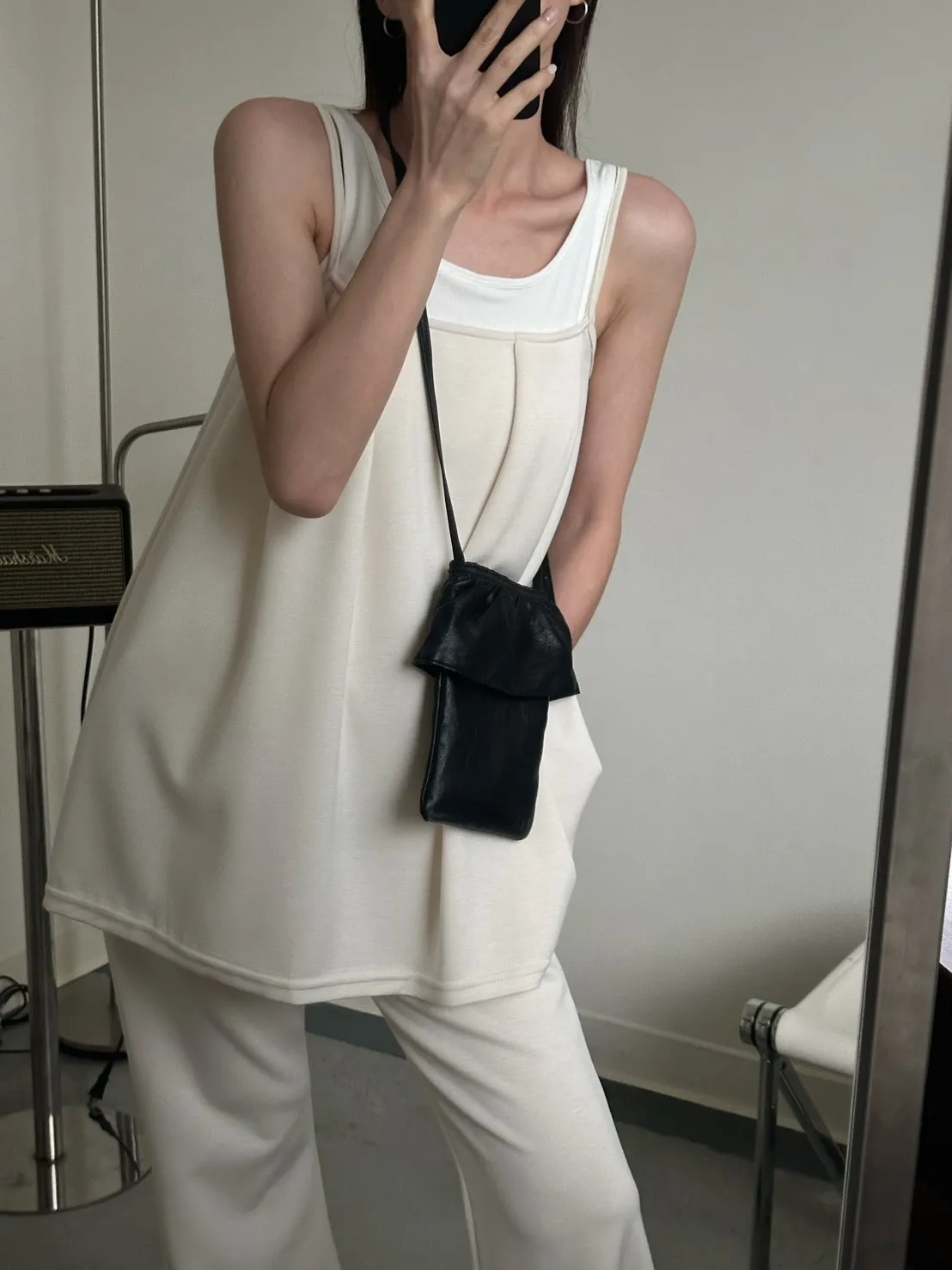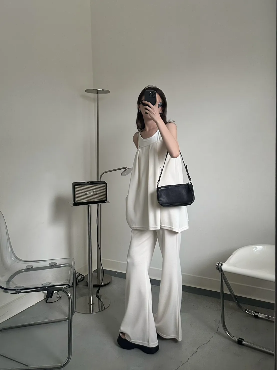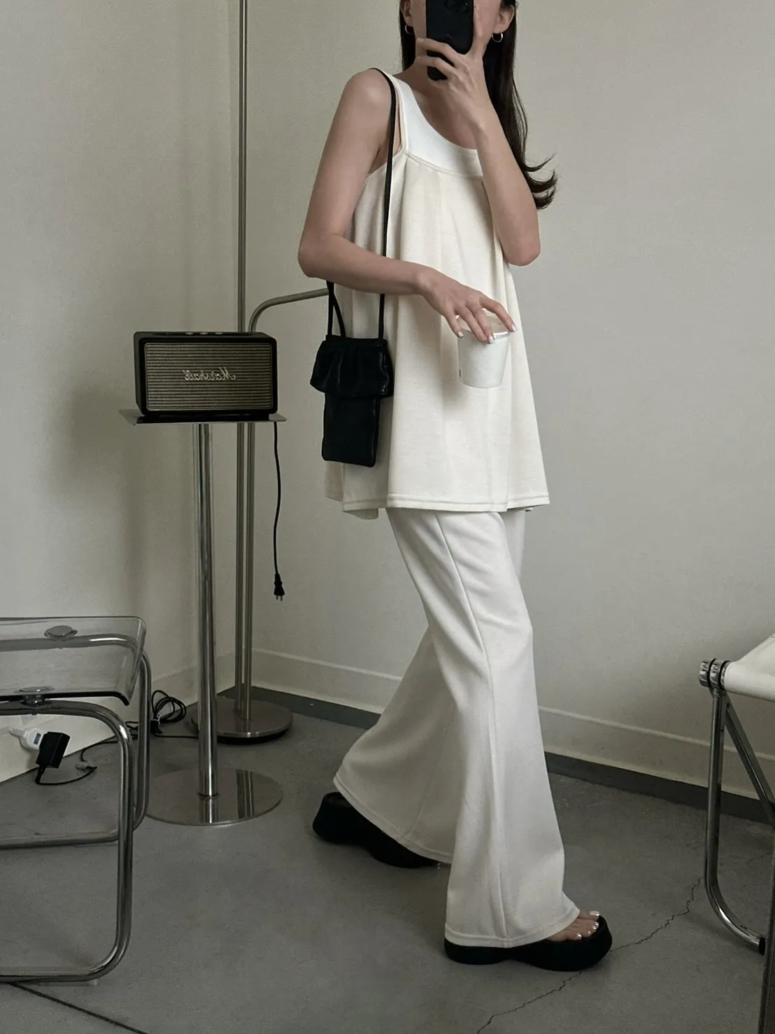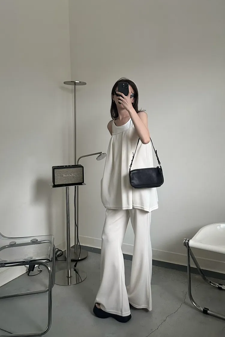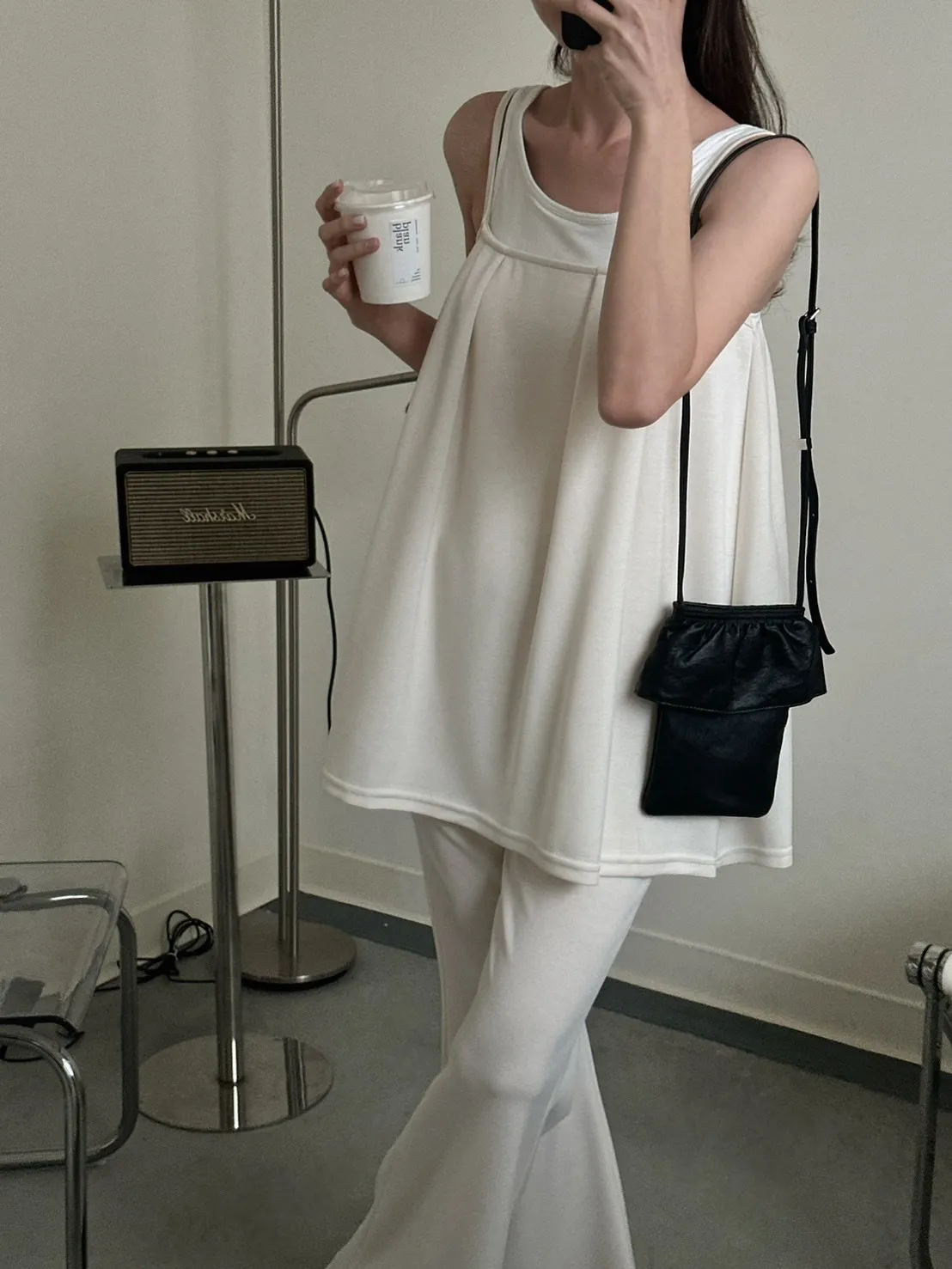 (現貨)奶白色 細肩壓褶太空涼感棉質背心+褲子SET
