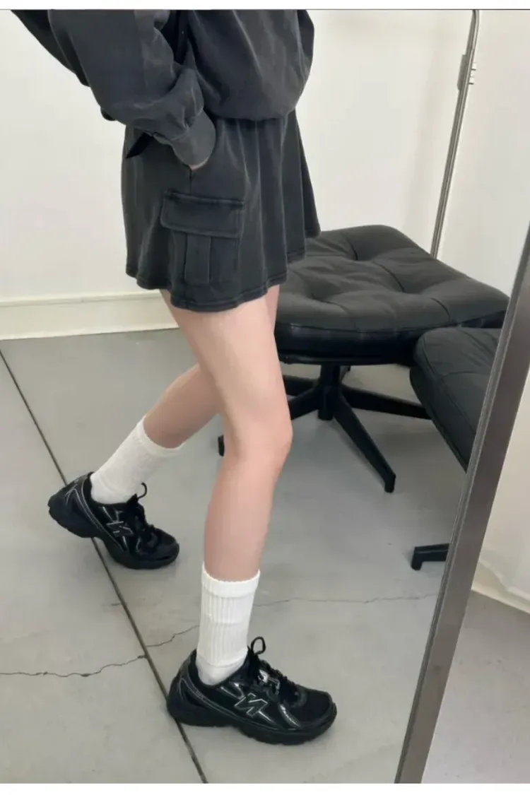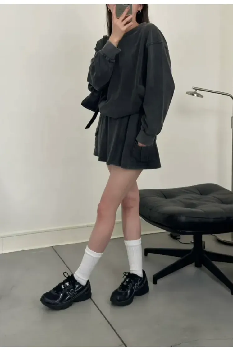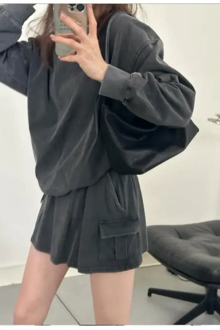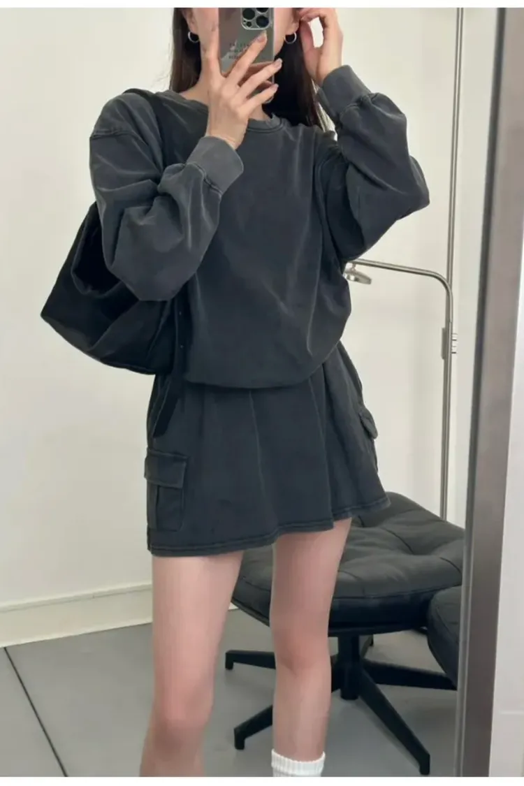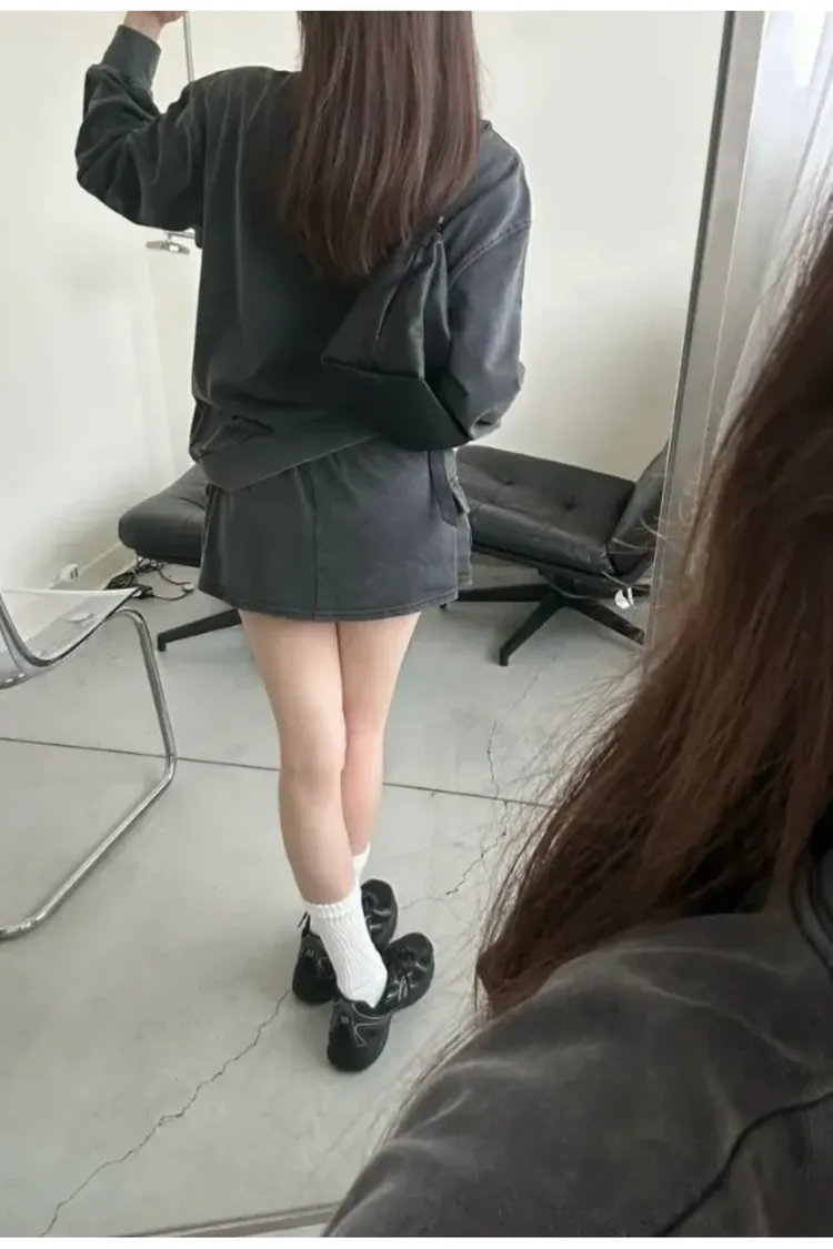 SALE (79) 洗舊灰色 上衣+褲裙SET (左胸接近腋下車縫線處小破損NG已縫補)